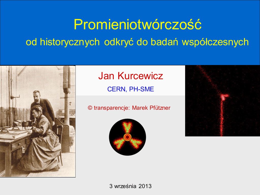Promieniotwórczość od historycznych odkryć do badań współczesnych Jan Kurcewicz CERN, PH-SME © transparencje: Marek Pfützner 3 września 2013 Przypadkowy początek W 1896 roku w Paryżu Antoine Henri Becquerel przypadkiem odkrył świat zupełnie nowych zjawisk fizycznych, gdy wywołał płytkę fotograficzną, na której leżał kawałek soli uranowej. 1903 – Nagroda Nobla z fizyki Nagroda Nobla z fizyki, 1903: „w uznaniu ich nadzwyczajnych osiągnięć uzyskanych dzięki wspólnym badaniom nad zjawiskiem promieniotwórczości odkrytym przez Profesora Henri Becquerela” 2011 – Rok Marii Skłodowskiej-Curie 2011 – Międzynarodowy Rok Chemii Nagroda Nobla z chemii, 1911: „w uznaniu jej zasług dla rozwoju chemii przez odkrycie pierwiastków radu i polonu, wydzielenie radu i badania właściwości i związków tego wyjątkowego pierwiastka” http://nobelprize.org/nobel_prizes/chemistry/laureates/1911/ Ernest Rutherford Wydzielił dwie składowe promieniowania: a – mało przenikliwe, o dodatnim ładunku słabo zaginane w polu magnetycznym b – bardziej przenikliwe, o ujemnym ładunku silnie zaginane przez pole magnetyczne Sformułował wykładnicze prawo spontanicznych przemian promieniotwórczych Nagroda Nobla z chemii, 1908: „za badania rozpadów pierwiastków i własności chemicznych substancji promieniotwórczych ” E. Rutherford (1871-1937) Rozpraszanie cząstek a Współpracownicy Rutherforda, H. Geiger i E. Marsden badali rozpraszanie cząstek a na cienkiej folii złota. W większości przypadków tory cząstek uginały się pod małymi kątami. Okazało się jednak, że czasem cząstka a rozprasza się do tyłu! Rutherford: "To było chyba najbardziej niewiarygodne zdarzenie w moim życiu. To tak, jakby pocisk artyleryjski wielkiego kalibru, wystrzelony w kierunku cienkiej kartki papieru, odbił się od niej i powrócił do strzelającego”. Odkrycie jądra atomowego Praktycznie cała masa atomu skupiona jest w bardzo małym centralnym punkcie nazwanym jądrem atomowym Philosophical Magazine, May 1911, ser.6, xxi, pp.669-88 Budowa atomu Składniki : Jądro atomowe Powłoka elektronowa proton (q = +1) neutron (q = 0) elektron (q = -1) Przykłady jąder atomowych : - wodór (1 proton) - hel (2 protony + 2 neutrony) = cząstka a +6 - węgiel (6 protonów + 6 neutronów) : 12C izotopy węgiel - węgiel (6 protonów + 7 neutronów) : 13C Hierarchiczna budowa materii Kryształ 10-9 m = 1 nm Atom 10-10 m = 1 Å 10-14 Jądro m = 10 fm Nukleon (proton, neutron) 10-15 m = 1 fm Kwarki, elektrony elementarne ? punktowe ? Nuklidy Nuklid (elektrycznie obojętny atom) : Z protonów + N neutronów + Z elektronów Liczba Z decyduje o własnościach chemicznych pierwiastki chemiczne Różne liczby N izotopy Mapa nuklidów izotopy węgla: 12C, 13C Z N Z Nn N liczba protonów, Z Symbol nuklidu 5 hel wodór 1 1 5 liczba neutronów, N 9 Nuklidy trwałe 287 nuklidów, w tym liczba protonów, Z 83 pierwiastki od wodoru (Z=1) do uranu (Z=92) liczba neutronów, N ? Nuklidy promieniotwórcze 238U 4.5 mld lat uran protoaktyn 226Ra tor 1600 lat rad 214 Po 218 Po 160 ms radon 3 min. przemiana a polon przemiana b np bizmut ołów 125 130 135 liczba neutronów N 140 145 Wszystkie nuklidy Rozszczepienie Emisja a Z = 82 liczba protonów Z Przemiana b+ Z XN Z-2YN-2 + a Y+Z N = 126 Przewidywany obszar nuklidów związanych Z = 50 p n + e+ + ne N = 82 Przemiana b- WE –a N = 50 n p + e- + n¯e Z=8 N = 28 N = 20 N=8 trwałe – b- Z = 20 Z=2 – nuklidy – b+ / Z = 28 N=2 Z XN liczba neutronów N – rozszczepienie Jądrowa „dolina” Masa nuklidu Przemiany b jąder Zbiór nuklidów o tej samej liczbie nukleonów (izobary) 45 23 Masa nuklidu V22 A = 45 b b 45 22 Ti 23 b 45 21 b 45 20 45 19 Ca 25 Sc 24 Masa(45Ti) > Masa(45Sc) W przemianie 45Ti 45Sc może wydzielić się energia: E = DM c2 Teoria względności w działaniu! K 26 Przemiany b – oddziaływania słabe proton ne neutron e ne neutron e ne później e wcześniej neutron Przemiana b neutronu M(n) > M(p) proton Przemiana b protonu proton Wychwyt elektronu Stany wzbudzone – atom Atom: elektrony mogą znajdować się w stanach (orbitach) o różnych energiach. Przejścia między stanami związane są z emisją (lub absorpcją) promieniowania elektromagnetycznego (fotonów). W zależności od różnicy energii między stanami, możemy mieć promieniowanie X, UV, widzialne lub podczerwone Stany wzbudzone – jądro Jądro: sytuacja jest analogiczna – protony i neutrony mogą poruszać się na różnych orbitalach o różnych energiach. Przejścia między tymi stanami także związane są z emisją (lub absorpcją) promieniowania Energia [MeV] elektromagnetycznego. Nosi ono nazwę promieniowania g. g2 g3 stany wzbudzone g1 stan podstawowy Promieniowanie g – oddziaływanie elektromagnetyczne Promieniowanie g często towarzyszy przemianom b 45 23 V22 b b 45 22 Ti 23 b 45 21 b Sc 24 45 20 Ca 25 45 19 K 26 Przemiana a – oddziaływanie silne Cząstka a to jądro helu: a 42 He 2 T1/2 = 3.8 d a masa c2 T1/2 = 3 min a 222 86 Rn Ea = 5.5 MeV 218 84 Po a Ea = 6.0 MeV 214 82 Pb 2a Ea DM c2 Ea = 5 MeV prędkość v = 0.05 c = 15000 km/s ! Statystyka Instytut Radowy w Paryżu Każdy atom radu spontanicznie wyrzuca cząstkę a i powstaje atom radonu. Okres półrozpadu (czas połowicznego zaniku) Ra = 1600 lat. 1 atom Ra : czekamy 1600 lat szansa na rozpad a = ½ czekamy 1 sek. szansa 1/100.000.000.000 = 1/10 11 szansa trafienia szóstki w TotoLotku 1/107 Ok. 1 cząstka a/sek. Kartka z dziennika pomiarowego była zabrudzona radem i jest ciągle radioaktywna! na kartce jest ok. 10 11 atomów Ra - dla fizyków to dużo, - ale dla chemików bardzo mało : 1/(31010) g = 1/30.000.000.000 g. Zagadka okresów półrozpadu a 238U : Ea = 4.2 MeV, T1/2 = 4.5 mld lat 222Rn : Ea = 5.5 MeV, T1/2 = 3.8 dni 214Po : Ea = 7.7 MeV, T1/2 = 164 ms Dlaczego okresy półrozpadu tak bardzo się różnią ? Zrozumienie zależności półokresu rozpadu od energii w