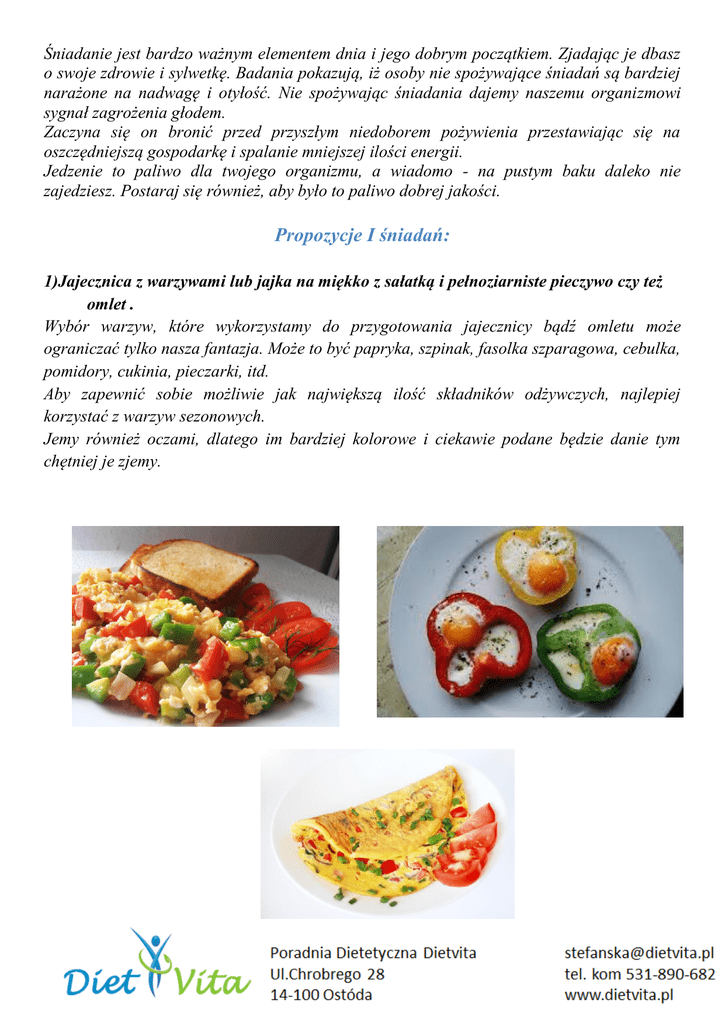 Śniadanie jest bardzo ważnym elementem dnia i jego dobrym początkiem. Zjadając je dbasz o swoje zdrowie i sylwetkę. Badania pokazują, iż osoby nie spożywające śniadań są bardziej narażone na nadwagę i otyłość. Nie spożywając śniadania dajemy naszemu organizmowi sygnał zagrożenia głodem. Zaczyna się on bronić przed przyszłym niedoborem pożywienia przestawiając się na oszczędniejszą gospodarkę i spalanie mniejszej ilości energii. Jedzenie to paliwo dla twojego organizmu, a wiadomo - na pustym baku daleko nie zajedziesz. Postaraj się również, aby było to paliwo dobrej jakości. Propozycje I śniadań: 1)Jajecznica z warzywami lub jajka na miękko z sałatką i pełnoziarniste pieczywo czy też omlet . Wybór warzyw, które wykorzystamy do przygotowania jajecznicy bądź omletu może ograniczać tylko nasza fantazja. Może to być papryka, szpinak, fasolka szparagowa, cebulka, pomidory, cukinia, pieczarki, itd. Aby zapewnić sobie możliwie jak największą ilość składników odżywczych, najlepiej korzystać z warzyw sezonowych. Jemy również oczami, dlatego im bardziej kolorowe i ciekawie podane będzie danie tym chętniej je zjemy. Jajko zawiera wit. D wzmacniającą kości, wzrok , odporność, a także działającą antynowotworowo. Jest w nim zawarta lecytyna, która wzmacnia naszą pamięć, zmniejsza ryzyko Alzhejmera, a także wit. E zwana witaminą młodości oraz wit. z grupy B wpływające korzystnie na pracę układu nerwowego i metabolizm. Znajdziemy tu również foliany, żelazo, cynk, fosfor, jod oraz wit. A i karotenoidy jak zeaksantyna, luteina (mające istotny wpływ na prawidłowe funkcjonowanie narządu wzroku, zwłaszcza u dzieci i młodzieży coraz częściej spędzających czas przed ekranem komputera czy smartfona). 2) Płatki owsiane czy wielozbożowe lub kasza z mlekiem lub jogurtem, owocami i bakaliami Korzyści wynikające z regularnego spożywania płatków owsianych to: - spora dawka energii wystarczająca na długi czas. - obniżenie nadmiernego poziomu cholesterolu we krwi - przeciwdziałanie zaparciom poprzez poprawę perystaltyki jelit - przeciwdziałanie cukrzycy poprzez regulowanie poziomu cukru we krwi - wzmocnienie odporności immunologicznej - usuwanie wolnych rodników - zmniejszenie ryzyka zachorowania na raka jelita grubego - lepsza koncentracja i przyswajanie wiedzy ze świeżymi 3) Kanapki Kanapka z pełnoziarnistym pieczywem smarowana masłem lub margaryną miękką dobrej jakości ( o zawartości tł. tans mniejszych niż 1%) lub awokado z wędliną- najlepiej własnej roboty np. pieczony schab, pierś z kurczaka lub indyka, serem żółtym lub twarożkiem czy też pastą np. z ryby lub jajka, z dodatkiem warzyw np. kiszony ogórek, papryka, pomidor, sałata Pieczywo pełnoziarniste to źródło błonnika regulującego pracę jelit, wit. z grupy B odpowiadających za prawidłowy metabolizm, magnezu, który wspiera twój układ nerwowy oraz cynku podnoszącego odporność. Tutaj też mamy spore pole do popisu. Im bardziej kolorowe kanapki, tym bardziej zdrowe i zachęcające do schrupania. 4) Koktajle z jogurtu, kefiru bądź maślanki z owocami i warzywami z dodatkiem zarodków, otrąb, płatków. Świetnie sprawdzają się tutaj wydawałoby się nietypowe połączenia: np. banan z pietruszką lub szpinakiem czy jarmużem i kefirem lub jogurtem. Aby wzbogacić koktajl w cenne wartości odżywcze i błonnik można dodać zarodki pszenne i otręby lub płatki, w cenne tłuszcze, wystarczy dodać łyżeczkę zmielonego siemienia lnianego bądź awokado. Propozycje II śniadań: 1)Kanapki z pełnoziarnistym pieczywem 2)Owoce i warzywa a także sałatki z nich przygotowane to spora dawka witamin, składników mineralnych i błonnika- owoce cytrusowe stanowią źródło witaminy C, ale świetnym jej źródłem jest również np. natka pietruszki, papryka, brokuł czy pomidor. Witamina C dba o naszą odporność, zapewnia lepsze gojenie się ran, wspomaga syntezę kolagenu, wzmacnia naczynia krwionośne oraz wpływa na lepsze wchłanianie przez organizm żelaza. Owoce i warzywa o barwie pomarańczowej, czerwonej, żółtej i ciemnozielonej to dobre źródło beta-karotenu zapewniającego dobry wzrok i ładną cerę. Poza tym owoce i warzywa to skarbnica antyoksydantów, które neutralizują szkodliwe działanie wolnych rodników powodujących różne choroby m.in. raka. Zarówno owoce i warzywa (zwłaszcza ciemnozielone), jak i produkty pełnoziarniste to cenne źródło folianów, które są niezbędne do syntezy DNA, prawidłowego funkcjonowania układu krwiotwórczego i nerwowego. Zamiast słodyczy można zabrać do szkoły suszone owoce, które zawierają duże ilości błonnika, składników mineralnych, przeciwutleniaczy oraz witamin z grupy B. Mimo wszystko i tu zalecane są ograniczenia ze względu na to sporą zawartość cukrów prostych. 3)Kefir, jogurt lub maślanka to źródło wapnia potrzebnego do budowy mocnych kości i zębów, a także wpływającego na prawidłową pracę serca i mięśni oraz krzepliwość krwi. To również źródło korzystnych bakterii, które zasiedlają nasz układ pokarmowy i zapewniają zdrowie naszych jelit a także źródło białka, niezbędnego do wzrostu i rozwoju organizmu. 4) Orzechy i nasiona to źródło zdrowych tłuszczy np. orzechy włoskie zawierają kwasy omega- 3, które pozytywnie wpływają na nasz mózg i zdolność koncentracji (może nie bez przyczyny środek orzecha włoskiego przypomina wyglądem nasz mózg ), działają również przeciwzapalnie i antynowotworowo. Jak we wszystkim umiar jest wskazany, gdyż orzechy mogą powodować alergie. Pestki dyni to świetne źródło witaminy E nazywanej wit. młodości, a także magnezu i żelaza. Dobrym źródłem tej wit. są również migdały, pestki słonecznika, pistacje, sezam i awokado . Migdały to także dobre źródło magnezu, warto je chrupać, gdy dopada nas stres. Witamina E jest silnym anty