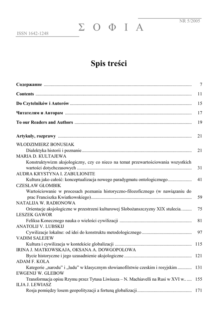 ISSN 1642-1248 Σ Ο Φ Ι Α NR 5/2005 Spis treści Cодержание ............................................................................................................................. 7 Contents .................................................................................................................................... 11 Do Czytelników i Autorów ....................................................................................................... 15 Читателям и Авторам ........................................................................................................... 17 To our Readers and Authors ................................................................................................... 19 Artykuły, rozprawy ................................................................................................................. 21 WŁODZIMIERZ BONUSIAK Dialektyka historii i poznanie ............................................................................................. MARIA D. КULTAJEWA Konstruktywizm aksjologiczny, czy co nieco na temat przewartościowania wszystkich wartości dotychczasowych ................................................................................................. АUDRA KRYSTYNA I. ZABULIONITE Kultura jako całość: konceptualizacja nowego paradygmatu ontologicznego .................... CZESŁAW GŁOMBIK Wartościowanie w procesach poznania historyczno-filozoficznego (w nawiązaniu do prac Franciszka Kwiatkowskiego) ..................................................................................... NATALIJA W. RADIONOWA Orientacje aksjologiczne w przestrzeni kulturowej Slobożanszczyzny ХIХ stulecia. ........ LESZEK GAWOR Feliksa Konecznego nauka o wielości cywilizacji ............................................................. ANATOLIJ V. LUBSKIJ Cywilizacje lokalne: оd idei do konstruktu metodologicznego .......................................... VADIM SALEJEW Kultura i cywilizacja w kontekście globalizacji ................................................................. IRINA J. МАТКОWSKAJA, ОКSANA А. DOWGOPOLOWA Bycie historyczne i jego uzasadnienie aksjologiczne ......................................................... ADAM F. KOLA Kategorie „narodu” i „ludu” w klasycznym słowianofilstwie czeskim i rosyjskim ............ ЕWGENIJ W. GLEBOW Тransformacja opisu Rzymu przez Тytusa Liwiusza – N. Маchiavelli na Rusi w XVI w.. .... ILJA J. LEWIASZ Rosja pomiędzy losem geopolityzacji a fortuną globalizacji .............................................. 21 31 41 59 75 81 97 115 121 131 155 171 4 Spis treści WŁADIMIR D. ŻUKOCKIJ „Europejczyk” I.W. Кirejewskego: analiza porównawcza Oświecenia europejskiego i rosyjskiego ....................................................................................................................... WITALIJ M. CZUGUJENKO Problem bycia człowieka w paradygmacie ukraińskiego kordocentryzmu ......................... JURIJ ZAWHORODNIJ Buddyzm w twórczości Iwana Franki................................................................................. WIESŁAW SZTUMSKI Ku filozofii globalnej ......................................................................................................... 195 209 219 229 Przekłady .................................................................................................................................. 239 HENRYK SKOLIMOWSKI Kazimierz Twardowski a powstanie ruchu analitycznego w Polsce ................................... 239 ALFRED NORTH WHITEHEAD Proces i realność. Szkic kosmologiczny. Rozdział X ......................................................... 267 Recenzje, noty .......................................................................................................................... 279 AGNIESZKA ISKRA-PACZKOWSKA Przedmiot i metoda ontologii egzystencjalnej .................................................................... MAREK JAWORSKI Spory o Tischnera............................................................................................................... DOROTA KIELAR Byt i jego pojęcie................................................................................................................ MARCIN KRAWCZYK Richard Rorty i jego wizja społeczeństwa liberalnego ....................................................... PRZEMYSŁAW PACZKOWSKI O filozofowaniu Platona ..................................................................................................... RYSZARD WÓJTOWICZ Poszukiwanie tożsamości jako signum temporis Europy ................................................... AGNIESZKA ZIĘBA Postnietzscheańskie interpretacje ....................................................................................... WŁODZIMIERZ ZIĘBA Przybliżanie Derridy........................................................................................................... AGNIESZKA SKROBAS Gry z kulturą....................................................................................................................... ELŻBIETA ŻURAWSKA Liberalizm amerykański wobec problemu multikulturalizmu ............................................ KRZYSZTOF J. KILIAN Kosmokracja kontra technokracja ...................................................................................... 279 285 291 296 302 305 308 313 316 321 325 Refleksje ................................................................................................................................... 331 JACEK DURSKI Pisarz z cegłą .................................................................................................................... 331 Spis treści 5 Prezentacje ............................................................................................................................... 333 Ze świata sztuki .....................................................................