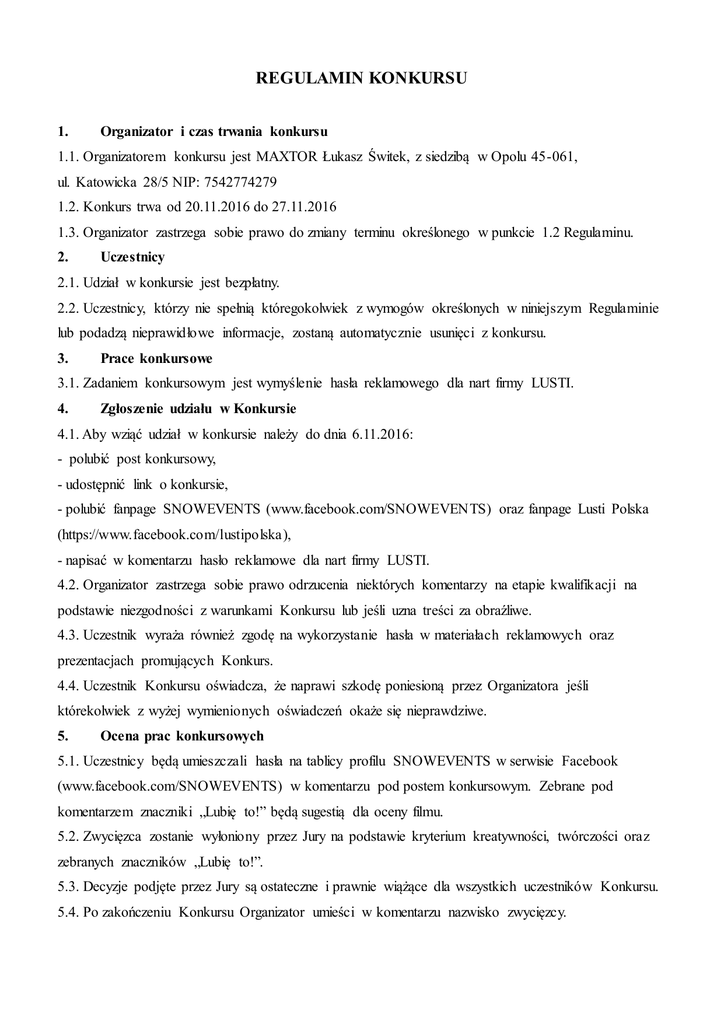 REGULAMIN KONKURSU 1. Organizator i czas trwania konkursu 1.1. Organizatorem konkursu jest MAXTOR Łukasz Świtek, z siedzibą w Opolu 45-061, ul. Katowicka 28/5 NIP: 7542774279 1.2. Konkurs trwa od 20.11.2016 do 27.11.2016 1.3. Organizator zastrzega sobie prawo do zmiany terminu określonego w punkcie 1.2 Regulaminu. 2. Uczestnicy 2.1. Udział w konkursie jest bezpłatny. 2.2. Uczestnicy, którzy nie spełnią któregokolwiek z wymogów określonych w niniejszym Regulaminie lub podadzą nieprawidłowe informacje, zostaną automatycznie usunięci z konkursu. 3. Prace konkursowe 3.1. Zadaniem konkursowym jest wymyślenie hasła reklamowego dla nart firmy LUSTI. 4. Zgłoszenie udziału w Konkursie 4.1. Aby wziąć udział w konkursie należy do dnia 6.11.2016: - polubić post konkursowy, - udostępnić link o konkursie, - polubić fanpage SNOWEVENTS (www.facebook.com/SNOWEVENTS) oraz fanpage Lusti Polska (https://www.facebook.com/lustipolska), - napisać w komentarzu hasło reklamowe dla nart firmy LUSTI. 4.2. Organizator zastrzega sobie prawo odrzucenia niektórych komentarzy na etapie kwalifikacji na podstawie niezgodności z warunkami Konkursu lub jeśli uzna treści za obraźliwe. 4.3. Uczestnik wyraża również zgodę na wykorzystanie hasła w materiałach reklamowych oraz prezentacjach promujących Konkurs. 4.4. Uczestnik Konkursu oświadcza, że naprawi szkodę poniesioną przez Organizatora jeśli którekolwiek z wyżej wymienionych oświadczeń okaże się nieprawdziwe. 5. Ocena prac konkursowych 5.1. Uczestnicy będą umieszczali hasła na tablicy profilu SNOWEVENTS w serwisie Facebook (www.facebook.com/SNOWEVENTS) w komentarzu pod postem konkursowym. Zebrane pod komentarzem znaczniki „Lubię to!” będą sugestią dla oceny filmu. 5.2. Zwycięzca zostanie wyłoniony przez Jury na podstawie kryterium kreatywności, twórczości oraz zebranych znaczników „Lubię to!”. 5.3. Decyzje podjęte przez Jury są ostateczne i prawnie wiążące dla wszystkich uczestników Konkursu. 5.4. Po zakończeniu Konkursu Organizator umieści w komentarzu nazwisko zwycięzcy. 6. Nagrody 6.1. Zwycięzca Konkursu otrzyma nagrodę w postaci: 1. miejsce: 30% na zakup dowolnego zestawu nart ( narty+wiązanie) + pokrowiec na narty 2. miejsce: 20% na zakup dowolnego zestawu nart ( narty+wiązanie) + pokrowiec na narty 3. miejsce: pokrowiec na narty 7. Postanowienia końcowe 7.1. Zgłoszenie pracy do Konkursu jest jednoznaczne z zaakceptowaniem przez Uczestnika Regulaminu Konkursu. 7.2. Organizator zastrzega sobie prawo do zmiany Regulaminu w każdym czasie, jeżeli nie wpłynie to na pogorszenie warunków uczestnictwa w Konkursie. 7.3. W sprawach nie uregulowanych niniejszym Regulaminem, zastosowanie znajdą odpowiednie przepisy Kodeksu cywilnego, a w szczególności art. 919-921 KC. 7.4. Nadesłane na Konkurs dane osobowe uczestników będą przetwarzane przez Organizatora w celu wykonania ich obowiązków związanych z Konkursem oraz dla celów marketingowych związanych z promocją Konkursu. Dane będą chronione zgodnie z Ustawą o Ochronie Danych Osobowych (Dz. U. Nr 133/97, poz. 883). Uczestnikom konkursu przysługuje prawo dostępu do treści swoich danych oraz ich poprawiania. W tym celu powinni skontaktować się oni z Organizatorem, który jest administratorem danych w rozumieniu Ustawy o Ochronie Danych Osobowych (Dz. U. Nr 133/97, poz. 883). Podanie danych jest dobrowolne, lecz konieczne do wzięcia udziału w Konkursie. 7.5. Regulamin wchodzi w życie z dniem 20.11.2016 7.6. Wszelkie pytania dotyczące Konkursu należy przesyłać w wiadomości prywatnej na Facebooku Organizatora.