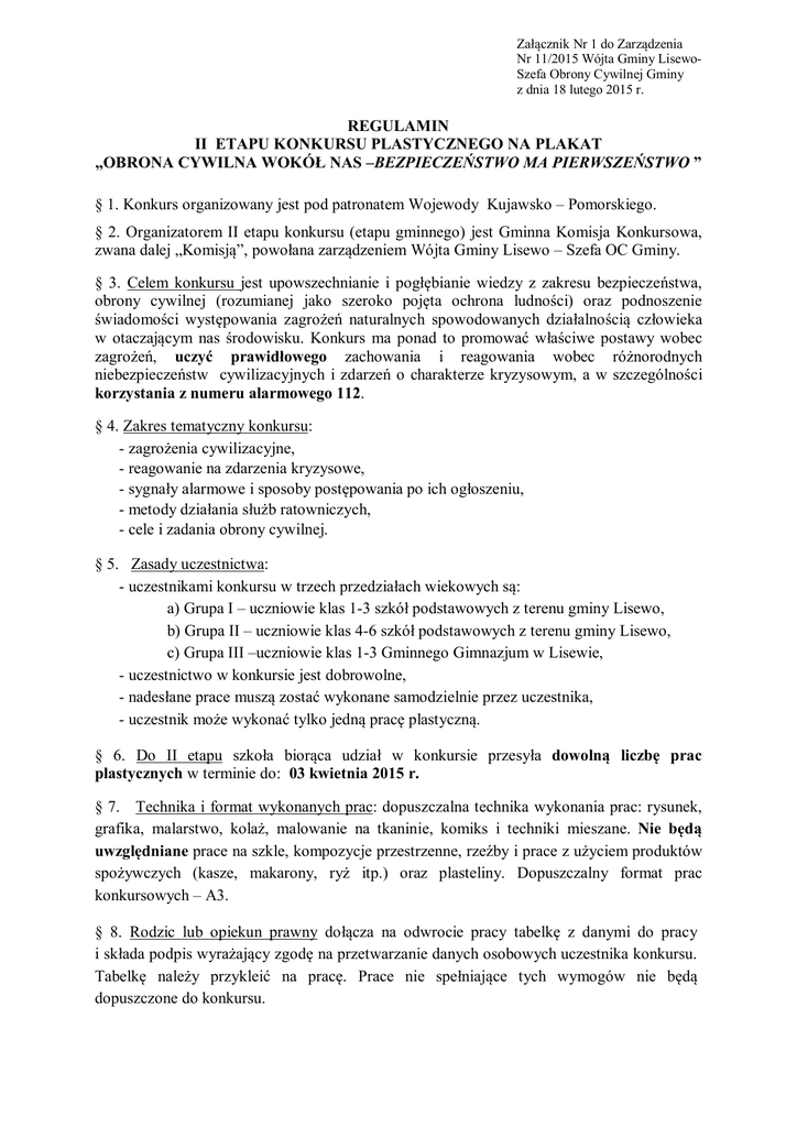 Załącznik Nr 1 do Zarządzenia Nr 11/2015 Wójta Gminy LisewoSzefa Obrony Cywilnej Gminy z dnia 18 lutego 2015 r. REGULAMIN II ETAPU KONKURSU PLASTYCZNEGO NA PLAKAT „OBRONA CYWILNA WOKÓŁ NAS –BEZPIECZEŃSTWO MA PIERWSZEŃSTWO ” § 1. Konkurs organizowany jest pod patronatem Wojewody Kujawsko – Pomorskiego. § 2. Organizatorem II etapu konkursu (etapu gminnego) jest Gminna Komisja Konkursowa, zwana dalej „Komisją”, powołana zarządzeniem Wójta Gminy Lisewo – Szefa OC Gminy. § 3. Celem konkursu jest upowszechnianie i pogłębianie wiedzy z zakresu bezpieczeństwa, obrony cywilnej (rozumianej jako szeroko pojęta ochrona ludności) oraz podnoszenie świadomości występowania zagrożeń naturalnych spowodowanych działalnością człowieka w otaczającym nas środowisku. Konkurs ma ponad to promować właściwe postawy wobec zagrożeń, uczyć prawidłowego zachowania i reagowania wobec różnorodnych niebezpieczeństw cywilizacyjnych i zdarzeń o charakterze kryzysowym, a w szczególności korzystania z numeru alarmowego 112. § 4. Zakres tematyczny konkursu: - zagrożenia cywilizacyjne, - reagowanie na zdarzenia kryzysowe, - sygnały alarmowe i sposoby postępowania po ich ogłoszeniu, - metody działania służb ratowniczych, - cele i zadania obrony cywilnej. § 5. Zasady uczestnictwa: - uczestnikami konkursu w trzech przedziałach wiekowych są: a) Grupa I – uczniowie klas 1-3 szkół podstawowych z terenu gminy Lisewo, b) Grupa II – uczniowie klas 4-6 szkół podstawowych z terenu gminy Lisewo, c) Grupa III –uczniowie klas 1-3 Gminnego Gimnazjum w Lisewie, - uczestnictwo w konkursie jest dobrowolne, - nadesłane prace muszą zostać wykonane samodzielnie przez uczestnika, - uczestnik może wykonać tylko jedną pracę plastyczną. § 6. Do II etapu szkoła biorąca udział w konkursie przesyła dowolną liczbę prac plastycznych w terminie do: 03 kwietnia 2015 r. § 7. Technika i format wykonanych prac: dopuszczalna technika wykonania prac: rysunek, grafika, malarstwo, kolaż, malowanie na tkaninie, komiks i techniki mieszane. Nie będą uwzględniane prace na szkle, kompozycje przestrzenne, rzeźby i prace z użyciem produktów spożywczych (kasze, makarony, ryż itp.) oraz plasteliny. Dopuszczalny format prac konkursowych – A3. § 8. Rodzic lub opiekun prawny dołącza na odwrocie pracy tabelkę z danymi do pracy i składa podpis wyrażający zgodę na przetwarzanie danych osobowych uczestnika konkursu. Tabelkę należy przykleić na pracę. Prace nie spełniające tych wymogów nie będą dopuszczone do konkursu. § 9. Kryteria oceny prac konkursowych: - zgodność z tematem, - poziom artystyczny, - jakość i estetyka wykonania. § 10. Komisja dokona oceny zgłoszonych prac w terminie do 20 kwietnia 2015 r. i przyzna wyróżnienia oraz nagrody rzeczowe. § 11. Do III etapu konkursu Komisja zgłasza 3 najlepsze prace plastycznych w poszczególnych grupach i przesyła, w nieprzekraczalnym terminie do 24 kwietnia 2015 r., na adres: Wydział Bezpieczeństwa i Zarządzania Kryzysowego Kujawsko-Pomorskiego Urzędu Wojewódzkiego ul. Jagiellońska 3 85-950 Bydgoszcz § 12. Organizator zastrzega sobie prawo do prezentacji wyróżnionych prac na wystawach i w środkach masowego przekazu. § 13. Organizator nie przewiduje zwrotu nadesłanych prac.