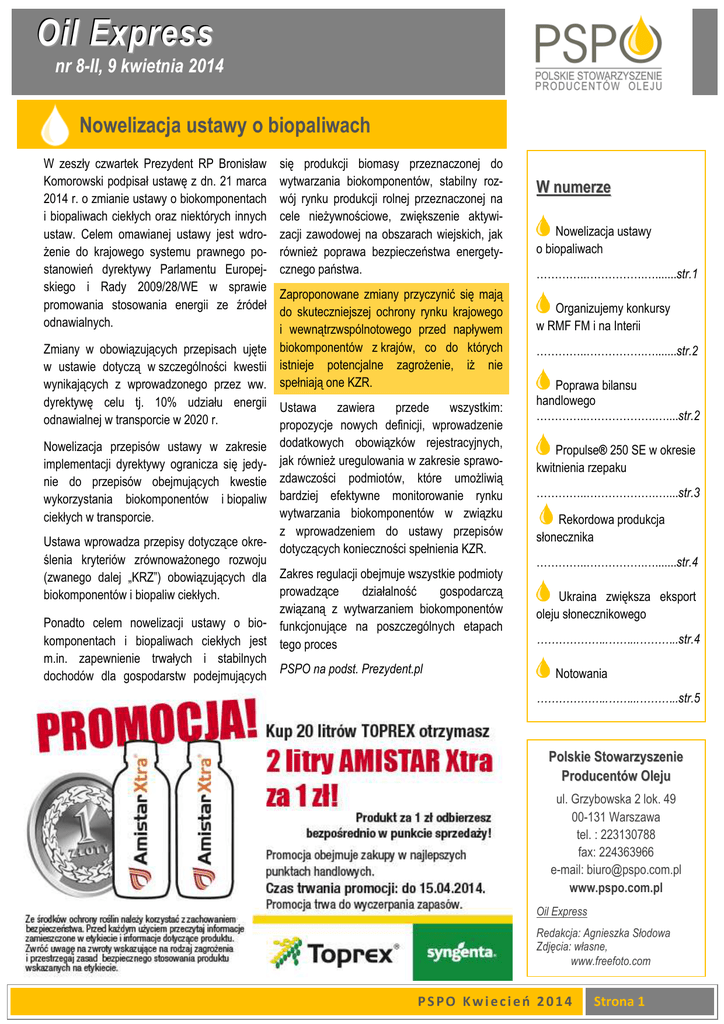 Oil Express nr 8-II, 9 kwietnia 2014 Nowelizacja ustawy o biopaliwach W zeszły czwartek Prezydent RP Bronisław Komorowski podpisał ustawę z dn. 21 marca 2014 r. o zmianie ustawy o biokomponentach i biopaliwach ciekłych oraz niektórych innych ustaw. Celem omawianej ustawy jest wdroŜenie do krajowego systemu prawnego postanowień dyrektywy Parlamentu Europejskiego i Rady 2009/28/WE w sprawie promowania stosowania energii ze źródeł odnawialnych. się produkcji biomasy przeznaczonej do wytwarzania biokomponentów, stabilny rozwój rynku produkcji rolnej przeznaczonej na cele nieŜywnościowe, zwiększenie aktywizacji zawodowej na obszarach wiejskich, jak równieŜ poprawa bezpieczeństwa energetycznego państwa. Zaproponowane zmiany przyczynić się mają do skuteczniejszej ochrony rynku krajowego i wewnątrzwspólnotowego przed napływem Zmiany w obowiązujących przepisach ujęte biokomponentów z krajów, co do których w ustawie dotyczą w szczególności kwestii istnieje potencjalne zagroŜenie, iŜ nie wynikających z wprowadzonego przez ww. spełniają one KZR. dyrektywę celu tj. 10% udziału energii Ustawa zawiera przede wszystkim: odnawialnej w transporcie w 2020 r. propozycje nowych definicji, wprowadzenie dodatkowych obowiązków rejestracyjnych, jak równieŜ uregulowania w zakresie sprawozdawczości podmiotów, które umoŜliwią bardziej efektywne monitorowanie rynku wytwarzania biokomponentów w związku z wprowadzeniem do ustawy przepisów Ustawa wprowadza przepisy dotyczące okre- dotyczących konieczności spełnienia KZR. ślenia kryteriów zrównowaŜonego rozwoju (zwanego dalej „KRZ”) obowiązujących dla Zakres regulacji obejmuje wszystkie podmioty prowadzące działalność gospodarczą biokomponentów i biopaliw ciekłych. związaną z wytwarzaniem biokomponentów Ponadto celem nowelizacji ustawy o bio- funkcjonujące na poszczególnych etapach komponentach i biopaliwach ciekłych jest tego proces m.in. zapewnienie trwałych i stabilnych PSPO na podst. Prezydent.pl dochodów dla gospodarstw podejmujących Nowelizacja przepisów ustawy w zakresie implementacji dyrektywy ogranicza się jedynie do przepisów obejmujących kwestie wykorzystania biokomponentów i biopaliw ciekłych w transporcie. W numerze Nowelizacja ustawy o biopaliwach …………..…………….….......str.1 Organizujemy konkursy w RMF FM i na Interii …………..…………….….......str.2 Poprawa bilansu handlowego …………..……………….…....str.2 Propulse® 250 SE w okresie kwitnienia rzepaku …………..……………….…....str.3 Rekordowa produkcja słonecznika …………..…………….….......str.4 Ukraina zwiększa eksport oleju słonecznikowego ………………..……...………..str.4 Notowania ………………..……...………..str.5 Polskie Stowarzyszenie Producentów Oleju ul. Grzybowska 2 lok. 49 00-131 Warszawa tel. : 223130788 fax: 224363966 e-mail: [email protected] www.pspo.com.pl Oil Express Redakcja: Agnieszka Słodowa Zdjęcia: własne, www.freefoto.com PSPO Kwiecień 2014 Strona 1 Oil Express Organizujemy konkursy w RMF FM i na Interii dla całej rodziny – uśmiechniętą patelnię Smiley Face. Konkurs trwa od 9 do 16 kwietnia 2014 r. Buszujące w Internecie mamy mogą W ramach kampanii Pokochaj olej rzepa- wygrać zestawy fartuszków kuchennych kowy moŜna wziąć udział w konkursach. dla mamy i córki. Fartuszki są do wygraDla najszybszych słuchaczy radia RMF nia w ramach konkursu Interii dla pań, FM czekają nagrody patelnie. Aby je które najciekawiej opiszą w jaki sposób wygrać trzeba po emisji materiału o oleju stosują olej rzepakowy w diecie swojego rzepakowym wejść na Rmf.fm i wziąć dziecka. Konkurs trwa do 15 kwietnia br. udział w krótkim teście wiedzy o oleju rzepakowym, a potem opisać potrawę z olejem. Codziennie, osoby, które najszybciej udzielą poprawnych odpowiedzi w quizie, a takŜe w najciekawszy sposób opiszą danie, zdobędą nagrodę A juŜ niebawem konkurs wielkanocny na Fabooku kampanii z Katarzyną Bosacką w roli jurora. Zapraszamy do udziału! Ewa Myśliwiec Poprawa bilansu handlowego 2013 r. w polskim handlu zagranicznym nasionami oleistych i produktami ich przerobu odnotowano wzrost eksportu oraz spadek importu. Wartość eksportu tej grupy produktów wzrosła w stosunku do 2012 r. o 48% do 972,7 mln €, natomiast importu spadła o 11% do 1799,8 mln €. W efekcie saldo wymiany handlowej polepszyło się. Ujemny bilans w handlu oleistymi zmniejszył się do minus 827,2 mln € wobec minus 1373,4 mln € rok wcześniej. Wartość importu przewyŜszała wartość eksportu w dwóch rozpatrywanych grupach towarów tj. dla olejów i śrut, zaś dla nasion oraz margaryn odnotowano dodatni bilans handlowy. wym (w tym 64% stanowiła śruta sojowa). Wartość importu spadła o 11% do 1799,8 mln € wobec 2012 r. W strukturze towarowej największy udział miały śruty oleistych tj. 74% w ujęciu ilościo- Do powyŜszych wyników pod względem wartości sprzedaŜy przyczynił się eksport nasion, olejów, potem śrut, oraz w mniejszym stopniu margaryn. NaleŜy odnotować ponad 2-krotny wzrost wartości oraz niespełna 3-krotny ilości eksportowanych nasion. W 2013 r. odnotowano wzrost wartości eksportu grupy oleistych do 972,7 mln €, tj. o 48% więcej w stosunku do roku W 2013 r. w polskim handlu nasionami 2012 r., natomiast wolumen eksportu oleistymi i produktami ich przetwórstwa zwiększył się w tym okresie o 55% do dominował import. 1980,8 tys. t. O 52% wzrosła wartość sprzedaŜy za granicę olejów, śrut o 48%, a jedynie margaryn spadła o 4%. Wartość eksportu rzepaku wzrosła o ze 122,3 mln € do około 308,8 mln €. W poprzednim roku eksport oleju rzepakowego istotnie wzrósł ilościowo wobec 2012 r. o 93% do 348,8 tys. t, a wartościowo o 63% do 295,1 mln EUR. PSPO na podst. FAMMU/FAPA za CIHZ PSPO Kwiecień 2014 Strona 2 Oil Express Propulse® 250 SE w okres