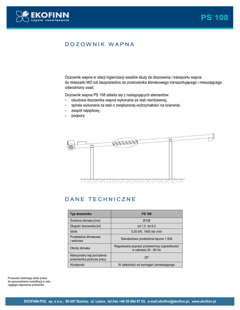 PS 108 DOZOWNIK WAPNA Dozownik wapna w stacji higienizacji osadów słuŜy do dozowania i transportu wapna do mieszarki MO lub bezpośrednio do przenośnika ślimakowego transportującego i mieszającego odwodniony osad. Dozownik wapna PS 108 składa się z następujących elementów: - obudowa dozownika wapna wykonana ze stali nierdzewnej, - spirala wykonana za stali o zwiększonej wytrzymałości na ścieranie, - zespół napędowy, - podpory. DANE TECHNICZNE Typ dozownika PS 108 Średnica ślimaka [mm] Ø108 Długość dozownika [m] od 1,0 do 6,0 Silnik Przekładnia ślimakowa i walcowa Obroty ślimaka Maksymalny kąt pochylenia przenośnika podczas pracy Wydajność 0,55 kW, 1400 obr./min Standardowo przełoŜenie łączne 1:504 Regulowane poprzez przetwornicę częstotliwości w zakresie 20 - 80 Hz 30o W zaleŜności od wymagań zamawiającego Producent zastrzega sobie prawo do wprowadzania modyfikacji w celu ciągłego ulepszania produktów EKOFINN-POL sp. z o.o., 80-297 Banino, ul. Leśna, tel./fax +48 58 684 87 03, e-mail:[email protected], www.ekofinn.pl