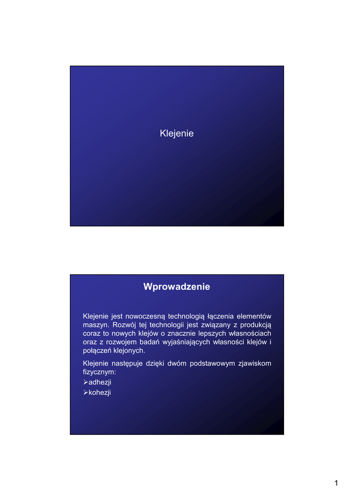 Klejenie Wprowadzenie Klejenie jest nowoczesną technologią łączenia elementów maszyn. Rozwój tej technologii jest związany z produkcją coraz to nowych klejów o znacznie lepszych własnościach oraz z rozwojem badań wyjaśniających własności klejów i połączeń klejonych. Klejenie następuje dzięki dwóm podstawowym zjawiskom fizycznym: adhezji kohezji 1 Wprowadzenie Adhezję właściwą stanowią siły przyciągania między cząsteczkami dwóch różnych ciał, zwane siłami Van der Vaalsa. Siły te działają powierzchniowo do 1 mm w głąb materiału. Dlatego kleje muszą bezwarunkowo zwilżać całą łączoną powierzchnię. Wiąże się z tym pojęcie adhezji mechanicznej, gdzie ciekły klej, charakteryzujący się niską lepkością, wypełnia nierówności powierzchni materiału i zakotwicza się w nich. Daje to zwiększenie własności mechanicznych połączeń klejonych. Wprowadzenie Kohezja - to siły spójności między cząsteczkami tego samego materiału, w tym przypadku kleju. W dobrym połączeniu klejonym siły adhezji i kohezji powinny być mniej więcej jednakowe. Smoła, wosk i kalafonie dobrze zwilżają powierzchnie łączone, ale ich kohezja jest niska, więc jako kleje nie są wytrzymałe mechanicznie. 2 Wprowadzenie Zwilżanie następuje wtedy, gdy krytyczna energia powierzchniowa kleju jest równa lub mniejsza od analogicznej energii klejonego materiału. Dlatego bardzo trudne jest klejenie tworzyw sztucznych o wysokiej energii powierzchniowej (np. teflonu, polietylenu). Klejenie jest obecnie bardzo szeroko stosowaną technologią łączenia, która ma największą przyszłość np. w przemyśle samochodowym: każdy nowoczesny samochód zawiera w połączeniach ok. 8 kg kleju. Dzięki temu uzyskuje się lżejszą, bardziej dźwiękochłonną i odporną na korozję konstrukcję nadwozia. Często połączenia klejone wykonuje się jako tzw. połączenia wspólne, kombinowane z połączeniami zgrzewanymi lub śrubowymi. Wprowadzenie Do zalet połączeń klejonych zaliczyć można: 1. łączenie materiałów o odmiennym składzie i właściwościach, np.: metal - szkło, guma - drewno, tworzywa sztuczne - metal; 2. równomierne (w odróżnieniu od połączeń śrubowych lub nitowanych) obciążenie złącza; 3. brak strefy wpływu ciepła (w odróżnieniu od połączeń spawanych); 4. minimalne naprężenia i odkształcenia w złączach; 5. uszczelnienie połączeń i ochrona przed wnikaniem wilgoci i powstawaniem korozji; 6. przejmowanie przez warstwę klejoną reakcji wynikającej z różnej rozszerzalności liniowej klejonych materiałów. 3 Wprowadzenie Wadami połączeń klejonych są: 1. ograniczona odporność na działanie wysokich temperatur powyżej 573 K (300 °C); 2. niska wytrzymałość mechaniczna połączeń (wytrzymałość na ścinanie nie przekracza 30 MPa); 3. długi czas wiązania; 4. ograniczona przydatność składowanych klejów (do 12 mies.) Wprowadzenie Konstrukcja połączenia klejonego to przede wszystkim złącze zakładkowe o dużej powierzchni łączenia, pracujące na ścinanie. Używane przy spawaniu złącza doczołowe tutaj nie mają zastosowania. Bardzo niekorzystne jest działanie karbu na połączenia klejone i oddzieranie jednego z łączonych materiałów od drugiego. Istotną rolę, podobnie jak przy lutowaniu, odgrywa szczelina między łączonymi elementami. Optymalna jej wielkość powinna wynosić 0,03-0,05 mm, zależnie od rodzaju kleju (przy klejach epoksydowych do ok. 0,1mm). 4 Wprowadzenie Przy zwiększaniu szczeliny wytrzymałość mechaniczna połączenia klejonego spada. Znane są jednak uszczelnienia (takie jak MS-polimery) o własnościach elastycznych, spełniające rolę klejów, którymi wykonuje się połączenia o grubości kilku milimetrów. Wprowadzenie Bardzo istotne są własności powierzchni materiałów klejonych i ich odpowiednie przygotowanie. Przez właściwe przygotowanie powierzchni łączonych materiałów można nawet 4-krotnie zwiększyć wytrzymałość mechaniczną połączeń klejonych. Odpowiednią chropowatość powierzchni metali uzyskuje się przez trawienie chemiczne i elektrolityczne. Niezbędne jest odtłuszczanie powierzchni materiałów bezpośrednio przed klejeniem. Nie zaleca się stosowania rozpuszczalników wodnych, zawierających środki konserwujące i antykorozyjne, ponieważ mogą one zmniejszyć adhezję kleju do łączonej powierzchni. Powszechnie stosowane jest odtłuszczanie w wannach ultradźwiękowych lub kąpielach alkoholowych. Z niektórych tworzyw sztucznych oraz gumy muszą być usunięte warstwy prasowane i wulkanizacyjne. 5 Wprowadzenie Duży wpływ na jakość klejenia mają warunki, w których ono następuje. Towarzysząca mu temperatura powinna wynosić co najmniej 278K (5°C). Aktywatory przyśpieszające wiązanie kleju zwykle obniżają wytrzymałość mechaniczną połączeń. Zmienne obciążenia, zwłaszcza dynamiczne, obniżają wytrzymałość połączeń klejonych 2-5 razy w porównaniu z obciążeniem statycznym. Klasyfikacja klejów 1. 2. 3. 4. 5. 6. Najczęściej stosowaną klasyfikacją klejów jest podział uwzględniający ich budowę i sposób utwardzania. I tak, rozróżniamy kleje: polichloroprenowe, cyjano-akrylowe, anaerobowe, dyspersyjne (wodne), termoplastyczne (topliwe) epoksydowe. 6 Klasyfikacja klejów Kleje polichloroprenowe to typowe kleje kontaktowe, oparte na rozpuszczalnikach, takich jak benzyna, ketony i estry. Nanosi się je na łączone powierzchnie i tak długo trzyma, aż rozpuszczalnik odparuje (ok. 10 min). Po sprawdzeniu, że klej się nie ciągnie, łączone elementy składa się pod naciskiem. Nie można już wtedy zmieniać ich położenia, gdyż połączenie od razu zyskuje 70% całkowitej wytrzymałości mechanicznej. Kleje tego rodzaju służą do klejenia gumy, skóry, twardego PCW i innych tworzyw sztucznych. Typowym klejem tej grupy jest butapren. Klasyfikacja klejów Kleje cyjanoakrylowe utwardza