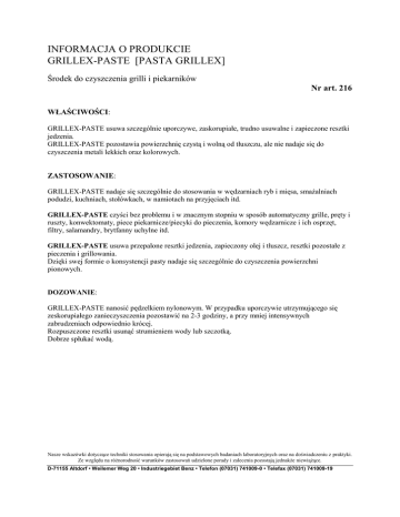INFORMACJA O PRODUKCIE GRILLEX-PASTE [PASTA GRILLEX] Środek do czyszczenia grilli i piekarników Nr art. 216 WŁAŚCIWOŚCI: GRILLEX-PASTE usuwa szczególnie uporczywe, zaskorupiałe, trudno usuwalne i zapieczone resztki jedzenia. GRILLEX-PASTE pozostawia powierzchnię czystą i wolną od tłuszczu, ale nie nadaje się do czyszczenia metali lekkich oraz kolorowych. ZASTOSOWANIE: GRILLEX-PASTE nadaje się szczególnie do stosowania w wędzarniach ryb i mięsa, smażalniach podudzi, kuchniach, stołówkach, w namiotach na przyjęciach itd. GRILLEX-PASTE czyści bez problemu i w znacznym stopniu w sposób automatyczny grille, pręty i ruszty, konwektomaty, piece piekarnicze/piecyki do pieczenia, komory wędzarnicze i ich osprzęt, filtry, salamandry, brytfanny uchylne itd. GRILLEX-PASTE usuwa przepalone resztki jedzenia, zapieczony olej i tłuszcz, resztki pozostałe z pieczenia i grillowania. Dzięki swej formie o konsystencji pasty nadaje się szczególnie do czyszczenia powierzchni pionowych. DOZOWANIE: GRILLEX-PASTE nanosić pędzelkiem nylonowym. W przypadku uporczywie utrzymującego się zeskorupiałego zanieczyszczenia pozostawić na 2-3 godziny, a przy mniej intensywnych zabrudzeniach odpowiednio krócej. Rozpuszczone resztki usunąć strumieniem wody lub szczotką. Dobrze spłukać wodą. Nasze wskazówki dotyczące techniki stosowania opierają się na podstawowych badaniach laboratoryjnych oraz na doświadczeniu z praktyki. Ze względu na różnorodność warunków zastosowań udzielone porady i zalecenia pozostają jednakże niewiążące. D-71155 Altdorf • Weilemer Weg 20 • Industriegebiet Benz • Telefon (07031) 741009-0 • Telefax (07031) 741009-19