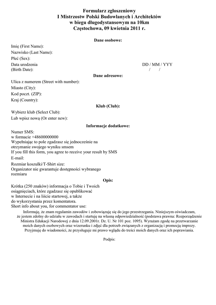 Formularz zgłoszeniowy I Mistrzostw Polski Budowlanych i Architektów w biegu długodystansowym na 10km Częstochowa, 09 kwietnia 2011 r. Dane osobowe: Imię (First Name): Nazwisko (Last Name): Płeć (Sex): Data urodzenia (Birth Date): DD / MM / YYY / / Dane adresowe: Ulica z numerem (Street with number): Miasto (City): Kod poczt. (ZIP): Kraj (Country): Klub (Club): Wybierz klub (Select Club): Lub wpisz nową (Or enter new): Informacje dodatkowe: Numer SMS: w formacie +48600000000 Wypełniając to pole zgadzasz się jednocześnie na otrzymanie swojego wyniku smsem If you fill this form, you agree to receive your result by SMS E-mail: Rozmiar koszulki/T-Shirt size: Organizator nie gwarantuje dostępności wybranego rozmiaru Opis: Krótka (250 znaków) informacja o Tobie i Twoich osiągnięciach, które zgadzasz się opublikować w Internecie i na liście startowej, a także do wykorzystania przez komentatora. Short info about you, for commentator use: Informuję, że znam regulamin zawodów i zobowiązuję się do jego przestrzegania. Niniejszym oświadczam, że jestem zdolny do udziału w zawodach i startuję na własną odpowiedzialność (podstawa prawna: Rozporządzenie Ministra Edukacji Narodowej z dnia 12.09.2001r. Dz. U. Nr 101 poz. 1095). Wyrażam zgodę na przetwarzanie moich danych osobowych oraz wizerunku i zdjęć dla potrzeb związanych z organizacją i promocją imprezy. Przyjmuję do wiadomości, że przysługuje mi prawo wglądu do treści moich danych oraz ich poprawiania. Podpis: