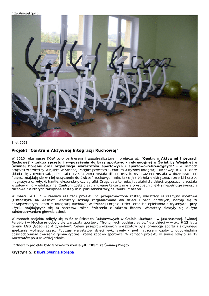 http://mojekgw.pl 5 lut 2016 Projekt "Centrum Aktywnej Integracji Ruchowej" W 2015 roku nasze KGW było partnerem i współrealizatorem projektu pt. "Centrum Aktywnej Integracji Ruchowej" - zakup sprzętu i wyposażenia do bazy sportowo - rekreacyjnej w Świetlicy Wiejskiej w Świnnej Porębie oraz organizacja warsztatów sportowych i sportowo-rekreacyjnych" - w ramach projektu w Świetlicy Wiejskiej w Świnnej Porębie powstało "Centrum Aktywnej Integracji Ruchowej" (CAIR), które składa się z dwóch sal. Jedna sala przeznaczona została dla dorosłych, wyposażona została w duże lustra do fitness, znajdują się w niej urządzenia do ćwiczeń ruchowych min. takie jak bieżnia elektryczna, rowerki i orbitki magnetyczne, kołyski, hantle, ekspandery czy agrafki. Druga sala to rodzaj bawialni dla dzieci, wyposażona została w zabawki i gry edukacyjne. Centrum zostało zaplanowane także z myślą o osobach z lekką niepełnosprawnością ruchową dla których zakupione zostały min. piłki rehabilitacyjne, wałki i masażer. W marcu 2015 r. w ramach realizacji projektu pt. przeprowadzone zostały warsztaty rekreacyjno sportowe „Gimnastyka na wesoło". Warsztaty zostały zorganizowane dla dzieci i osób dorosłych, odbyły się w nowopowstałym Centrum Integracji Ruchowej w Świnnej Porębie. Dzieci oraz ich opiekunowie wykonywali przy użyciu znajdujących się tu sprzętów różne ćwiczenia z zakresu fitness. Warsztaty cieszyły się dużym zainteresowaniem głównie dzieci. W ramach projektu odbyły się także w Szkołach Podstawowych w Gminie Mucharz - w Jaszczurowej, Świnnej Porębie i w Mucharzu odbyły się warsztaty sportowe "Trenuj ruch będziesz zdrów" dla dzieci w wieku 6-12 lat z terenu LGD „Gościniec 4 żywiołów". Celem przeprowadzonych warsztatów była promocja sportu i aktywnego spędzania wolnego czasu. Podczas warsztatów dzieci wykonywały - pod nadzorem osoby z odpowiednim doświadczeniem ćwiczenia gimnastyczne i różne zabawy sportowe. W ramach projektu w sumie odbyło się 12 warsztatów po 4 w każdej szkole. Partnerem projektu było Stowarzyszenie „KLEKS” ze Świnnej Poręby. Krystyna S. z KGW Świnna Poręba