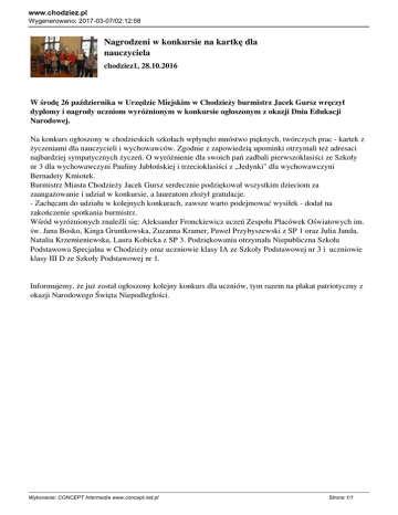 www.chodziez.pl Wygenerowano: 2017-03-07/02:12:58 Nagrodzeni w konkursie na kartkę dla nauczyciela chodziez1, 28.10.2016 W środę 26 października w Urzędzie Miejskim w Chodzieży burmistrz Jacek Gursz wręczył dyplomy i nagrody uczniom wyróżnionym w konkursie ogłoszonym z okazji Dnia Edukacji Narodowej. Na konkurs ogłoszony w chodzieskich szkołach wpłynęło mnóstwo pięknych, twórczych prac - kartek z życzeniami dla nauczycieli i wychowawców. Zgodnie z zapowiedzią upominki otrzymali też adresaci najbardziej sympatycznych życzeń. O wyróżnienie dla swoich pań zadbali pierwszoklasiści ze Szkoły nr 3 dla wychowawczyni Pauliny Jabłońskiej i trzecioklasiści z „Jedynki" dla wychowawczyni Bernadety Kmiotek. Burmistrz Miasta Chodzieży Jacek Gursz serdecznie podziękował wszystkim dzieciom za zaangażowanie i udział w konkursie, a laureatom złożył gratulacje. - Zachęcam do udziału w kolejnych konkurach, zawsze warto podejmować wysiłek - dodał na zakończenie spotkania burmistrz. Wśród wyróżnionych znaleźli się: Aleksander Fronckiewicz uczeń Zespołu Placówek Oświatowych im. św. Jana Bosko, Kinga Gruntkowska, Zuzanna Kramer, Paweł Przybyszewski z SP 1 oraz Julia Janda, Natalia Krzemieniewska, Laura Kobicka z SP 3. Podziękowania otrzymała Niepubliczna Szkoła Podstawowa Specjalna w Chodzieży oraz uczniowie klasy IA ze Szkoły Podstawowej nr 3 i uczniowie klasy III D ze Szkoły Podstawowej nr 1. Informujemy, że już został ogłoszony kolejny konkurs dla uczniów, tym razem na plakat patriotyczny z okazji Narodowego Święta Niepodległości. Wykonanie: CONCEPT Intermedia www.concept.net.pl Strona 1/1
