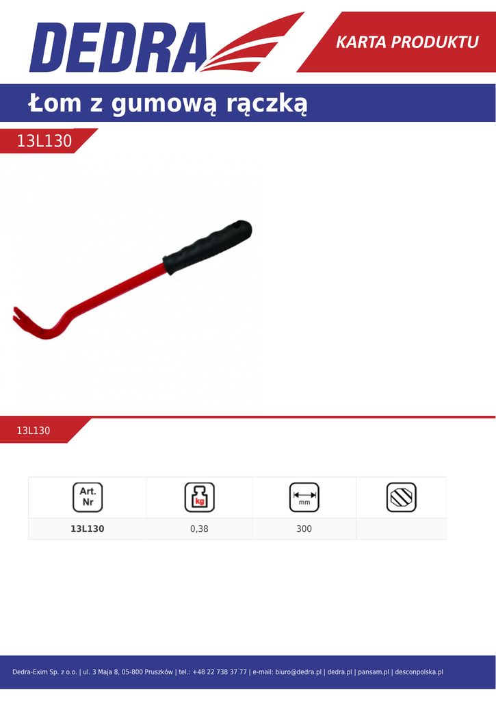 Łom z gumową rączką 13L130 13L130 13L130 0,38 300 Dedra-Exim Sp. z o.o. | ul. 3 Maja 8, 05-800 Pruszków | tel.: +48 22 738 37 77 | e-mail: [email protected] | dedra.pl | pansam.pl | desconpolska.pl