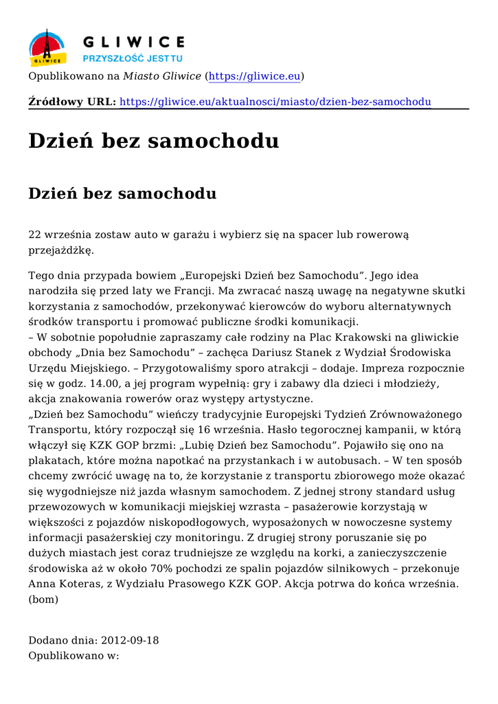 Opublikowano na Miasto Gliwice (https://gliwice.eu) Źródłowy URL: https://gliwice.eu/aktualnosci/miasto/dzien-bez-samochodu Dzień bez samochodu Dzień bez samochodu 22 września zostaw auto w garażu i wybierz się na spacer lub rowerową przejażdżkę. Tego dnia przypada bowiem „Europejski Dzień bez Samochodu”. Jego idea narodziła się przed laty we Francji. Ma zwracać naszą uwagę na negatywne skutki korzystania z samochodów, przekonywać kierowców do wyboru alternatywnych środków transportu i promować publiczne środki komunikacji. – W sobotnie popołudnie zapraszamy całe rodziny na Plac Krakowski na gliwickie obchody „Dnia bez Samochodu” – zachęca Dariusz Stanek z Wydział Środowiska Urzędu Miejskiego. – Przygotowaliśmy sporo atrakcji – dodaje. Impreza rozpocznie się w godz. 14.00, a jej program wypełnią: gry i zabawy dla dzieci i młodzieży, akcja znakowania rowerów oraz występy artystyczne. „Dzień bez Samochodu” wieńczy tradycyjnie Europejski Tydzień Zrównoważonego Transportu, który rozpoczął się 16 września. Hasło tegorocznej kampanii, w którą włączył się KZK GOP brzmi: „Lubię Dzień bez Samochodu”. Pojawiło się ono na plakatach, które można napotkać na przystankach i w autobusach. – W ten sposób chcemy zwrócić uwagę na to, że korzystanie z transportu zbiorowego może okazać się wygodniejsze niż jazda własnym samochodem. Z jednej strony standard usług przewozowych w komunikacji miejskiej wzrasta – pasażerowie korzystają w większości z pojazdów niskopodłogowych, wyposażonych w nowoczesne systemy informacji pasażerskiej czy monitoringu. Z drugiej strony poruszanie się po dużych miastach jest coraz trudniejsze ze względu na korki, a zanieczyszczenie środowiska aż w około 70% pochodzi ze spalin pojazdów silnikowych – przekonuje Anna Koteras, z Wydziału Prasowego KZK GOP. Akcja potrwa do końca września. (bom) Dodano dnia: 2012-09-18 Opublikowano w: Miasto [1] Życie i styl[2] Udostępnij [3] Tweetnij [4] RSS [5] Linki: [1] https://gliwice.eu/aktualnosci?tid=13 [2] https://gliwice.eu/aktualnosci?tid=58 [3] https://www.facebook.com/share.php?u=https://gliwice.eu/printpdf/aktualnosci/miasto/d bez-samochodu&t=Dzień bez samochodu [4] https://twitter.com/intent/tweet?text=Dzień bez samochodu&url=https://gliwice.eu/printpdf/aktualnosci/miasto/dzien-bezsamochodu%23twitter [5] https://gliwice.eu/rss/aktualnosci