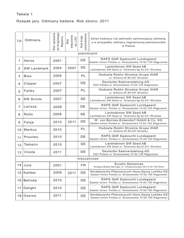 Tabela 1 Rzepak jary. Odmiany badane. Rok zbioru: 2011