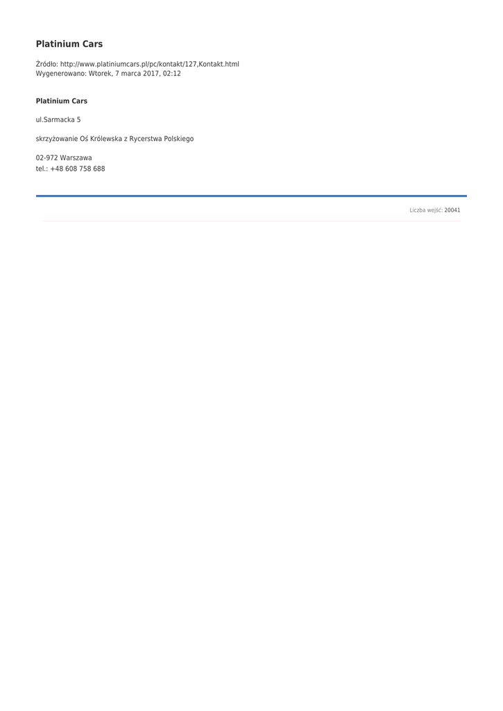 Platinium Cars Źródło: http://www.platiniumcars.pl/pc/kontakt/127,Kontakt.html Wygenerowano: Wtorek, 7 marca 2017, 02:12 Platinium Cars ul.Sarmacka 5 skrzyżowanie Oś Królewska z Rycerstwa Polskiego 02-972 Warszawa tel.: +48 608 758 688 Liczba wejść: 20041