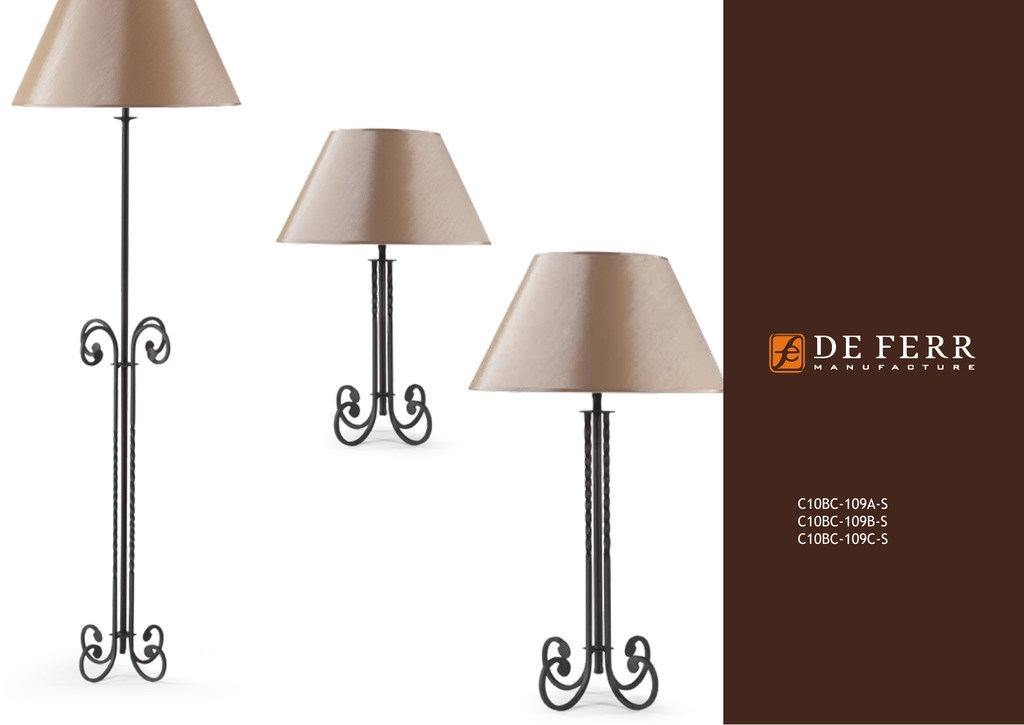 C10BC-109A-S C10BC-109B-S C10BC-109C-S SERIA LAMP CLASSIC 109 Czar, wdzięk i klasyczny abażur. De FERR kolekcji 109 to niewątpliwie oprawy oświetleniowe, nad których kupnem warto się zastanowić. Czarujące kształty zaklęte w ponętnie wygiętych formach. Dostarczane z klasycznym abażurem wykonanym z połyskliwego, eleganckiego materiału. Informacje o produkcie: - podstawa oprawy oświetleniowej wykonana z profilu stalowego/żeliwnego, - abażur wykonany z tkaniny/PCV, - produkt wymaga samodzielnego montażu abażura. Produkty De Ferr wykonywane są ręcznie. Podawane wymiary mieszczą się w tolerancji +/- 3%. 55 45 40 172 C10BC-109B-S C10BC-109A-S C10BC-109C-S 78 KOD MODEL KOLOR KOLOR ABAŻURA ŹRÓDŁO ŚWIATŁA C10BC-109A-S C10BC-109B-S C10BC-109C-S 109A 109B 109C CZARNY KLASYK CZARNY KLASYK CZARNY KLASYK CIELISTY STOŻEK CIELISTY STOŻEK CIELISTY STOŻEK ŚWIETLÓWKA/ŻARÓWKA ŚWIETLÓWKA/ŻARÓWKA ŚWIETLÓWKA/ŻARÓWKA MOC TRZONEK WYS. CAŁ. SZER. ABAŻURU WŁĄCZNIK 1x max 60W 1x max 60W 1x max 60W E27 E27 E27 172 78 65 55 45 40 NOŻNY RĘCZNY RĘCZNY 65 max E27 60W Wejdź również na www.deferr.eu C10BM-110B-S C10BP-110C-S C10EP-110B-S C10EP-110C-S SERIA LAMP CLASSIC 110 Elegancja i klasyka w czystej postaci. De FERR kolekcji 110 to luksusowe wykończenie i piękno detalu - w sam raz dla osób pragnących posiadać coś nietuzinkowego. Serce lamp to odlew pokrywany ręcznie nanoszoną patyną umieszczony na podstawie z drewna jesionowego. Efekt dopełnia rozłożysty abażur. Lampy występują w trzech rodzajach malowania. Informacje o produkcie: - podstawa oprawy oświetleniowej wykonana z profilu stalowego/żeliwnego, - abażur wykonany z tkaniny/PCV, - produkt wymaga samodzielnego montażu abażura. Produkty De Ferr wykonywane są ręcznie. Podawane wymiary mieszczą się w tolerancji +/- 3%. C10BM-110B-S C10EP-110B-S C10BP-110C-T C10EP-110C-T 55 40 75 55 KOD MODEL KOLOR KOLOR ABAŻURA ŹRÓDŁO ŚWIATŁA C10BM-110B-S C10BP-110C-T C10EP-110B-S C10EP-110C-T 110B 110C 110B 110C CZARNY PATYNA CZARNY PERŁOWY ECRU PATYNA ECRU PATYNA CIELISTY STOŻEK POMARAŃCZOWY TOPAZ BORDOWY STOŻEK BORDOWY TOPAZ ŚWIETLÓWKA/ŻARÓWKA ŚWIETLÓWKA/ŻARÓWKA ŚWIETLÓWKA/ŻARÓWKA ŚWIETLÓWKA/ŻARÓWKA MOC TRZONEK 1x max 60W 1x max 60W 1x max 60W 1x max 60W E27 E27 E27 E27 WYS. CAŁ. 75 55 75 55 SZER. ABAŻURU WŁĄCZNIK 55 40 55 40 RĘCZNY RĘCZNY RĘCZNY RĘCZNY max E27 60W Wejdź również na www.deferr.eu C10BP-111C-E C10EP-111C-E SERIA LAMP CLASSIC 111 Nastrojowa i klimatyczna. De FERR 111 to piękna lampa z owalnym abażurem na drewnianej podstawie. Wyszukany kształt oprawy z pewnością doda każdemu wnętrzu ciepła, dlatego jak żadna inna nadaje się do umieszczenia w sypialni. Występuje w dwóch malowaniach: perłowym czarnym i jasnym ecru z ręcznie nakładaną patyną w kolorze miedzi. Abażur w oryginalnym kształcie elipsy. Informacje o produkcie: - podstawa oprawy oświetleniowej wykonana z profilu stalowego/żeliwnego, - abażur wykonany z tkaniny/PCV, - produkt wymaga samodzielnego montażu abażura. Produkty De Ferr wykonywane są ręcznie. Podawane wymiary mieszczą się w tolerancji +/- 3%. 40 C10BP-111C-E C10EP-111C-E 65 KOD MODEL KOLOR KOLOR ABAŻURA ŹRÓDŁO ŚWIATŁA C10BP-111C-E C10EP-111C-E 111C 111C CZARNY PERŁOWY ECRU PATYNA ECRU ELIPSA PIASKOWA ELIPSA ŚWIETLÓWKA/ŻARÓWKA ŚWIETLÓWKA/ŻARÓWKA MOC TRZONEK WYS. CAŁ. SZER. ABAŻURU WŁĄCZNIK 1x max 60W 1x max 60W E27 E27 65 65 40 40 RĘCZNY RĘCZNY max E27 60W Wejdź również na www.deferr.eu C10BC-112C-T C10WP-112C-T SERIA LAMP CLASSIC 112 Projekty De FERR opieramy na kształtach, czasami prostych, czasami bardziej skomplikowanych. Nie inaczej jest w przypadku modelu De FERR 112. To lampa z pewnością nadająca wnętrzu to „coś”, czego często szukamy urządzając przestrzeń wokół siebie. Występuje w dwóch zestawieniach kolorystycznych: klasycznym czarnym i białym z ręcznie nałożoną patyną. Abażur w kształcie topazu. Informacje o produkcie: - podstawa oprawy oświetleniowej wykonana z profilu stalowego/żeliwnego, - abażur wykonany z tkaniny/PCV, - produkt wymaga samodzielnego montażu abażura. Produkty De Ferr wykonywane są ręcznie. Podawane wymiary mieszczą się w tolerancji +/- 3%. 35 C10BC-112C-T C10WP-112C-T 65 KOD MODEL KOLOR KOLOR ABAŻURA ŹRÓDŁO ŚWIATŁA C10BC-112C-T C10WP-112C-T 112C 112C CZARNY KLASYK BIAŁY PATYNA POMARAŃCZOWY TOPAZ FIOLETOWY TOPAZ ŚWIETLÓWKA/ŻARÓWKA ŚWIETLÓWKA/ŻARÓWKA MOC TRZONEK WYS. CAŁ. SZER. ABAŻURU 1x max 60W 1x max 60W E27 E27 65 65 35 35 WŁĄCZNIK RĘCZNY RĘCZNY max E27 60W Wejdź również na www.deferr.eu C10RC-113B-K SERIA LAMP CLASSIC 113 Dużo wysiłku i pracy kosztuje model De FERR 113, lecz najważniejszy jest efekt i zadowolenie tego, kto go doceni. Lampa tej serii to nie tylko połączenie unikatowej formy, prostego abażuru i jesionowej podstawy. Oprawa serii 113 to przede wszystkim niezwykłe pokrycie elementów metalowych. Najpierw wywołujemy na nich prawdziwą rdzę o pięknej rudobrązowej barwie, a potem zabezpieczamy tak, żeby przez długi czas nie przeszkadzała w codziennym użytkowaniu. Informacje o produkcie: - podstawa oprawy oświetleniowej wykonana z profilu stalowego/żeliwnego, - abażur wykonany z tkaniny/PCV, - produkt wymaga samodzielnego montażu abażura. Produkty De Ferr wykonywane są ręcznie. Podawane wymiary mieszczą się w tolerancji +/- 3%. 40 70 C10RC-113B-K KOD MODEL KOLOR KOLOR ABAŻURA C10RC-113B-K 113B RDZA KLASYK WANILIOWY PROSTOKĄT ŚWIETLÓWKA/ŻARÓWKA ŹRÓDŁO ŚWIATŁA MOC TRZONEK WYS. CAŁ. SZER. ABAŻURU 1x max 60W E27 70 40 WŁĄCZNIK RĘCZNY max E27 60W Wejdź również na www.deferr.eu C10BC-114B-W SERIA LAMP CLASSIC 114 Nie duża, nie mała. Tak, oprócz wrażeń estetycznych można opisać oprawę De FERR 114 o wysokości 100cm. Pomimo tego, że ma włącznik nożny z powodzeniem może być również ustawiona na niewielkim stoliku lub komodzie. Przy wyborze 