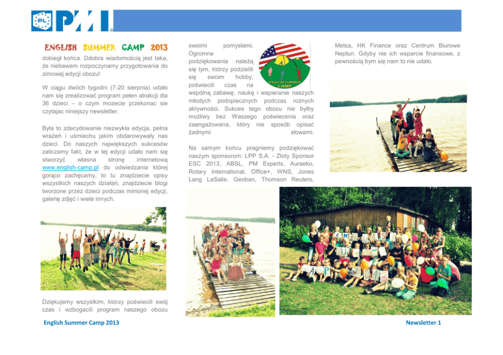 ENGLISH SUMMER CAMP 2013 dobiegł końca. Ddobra wiadomością jest taka, że niebawem rozpoczynamy przygotowania do zimowej edycji obozu! W ciągu dwóch tygodni (7-20 sierpnia) udało nam się zrealizować program pełen atrakcji dla 36 dzieci – o czym mozecie przekonac sie czytajac niniejszy newsletter. Była to zdecydowanie niezwykła edycja, pełna wrażeń i uśmiechu jakim obdarowywały nas dzieci. Do naszych największych sukcesów zaliczamy fakt, że w tej edycji udało nam się stworzyć własna stronę internetową www.english-camp.pl do odwiedzania której gorąco zachęcamy, to tu znajdziecie opisy wszystkich naszych działań, znajdziecie blogi tworzone przez dzieci podczas minionej edycji, galerię zdjęć i wiele innych. swoimi pomysłami. Ogromne podziękowania należą się tym, którzy podzielili się swoim hobby, poświecili czas na wspólną zabawę, naukę i wspieranie naszych młodych podopiecznych podczas rożnych aktywności. Sukces tego obozu nie byłby możliwy bez Waszego poświecenia oraz zaangażowana, który nie sposób opisać żadnymi słowami. Metsa, HK Finance oraz Centrum Biurowe Neptun. Gdyby nie ich wsparcie finansowe, z pewnością bym się nam to nie udało. Na samym końcu pragniemy podziękować naszym sponsorom: LPP S.A. - Złoty Sponsor ESC 2013, ABSL, PM Experts, Auraeko, Rotary International, Office+, WNS, Jones Lang LaSalle, Geoban, Thomson Reuters, Dziękujemy wszystkim, którzy poświecili swój czas i wzbogacili program naszego obozu English Summer Camp 2013 Newsletter 1 Pokaz Mody Zdecydowanie jednym z najbardziej wyjątkowych dni dla uczestników English Summer Camp 2013 był wtorek, 13 sierpnia. Już po raz drugi, udało się nam zorganizować wraz z marką Reserved Kids, należącą do naszego Złotego Sponsora frimy LPP S.A. charytatywny pokaz mody dla dzieci, w trakcie którego one same pełniły rolę modeli. Wydarzenie to odbyło się w Kompleksie Wypoczynkowym Szarlota k. Kościerzyny. Do tego dnia dzieci przygotowywały się już od początku obozu. Z entuzjazmem i odrobiną tremy zaprezentowały nam wiosenno – letnią kolekcję ubrań Reserved Kids, a także wykonane przez siebie rysunki, które przedstawialy ich największe zainteresowania. Dzięki uprzejmości projektantów z LPP, na wybiegu poza kolekcją Reserved kids mogliśmy również zobaczyć elementy garderoby męskiej i damskiej. Pokaz mody, który były głownym wydarzeniem tego wieczoru cieszył się ogromną popularnością, tego dnia podziwiać dzieci przyjechali przedstawiciele naszych sponsorów (LPP, English Summer Camp 2013 Thomson Reuters, Office+, HK Finance, Geoban, Rotarty International), nasi partnerzy (Invest in Pomerania, Rotaract Trójmiasto, Obiektywni.pl, Fundacja Hospicyjna), wolontariusze, a także osoby wypoczywające w Szarlocie. Oprócz wpsomnianego pokazu, dodatowo była też okazja do zintegrowania się przy ognisku oraz posluchania koncertu muzyki bałkańskiej. Szmigelski (skrzypce) z firmy Thomson Reuters oraz były pracownik firmy Mikołaj Służewski (gitara) z zespołu Labour Project zagrali około godzinny materiał składający się z instrumentalnych utworów oraz piosenek folkowej muzyki bałkańskiej, chorwackiej i żydowskiej. Więcej o zespole na stronie: www.labour-project.pl. Zachęcamy do odwiedzania naszej strony obozowej gdzie znajdziecie zdjecia z tego i innych wydarzeń. Zdjęcia, które zrobił dla nas Artur Łopatniuk z pokazu można też znaleźć tutaj. Kilka z nich publikujemy na tej stronie. Koncert muzyki bałkańskiej Podczas wieczornego ogniska we wtorek 13 sierpnia, tuż po Pokazie Mody, Iwan Newsletter 1 Warsztat PM Experts Troje pracowników PM Experts 14 sierpnia miało przyjemność przyjechać do Szarloty i przeprowadzić z dziećmi dwie aktywności: zabawę uczącą pracy w grupie oraz komunikacji w zespole, a także konkurs rysunkowy, oczywiście w temacie zarządzania projektami. Patryk i Agnieszka z działu sprzedaży podzielili dzieci na grupy składające się z 9 uczestników. Następnie zasłonili im oczy opaskami i każdy złapał linkę w jednym miejscu. Ich zadaniem było tak się komu nikow ać, by ułoży ć z linki określone figury, począwszy od kwadratu, po trójkąt, a nawet strzałkę. Był to znakomity test na to, kto jest naturalnym liderem, a kto ma poparcie grupy ze względu na samą sympatię. Okazało się, że wybrany przez grupę przywódca wcale nie był najlepszym liderem, a English Summer Camp 2013 w miarę upływu czasu w grupie wykształcił się naturalny lider. Było to pasjonującym doświadczeniem nie tylko dla dzieci, ale także dla przeprowadzających warsztat. W tym samym czasie druga grupa dzieci wzięła udział w konkursie rysunkowym, który koordynowała Martyna z działu marketingu. Dzieci miały za zadanie zilustrować zarządzanie projektami. Niezwykłe było to, że już w tak młodym wieku dzieci wiązały tą dyscyplinę zarządzania z ludźmi (młodsza grupa) oraz z czasem, budżetem i planami (starsza grupa). Wiele z dzieci swe rysunkowe inspiracje zaczerpnęło z pokazu mody, w którym wzięły udział dzień wcześniej. Warsztat był wspaniałą okazją nie tylko, aby spotkać się z dziećmi i przeprowadzić warsztat, ale także aby sprawdzić się w niekontrolowanym środowisku. Projekt został przeprowadzony niewątpliwie metodyką Agile, najważniejsze jest jednak, że wszystko się udało, a dzieci były zadowolone. Do zobaczenia za rok! Dzień Sportu Dzien 17. sierpnia był szczególny dla nas wszystkich. Aneta Marciniec, nasz wolontariusz wraz ze swoim trenerem Arturem Młynarczykiem (Energy Club Gdynia), Michałem Karmowskim Mistrzem Polski w Kulturystyce i swoimi rodzinami przybyli do Zielonej Szarloty. Zorganizowali dla dzieci trening. Wszyscy brali udzial w różnych sportowych grach, takich jak piłka koszykowa, nożna oraz w typowych ćwiczeniach siłowych. Na zakończenie tego wspaniałego eventu przygotowali poczestunek dla młodych Mist