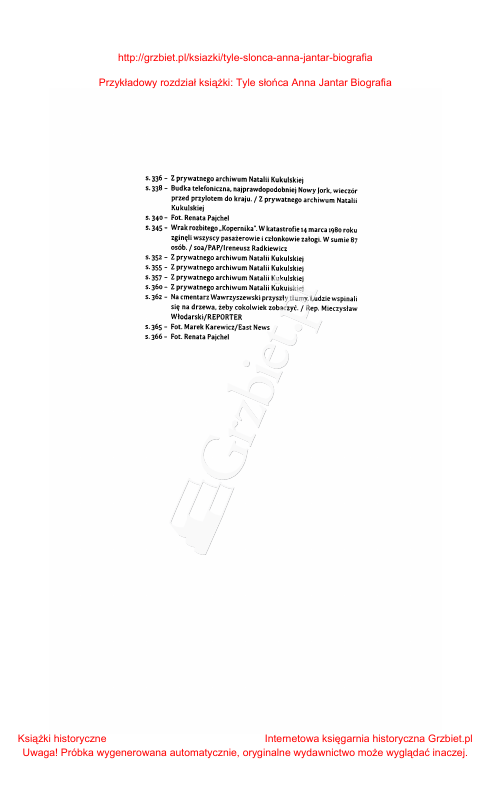http://grzbiet.pl/ksiazki/tyle-slonca-anna-jantar-biografia Przykładowy rozdział książki: Tyle słońca Anna Jantar Biografia s.336- Z prywatnego archiwum Natalii KukuiskleJ s. 338 - Budka telefoniczna, najprawdopodobniej Nowy Jork, wieczór przed przylotem do kraju./ Z prywatnego archiwum Natah• Kukuisklej s.340- Fot.RenataPajchel s. 345 - Wrak rozbitego .. Kopernika". W katastrofie 14 marca 1980 roku zginęli wszyscy pasazerowie 1 członkowie załogt. W sumie 87 osób./ soa/PAP/Ireneusz Radkiewicz s.352- Z prywatnegoarchiwum Natalii KukuiskleJ s. 355- Z prywatnego archiwum Natalii KukuiskteJ s. 357- Z prywatnego archiwum Natalii KukulskieJ s. 360- Z prywatnego archiwum Natalii Kukulskiej s. 36Z - Na cmentarz Wawrzyszewski przyszły tłumy. Ludzie wspmah się na drzewa, zeby cokolw1ek zobaczyć./ Rep. Mieczysław Włodarski/REPORTER s.365- Fot. Marek KarewiczfEast News s.366- Fot.RenataPajchel Książki historyczne Internetowa księgarnia historyczna Grzbiet.pl Uwaga! Próbka wygenerowana automatycznie, oryginalne wydawnictwo może wyglądać inaczej. http://grzbiet.pl/ksiazki/tyle-slonca-anna-jantar-biografia Przykładowy rozdział książki: Tyle słońca Anna Jantar Biografia SPIS TREŚCI Rozdział l l Rozdział li 9 l 39 III l 75 109 Rozdział IV l 153 Rozdział V l 177 Rozdział VI l zo7 Rozdz1ał VII l 251 Rozdział VIII l Rozdział IX 1 291 341 Rozdział X l Rozdział Podziękowania l 369 Przypisy l 371 Bibliografia l 381 Indeks nazwisk l 385 Spis ilustracji l 393 Książki historyczne Internetowa księgarnia historyczna Grzbiet.pl Uwaga! Próbka wygenerowana automatycznie, oryginalne wydawnictwo może wyglądać inaczej. http://grzbiet.pl/ksiazki/tyle-slonca-anna-jantar-biografia Przykładowy rozdział książki: Tyle słońca Anna Jantar Biografia pod Wezwaniem, Quorum, Pro-Contra, Canon-Rytm, Zespół Ludowy z Bukowiny Tatrzańskiej oraz Waganci. Oceny dzieła były rozmaite: od zachwytów po daleko co do intencji twórców. idącą podejrzliwość, zwłaszcza Na współczesnym popularnym portalu filmowym użyt kownik kryjący się pod pseudonimem .. robu" zacytuje opinię Andrzeja Dorobka: .,W konwencji filmowej ballady alergicznie uczulony na handlarz Karol Bu lak poszukuje drogocennej gitary muzykę pod nazwą Laura. W roli narratora zespół No To Co. Istnieją jednak względy, dla których ta słaba komedyjka zasługuje na refleksję. Chodzi o centralny epizod filmu- festiwal pio senki w Bieszczadach, będący całkowicie zmistyfikowanym obrazem rodzimej muzyki młodzieżowej okresu wczesno gierkowskiego. Choć wyzwolona już z bigbitowej sztampy i, dzięki płytom w rodzaju Korowodu (1970} zespołu Anawa czy Niemen Enigmatic, osiągająca dojrzałość artystyczną i pokoleniową- w filmie reprezentowana jest między inny mi przez No To Co, jeden z najmniej wiarygodnych reliktów okresu »mocnego uderzenia•~. oraz Halinę Kowalską, która głosem Jolanty Kubickiej śpiewa piosenkę przebijającą naj bardziej infantylne produkcje Kasi Sobczyk, i żeński ze spół wokalny Pro Contra, kwintesencję szmiry estradowej wczesnych lat siedemdziesiątych. Trudno jednoznacznie rozstrzygnąć, czy owa mistyfikacja to tylko dowód braku elementarnego rozeznania twórców filmu w realiach ów czesnej młodzieżowej kultury muzycznej, czy też przykład odgórnie ukierunkowanej tendencyjności"'"'. Choć nie brzmi to najlepiej, w roku 2014 film odtwa rzają na You1'ube ci, którzy PRL-u nie przeżyli, ale chcą go ". Książki historyczne Internetowa księgarnia historyczna Grzbiet.pl Uwaga! Próbka wygenerowana automatycznie, oryginalne wydawnictwo może wyglądać inaczej. http://grzbiet.pl/ksiazki/tyle-slonca-anna-jantar-biografia Przykładowy rozdział książki: Tyle słońca Anna Jantar Biografia Milion za Laurędaje złudzenie, że było radośnie, kolorowo i dość beztrosko. Milion za Laurę jest również ilustracją okresu, gdy chciano w muzyce reaktywować powrót do tradycji i na łono natury (pojawiająca się w Milionie... góralszczyzna). Interesujący fragment zaczyna się od około siedemdzie siątej szóstej minuty. Na tle bieszczadzkiego lasu pojawia się robiąca ćwierćprzysiady wokalistka w towarzystwie sześciu muzyków odzianych w wojskowe stroje. Kobieta wykonuje zaangażowaną politycznie pieśń Czujna straż. Nie będzie to ani ważny, ani udany występ. Ania z Wagantami migną ledwie na kilka sekund. Piosenka nie przebije się do świadomości pu bliczności i fanów, którzy cenią Wagantów przede wszystkim za jeden hit- Co ja w tobie widziałam. posmakować. 1)rmczasem do Kukulskich, do mieszkania na Kasprzaka, tra fił pies. Dostali go, a może kupili- pani Halinka nie pamięta dokładnie. Czarny pudel. nazywał się Kruczek. Nie wiadomo, kto bardziej chciał mieć psa. Być może oboje Kukulscy? Kruczek był miłym psiakiem. Ania i Jarek brali go ze sobą w trasy, ale Kruczek niszczył rzeczy. Raz z nerwów, a może in nych emocji, pogryzł dywan, innym razem podziurawił kołdrę. -Robił bardzo dużo szkód- stwierdza pani Halinka. Wkońcu Kruczektrafił do mamy pani Halinki, babci Zofii, babuni, która przychodziła czasem do domu Szmeterlingów i pomagała w sprawunkach. Pies i babunia bardzo się do siebie przywiązali. 135 Książki historyczne Internetowa księgarnia historyczna Grzbiet.pl Uwaga! Próbka wygenerowana automatycznie, oryginalne wydawnictwo może wyglądać inaczej.