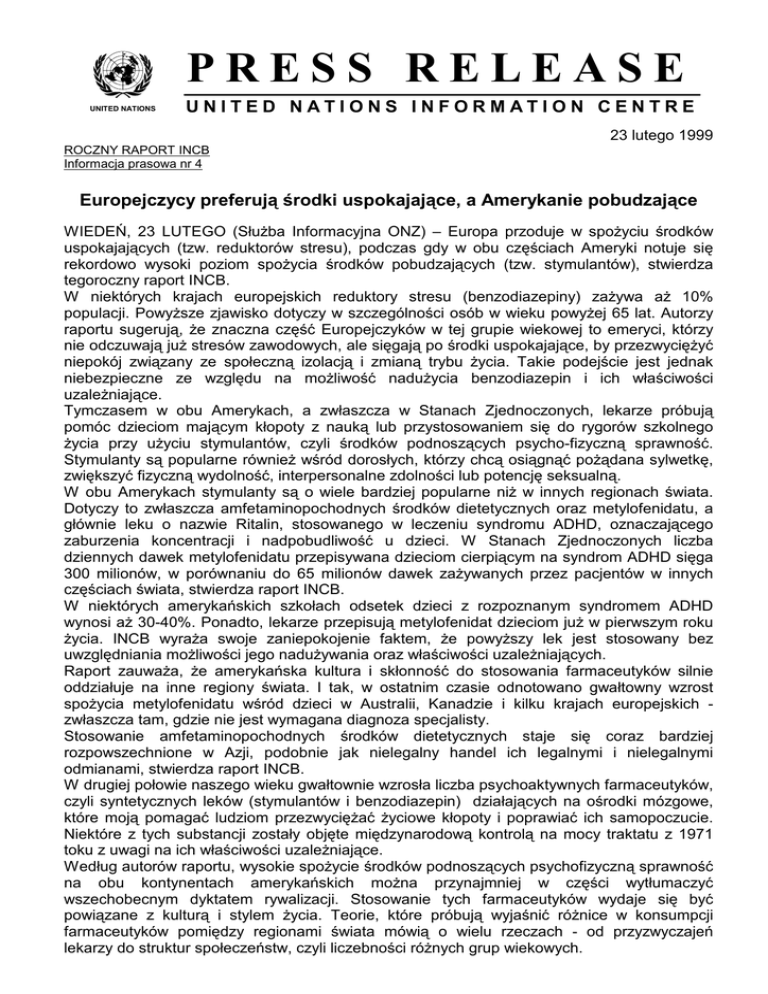 PRESS RELEASE UNITED NATIONS UNITED NATIONS INFORMATION CENTRE 23 lutego 1999 ROCZNY RAPORT INCB Informacja prasowa nr 4 Europejczycy preferują środki uspokajające, a Amerykanie pobudzające WIEDEŃ, 23 LUTEGO (Służba Informacyjna ONZ) – Europa przoduje w spożyciu środków uspokajających (tzw. reduktorów stresu), podczas gdy w obu częściach Ameryki notuje się rekordowo wysoki poziom spożycia środków pobudzających (tzw. stymulantów), stwierdza tegoroczny raport INCB. W niektórych krajach europejskich reduktory stresu (benzodiazepiny) zażywa aż 10% populacji. Powyższe zjawisko dotyczy w szczególności osób w wieku powyżej 65 lat. Autorzy raportu sugerują, że znaczna część Europejczyków w tej grupie wiekowej to emeryci, którzy nie odczuwają już stresów zawodowych, ale sięgają po środki uspokajające, by przezwyciężyć niepokój związany ze społeczną izolacją i zmianą trybu życia. Takie podejście jest jednak niebezpieczne ze względu na możliwość nadużycia benzodiazepin i ich właściwości uzależniające. Tymczasem w obu Amerykach, a zwłaszcza w Stanach Zjednoczonych, lekarze próbują pomóc dzieciom mającym kłopoty z nauką lub przystosowaniem się do rygorów szkolnego życia przy użyciu stymulantów, czyli środków podnoszących psycho-fizyczną sprawność. Stymulanty są popularne również wśród dorosłych, którzy chcą osiągnąć pożądana sylwetkę, zwiększyć fizyczną wydolność, interpersonalne zdolności lub potencję seksualną. W obu Amerykach stymulanty są o wiele bardziej popularne niż w innych regionach świata. Dotyczy to zwłaszcza amfetaminopochodnych środków dietetycznych oraz metylofenidatu, a głównie leku o nazwie Ritalin, stosowanego w leczeniu syndromu ADHD, oznaczającego zaburzenia koncentracji i nadpobudliwość u dzieci. W Stanach Zjednoczonych liczba dziennych dawek metylofenidatu przepisywana dzieciom cierpiącym na syndrom ADHD sięga 300 milionów, w porównaniu do 65 milionów dawek zażywanych przez pacjentów w innych częściach świata, stwierdza raport INCB. W niektórych amerykańskich szkołach odsetek dzieci z rozpoznanym syndromem ADHD wynosi aż 30-40%. Ponadto, lekarze przepisują metylofenidat dzieciom już w pierwszym roku życia. INCB wyraża swoje zaniepokojenie faktem, że powyższy lek jest stosowany bez uwzględniania możliwości jego nadużywania oraz właściwości uzależniających. Raport zauważa, że amerykańska kultura i skłonność do stosowania farmaceutyków silnie oddziałuje na inne regiony świata. I tak, w ostatnim czasie odnotowano gwałtowny wzrost spożycia metylofenidatu wśród dzieci w Australii, Kanadzie i kilku krajach europejskich zwłaszcza tam, gdzie nie jest wymagana diagnoza specjalisty. Stosowanie amfetaminopochodnych środków dietetycznych staje się coraz bardziej rozpowszechnione w Azji, podobnie jak nielegalny handel ich legalnymi i nielegalnymi odmianami, stwierdza raport INCB. W drugiej połowie naszego wieku gwałtownie wzrosła liczba psychoaktywnych farmaceutyków, czyli syntetycznych leków (stymulantów i benzodiazepin) działających na ośrodki mózgowe, które moją pomagać ludziom przezwyciężać życiowe kłopoty i poprawiać ich samopoczucie. Niektóre z tych substancji zostały objęte międzynarodową kontrolą na mocy traktatu z 1971 toku z uwagi na ich właściwości uzależniające. Według autorów raportu, wysokie spożycie środków podnoszących psychofizyczną sprawność na obu kontynentach amerykańskich można przynajmniej w części wytłumaczyć wszechobecnym dyktatem rywalizacji. Stosowanie tych farmaceutyków wydaje się być powiązane z kulturą i stylem życia. Teorie, które próbują wyjaśnić różnice w konsumpcji farmaceutyków pomiędzy regionami świata mówią o wielu rzeczach - od przyzwyczajeń lekarzy do struktur społeczeństw, czyli liczebności różnych grup wiekowych. Autorzy raportu INCB utrzymują, że wzorce spożycia farmaceutyków mogą być zależne od wpływu kultury na relację lekarz – pacjent. Europejscy lekarze mogą być powściągliwi w przepisywaniu amfetamin ze względu na żywą jeszcze pamięć o powszechnym nadużywaniu tych środków w latach 60-tych i 70-tych. Tymczasem, ich amerykańscy koledzy widać zapomnieli o tych zjawiskach, natomiast są bardziej ostrożni w stosunku do benzodiazepin. Agresywne reklamy stosowane przez niektóre firmy farmaceutyczne mają silny wpływ na świadomość zarówno lekarzy jak i pacjentów, stwierdza raport INCB. Z kolei Internet umożliwia szybkie rozprzestrzenianie się trendów w spożyciu farmaceutyków bez dokładnej diagnozy ich przydatności i analizy długookresowych skutków ich zażywania. INCB wzywa społeczność lekarską, urzędników służby zdrowia i organizacje ochrony konsumentów do bardziej aktywnego uczestnictwa w określaniu właściwej skali spożycia tych środków w ich krajach. Leczenie farmakologiczne może często być najprostszym rozwiązaniem, które pomija jednak prawdziwe przyczyny zaburzeń.
