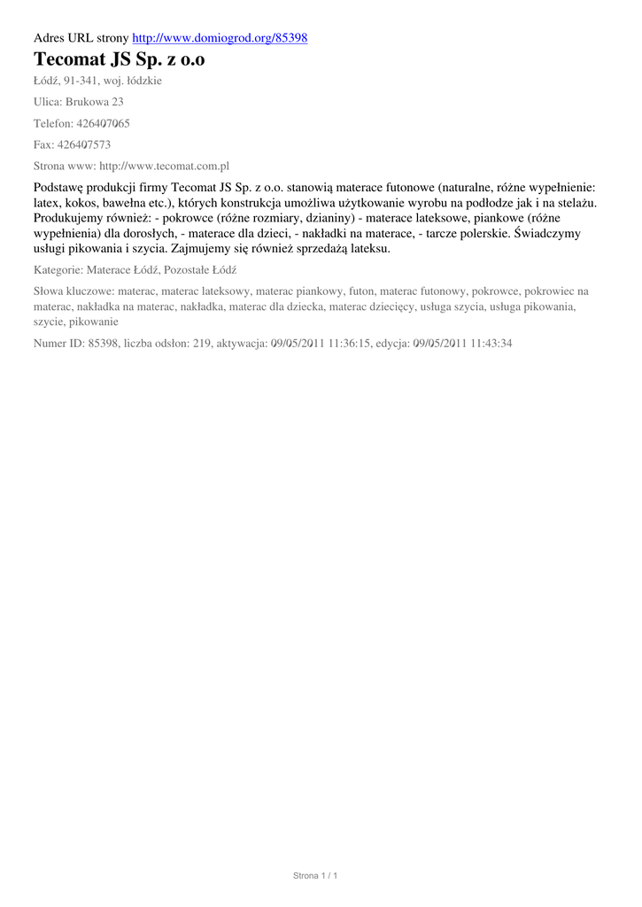 Adres URL strony http://www.domiogrod.org/85398 Tecomat JS Sp. z o.o Łódź, 91-341, woj. łódzkie Ulica: Brukowa 23 Telefon: 426407065 Fax: 426407573 Strona www: http://www.tecomat.com.pl Podstawę produkcji firmy Tecomat JS Sp. z o.o. stanowią materace futonowe (naturalne, różne wypełnienie: latex, kokos, bawełna etc.), których konstrukcja umożliwa użytkowanie wyrobu na podłodze jak i na stelażu. Produkujemy również: - pokrowce (różne rozmiary, dzianiny) - materace lateksowe, piankowe (różne wypełnienia) dla dorosłych, - materace dla dzieci, - nakładki na materace, - tarcze polerskie. Świadczymy usługi pikowania i szycia. Zajmujemy się również sprzedażą lateksu. Kategorie: Materace Łódź, Pozostałe Łódź Słowa kluczowe: materac, materac lateksowy, materac piankowy, futon, materac futonowy, pokrowce, pokrowiec na materac, nakładka na materac, nakładka, materac dla dziecka, materac dziecięcy, usługa szycia, usługa pikowania, szycie, pikowanie Numer ID: 85398, liczba odsłon: 219, aktywacja: 09/05/2011 11:36:15, edycja: 09/05/2011 11:43:34 Strona 1 / 1