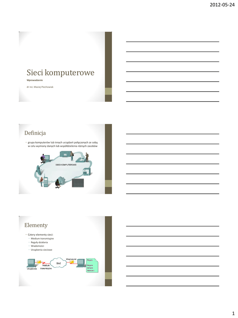 2012-05-24 Sieci komputerowe Wprowadzenie dr inż. Maciej Piechowiak Definicja • grupa komputerów lub innych urządzeń połączonych ze sobą w celu wymiany danych lub współdzielenia różnych zasobów Elementy • Cztery elementy sieci: • • • • Medium transmisyjne Reguły działania Wiadomości Urządzenia sieciowe 1 2012-05-24 Urządzenia sieciowe Połączenia sieciowe Reguły 2 2012-05-24 Topologie sieci Topologie fizyczne: Topologie logiczne: - rozgłaszanie - przekazywanie tokenu Sieci telekomunikacyjne Sieci telekomunikacyjne sieci telefoniczne sieci komputerowe 3 2012-05-24 Sieci konwergentne • Przepływ głosu, wideo i danych w jednej sieci eliminuje potrzebę tworzenia i zarządzania oddzielnymi sieciami Architektura sieci • Tolerancja błędu – ograniczenie zasięgu błędu lub uszkodzenia (połączenia nadmiarowe) Architektura sieci • Skalowalność – dzięki hierarchicznemu, warstwowemu projektowi infrastruktury fizycznej i architektury logicznej 4 2012-05-24 Architektura sieci • Jakość usług – wymagania w sieciach konwergentnych zmieniają sposób projektowania architektury sieciowej Architektura sieci • Bezpieczeństwo sieci – przy przesyłaniu krytycznych i poufnych danych Sieci połączeniowe • Przełączanie obwodów (duża ilość obwodów, przy dużym natężeniu połączeń nie wszystkie są realizowane) 5 2012-05-24 Sieci bezpołączeniowe • Przełączanie pakietów (duże opóźnienia przy dużym ruchu, dane zostaną dostarczone) Szerokość pasma • • • • • bps kbps Mbps Gbps Tbps Szerokość pasma 6 2012-05-24 Szerokość pasma Szerokość pasma Szerokość pasma Niektórymi spośród czynników mających wpływ na przepustowość są: • • • • • • • urządzenia sieciowe, typ przesyłanych danych, topologia sieci, liczba użytkowników sieci, komputer użytkownika, komputer pracujący jako serwer, warunki zasilania. Różnica: pasmo a przepływność !!! 7 2012-05-24 QoS QoS Tor komunikacyjny urządzenia sieciowe, media, usługi 8 2012-05-24 Urządzenia pośredniczące • Urządzenia pośredniczące: • urządzenia dostępowe (koncentratory, przełączniki, bezprzewodowe punkty dostępowe), • urządzenia łączące sieci (routery), • serwery komunikacyjne i modemy, • urządzenia zapewniające bezpieczeństwo (firewalle). Urządzenia pośredniczące • Procesy w urządzeniach pośredniczących: • regenerują i przekazują sygnały danych, • utrzymują informację o ścieżkach transmisyjnych istniejących w sieci i intersieci, • powiadamiają inne urządzenia o błędach i awariach w komunikacji, • kierują dane alternatywnymi ścieżkami w sytuacji awarii łączy, • klasyfikują i kierują wiadomości zgodnie z priorytetami QoS, • umożliwiają lub blokują przepływ danych, kierując się ustawieniami bezpieczeństwa. Podział sieci 9 2012-05-24 Internet vs intranet Protokoły sieciowe • Zestawy protokołów sieciowych opisują następujące procesy: • format lub strukturę wiadomości, • metodę wymiany informacji między urządzeniami sieciowymi po ścieżkach prowadzących do innych sieci, • W jaki sposób i kiedy urządzenia sieciowe wysyłają sobie informacje systemowe lub informacje o błędach, • nawiązywanie i kończenie sesji komunikacyjnych. Standardy protokołów 10 2012-05-24 Modele odniesienia Model OSI Model OSI 11 2012-05-24 Model OSI Model OSI • dzieli proces komunikacji sieciowej na mniejsze, łatwiejsze do zarządzania elementy składowe, • tworzy standardy składników sieci, dzięki czemu składniki te mogą być rozwijane i obsługiwane przez różnych producentów, • umożliwia wzajemną komunikację sprzętu i oprogramowania sieciowego różnych rodzajów, • zmiany wprowadzone w jednej warstwie nie dotyczą innych warstw, • dzieli proces komunikacji sieciowej na mniejsze składowe, co pozwala na łatwiejsze jego zrozumienie. Model TCP/IP 12 2012-05-24 Model TCP/IP Jednostki danych protokołu • Dane aplikacji przekazywane są w dół stosu protokołów, • Na każdym z poziomów protokoły dodają swoje informacje do momentu transmisji danych przez medium, • Ten proces powszechnie określa się jako enkapsulację. • Forma jaką przyjmują dane w każdej z warstw nazywana jest jednostką danych protokołu - PDU (ang. Protocol Data Unit), • Podczas enkapsulacji każda z kolejnych warstw enkapsuluje PDU, które otrzymała z wyższej warstwy zgodnie z użytym protokołem, • Na każdym kroku tego procesu, PDU przyjmuje inną nazwę aby odzwierciedlić nową formę, Jednostki danych protokołu • Dane - ogólne określenie dla PDU używane w warstwie aplikacji. • Segment - PDU warstwy transportowej. • Pakiet (ang. Packet) - PDU warstwy sieci. • Ramka (ang. Frame) - PDU warstwy dostępu do sieci. • Bity (ang. Bits) - PDU używane podczas fizycznej transmisji danych poprzez medium. 13 2012-05-24 Enkapsulacja Adresowanie Warstwa fizyczna - okablowanie 14