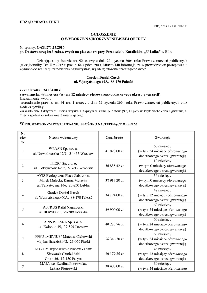 URZĄD MIASTA EŁKU Ełk, dnia 12.08.2016 r. OGŁOSZENIE O WYBORZE NAJKORZYSTNIEJSZEJ OFERTY Nr sprawy: O-ZP.271.23.2016 pn. Dostawa urządzeń zabawowych na plac zabaw przy Przedszkolu Katolickim „U Lolka” w Ełku Działając na podstawie art. 92 ustawy z dnia 29 stycznia 2004 roku Prawo zamówień publicznych (tekst jednolity, Dz. U z 2015 r. poz. 2164 z późn. zm.), Miasto Ełk informuje, że w prowadzonym postępowaniu wybrano do realizacji zamówienia najkorzystniejszą ofertę złożoną przez wykonawcę: Garden Daniel Gacek ul. Wyszyńskiego 60A, 88-170 Pakość z ceną brutto: 34 194,00 zł z gwarancją: 48 miesięcy (w tym 12 miesięcy oferowanego dodatkowego okresu gwarancji) Uzasadnienie wyboru: -uzasadnienie prawne: art. 91 ust. 1 ustawy z dnia 29 stycznia 2004 roku Prawo zamówień publicznych oraz Kodeks cywilny -uzasadnienie faktyczne: Oferta uzyskała najwyższą sumę punktów (97,00 pkt) w kryteriach: cena i gwarancja. Oferta spełnia oczekiwania Zamawiającego. W PROWADZONYM POSTĘPOWANIU ZŁOŻONO NASTĘPUJĄCE OFERTY: Nr ofer ty Nazwa wykonawcy 1 WERAN Sp. z o. o. ul. Nowodworska 12/9, 54-433 Wrocław 41 820,00 zł 2 „FIOR” Sp. z o. o. ul. Odkrywców 1-3/5, 53-212 Wrocław 56 838,42 zł 3 AVIS Ekologiczne Place Zabaw s.c. Marek Małecki, Karina Małecka ul. Turystyczna 106, 20-230 Lublin 38 917,20 zł 4 Garden Daniel Gacek ul. Wyszyńskiego 60A, 88-170 Pakość 34 194,00 zł 5 ASTRUS Rafał Nagrabecki ul. BOWiD 9E, 75-209 Koszalin 39 900,00 zł 6 APIS POLSKA Sp. z o. o. ul. Koloniki 19, 37-500 Jarosław 40 235,76 zł 7 PPHU „MEVIUS” Mateusz Cichowski Majdan Brzezicki 42, 21-050 Piaski 56 346,30 zł 8 9 NOVUM Wyposażenie Placów Zabaw Sławomir Chmieliński Grom 36, 12-130 Pasym MAJA s.c. Ewelina Piotrowska, Łukasz Piotrowski Cena brutto 60 179,35 zł 38 480,00 zł Gwarancja 60 miesięcy (w tym 24 miesiące oferowanego dodatkowego okresu gwarancji) 12 miesięcy (w tym 0 miesięcy oferowanego dodatkowego okresu gwarancji) 36 miesięcy (w tym 0 miesięcy oferowanego dodatkowego okresu gwarancji) 48 miesięcy (w tym 12 miesięcy oferowanego dodatkowego okresu gwarancji) 60 miesięcy (w tym 24 miesiące oferowanego dodatkowego okresu gwarancji) 60 miesięcy (w tym 24 miesiące oferowanego dodatkowego okresu gwarancji) 60 miesięcy (w tym 24 miesiące oferowanego dodatkowego okresu gwarancji) 48 miesięcy (w tym 12 miesięcy oferowanego dodatkowego okresu gwarancji) 60 miesięcy (w tym 24 miesiące oferowanego ul. Świetokrzyska 30/63, 00-116 Warszawa dodatkowego okresu gwarancji) 10 DREWNOGRÓD Robert Lis Podzamcze, ul. Źródlana 14, 26-065 Piekoszów 49 600,00 zł 11 CROQUET Sp. z o. o. Szczodre, ul. Trzebnicka 81, 55-095 Mirków 59 469,38 zł 12 FreeKids s.c. A. Gąsiorek, Z. Andruszewski Trzęsowice 32, 55-106 Zawonia 56 707,18 zł 48 miesięcy (w tym 12 miesięcy oferowanego dodatkowego okresu gwarancji) 48 miesięcy (w tym 12 miesięcy oferowanego dodatkowego okresu gwarancji) 60 miesięcy (w tym 24 miesiące oferowanego dodatkowego okresu gwarancji) W PROWADZONYM POSTĘPOWANIU DOKONANO ODRZUCENIA OFERTY: - oferta nr 11, wykonawcy CROQUET Sp. z o. o., Szczodre, Trzebnicka 81, 55-095 Mirków Uzasadnienie prawne: podstawie art. 89 ust. 1 pkt 2 ustawy Prawo zamówień publicznych Uzasadnienie faktyczne: Wykonawca załączył do oferty karty katalogowe oferowanych urządzeń, z których wynika, że oferuje m.in. Zestaw MM-0613/2, który w rzucie poziomym ma wymiar 3,85x3,85m, co nie spełnia wymagań specyfikacji istotnych warunków zamówienia, ponieważ wymagany przez Zamawiającego wymiar dla takiej zabawki wynosi 5,35x4,70m; oraz Domek 7 MM-0700, który nie spełnia wymagań specyfikacji istotnych warunków zamówienia, ponieważ dla takiej zabawki wymagane było wyposażenie jej m.in. w przejście tunelowe, grę w kółko-krzyżyk, ścianki wspinaczkowe 2szt. – oferowany przez wykonawcę domek nie posiada tych elementów. W związku z powyższy oferta wykonawcy podlega odrzuceniu, jako iż jej treść nie odpowiada treści specyfikacji istotnych warunków zamówienia. W PROWADZONYM POSTĘPOWANIU DOKONANO WYKLUCZENIA WYKONAWCY: - ASTRUS Rafał Nagrabecki, ul. BOWiD 9E, 75-209 Koszalin Uzasadnienie prawne: art. 24b ust. 3 ustawy Prawo zamówień publicznych Uzasadnienie faktyczne: Zamawiający w Specyfikacji Istotnych Warunków Zamówienia wymagał złożenia wraz z ofertą listy podmiotów należących do tej samej grupy kapitałowej albo informację o tym, że nie należy do grupy kapitałowej; Wykonawca nie załączył przedmiotowego dokumentu do złożonej oferty. Zamawiający w trybie art. 26 ust. 3 ustawy Prawo zamówień publicznych, wezwał wykonawcę do złożenia tego dokumentu; Wykonawca miał 3 dni od dnia otrzymania wezwania (wykonawca otrzymał wezwanie 05.08.2016 r.), tj. do dnia 08.08.2016 r. na uzupełnienie oferty o brakujący dokument. Wykonawca w tym terminie nie dokonał uzupełnienia. W związku z powyższym wykonawca podlega wykluczeniu, jako iż nie złożył listy, o której mowa w art. 26 ust. 2d (lista podmiotów należących do tej samej grupy kapitałowej. PUNKTACJA PRZYZNANA OFERTOM SPEŁNIAJĄCYM WSZYSTKIE WYMAGANIA ZAWARTE W SIWZ: Firma (nazwa) lub nazwisko oraz adres wykonawcy Liczba pkt w kryterium Cena Liczba pkt w kryterium Gwarancja Razem punkty 1 WERAN Sp. z o. o. ul. Nowodworska 12/9, 54-433 Wrocław 76,86 6,00 82,86 2 „FIOR” Sp. z o. o. ul. Odkrywców 1-3/5, 53-212 Wrocław 56,55 0,00 56,55 3 AVIS Ekologiczne Place Zabaw s.c. Marek Małecki, Karina Małecka ul. Turystyczna 106, 20-230 Lublin 82,59 0,00 82,59 4 Garden Daniel Gacek 94,00 3,00 97,00 Numer oferty ul. Wyszyńskiego 60A, 88-170 Pakość 6 APIS POLSKA Sp. z o. o. ul. Koloniki 19, 37-500 Jarosław 79,89 6,00 85,89 7 PPHU „MEVIUS” Mateusz Cichowski Majdan Brzezicki 42, 21-050 Piaski 57,04 6,00 63,04 8 NOVUM Wyposażenie Placów Zabaw Sławomir Chmieliński Grom 36, 12-130 Pasym 53,41 3,00 56,41 9 MAJA s.c. Ewelina Piotrowska, Łukasz Piotrowski 