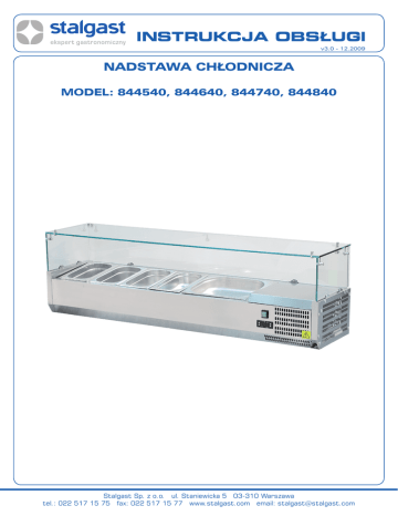 INSTRUKCJA OBSŁUGI v3.0 - 12.2009 NADSTAWA CHŁODNICZA MODEL: 844540, 844640, 844740, 844840 Stalgast Sp. z o.o. ul. Staniewicka 5 03-310 Warszawa tel.: 022 517 15 75 fax: 022 517 15 77 www.stalgast.com email: [email protected] SPIS TREŚCI 1. Instrukcje bezpieczeństwa . . . . . . . . . . . . . . . . . . . . . . . . . . . . . . . . . . . . . . . . . . . . . . . . . . . . . . . . . . . . . . . . . . . . . . . . 3 2. warunki bezpieczeństwa . . . . . . . . . . . . . . . . . . . . . . . . . . . . . . . . . . . . . . . . . . . . . . . . . . . . . . . . . . . . . . . . . . . . . . . . . . . 3 2.1. Testy końcowe i gwarancja . . . . . . . . . . . . . . . . . . . . . . . . . . . . . . . . . . . . . . . . . . . . . . . . . . . . . . . . . . . . . . . . . . . . . . . . . . . . . . . 3 2.2. Ogólne zasady bezpieczeństwa . . . . . . . . . . . . . . . . . . . . . . . . . . . . . . . . . . . . . . . . . . . . . . . . . . . . . . . . . . . . . . . . . . . . . . . . . . . 3 2.3. Prawidłowa obsługa . . . . . . . . . . . . . . . . . . . . . . . . . . . . . . . . . . . . . . . . . . . . . . . . . . . . . . . . . . . . . . . . . . . . . . . . . . . . . . . . . . . . . . 4 2.4. Zabezpieczenia . . . . . . . . . . . . . . . . . . . . . . . . . . . . . . . . . . . . . . . . . . . . . . . . . . . . . . . . . . . . . . . . . . . . . . . . . . . . . . . . . . . . . . . . . . 4 2.5. Ryzyko kontaktu z częściami będącymi w ruchu . . . . . . . . . . . . . . . . . . . . . . . . . . . . . . . . . . . . . . . . . . . . . . . . . . . . . . . . . . 4 2.6. Ryzyko porażenia prądem elektrycznym . . . . . . . . . . . . . . . . . . . . . . . . . . . . . . . . . . . . . . . . . . . . . . . . . . . . . . . . . . . . . . . . . . 4 3. Budowa . . . . . . . . . . . . . . . . . . . . . . . . . . . . . . . . . . . . . . . . . . . . . . . . . . . . . . . . . . . . . . . . . . . . . . . . . . . . . . . . . . . . . . . . . . . . . . . . . . . 4 3.1. Opis urządzenia . . . . . . . . . . . . . . . . . . . . . . . . . . . . . . . . . . . . . . . . . . . . . . . . . . . . . . . . . . . . . . . . . . . . . . . . . . . . . . . . . . . . . . . . . . 4 4. Dane Techniczne . . . . . . . . . . . . . . . . . . . . . . . . . . . . . . . . . . . . . . . . . . . . . . . . . . . . . . . . . . . . . . . . . . . . . . . . . . . . . . . . . . . . . . 4 5. Montaż . . . . . . . . . . . . . . . . . . . . . . . . . . . . . . . . . . . . . . . . . . . . . . . . . . . . . . . . . . . . . . . . . . . . . . . . . . . . . . . . . . . . . . . . . . . . . . . . . . . 4 5.1. Instrukcje dotyczące rozpakowania . . . . . . . . . . . . . . . . . . . . . . . . . . . . . . . . . . . . . . . . . . . . . . . . . . . . . . . . . . . . . . . . . . . . . . . 4 5.2. Podłączenie elektryczne . . . . . . . . . . . . . . . . . . . . . . . . . . . . . . . . . . . . . . . . . . . . . . . . . . . . . . . . . . . . . . . . . . . . . . . . . . . . . . . . . . 5 5.3. Montaż szyb . . . . . . . . . . . . . . . . . . . . . . . . . . . . . . . . . . . . . . . . . . . . . . . . . . . . . . . . . . . . . . . . . . . . . . . . . . . . . . . . . . . . . . . . . . . . . 5 6. Schemat elektryczny . . . . . . . . . . . . . . . . . . . . . . . . . . . . . . . . . . . . . . . . . . . . . . . . . . . . . . . . . . . . . . . . . . . . . . . . . . . . . . . . 5 7. TRANSPORT I MAGAZYNOWANIE . . . . . . . . . . . . . . . . . . . . . . . . . . . . . . . . . . . . . . . . . . . . . . . . . . . . . . . . . . . . . . . . . . . . . . 6 8. Obsługa . . . . . . . . . . . . . . . . . . . . . . . . . . . . . . . . . . . . . . . . . . . . . . . . . . . . . . . . . . . . . . . . . . . . . . . . . . . . . . . . . . . . . . . . . . . . . . . . . . 6 8.1. Funkcje przycisków . . . . . . . . . . . . . . . . . . . . . . . . . . . . . . . . . . . . . . . . . . . . . . . . . . . . . . . . . . . . . . . . . . . . . . . . . . . . . . . . . . . . . . . 7 8.2. Funkcje wyświetlacza . . . . . . . . . . . . . . . . . . . . . . . . . . . . . . . . . . . . . . . . . . . . . . . . . . . . . . . . . . . . . . . . . . . . . . . . . . . . . . . . . . . . 7 8.3. Wskaźniki LED . . . . . . . . . . . . . . . . . . . . . . . . . . . . . . . . . . . . . . . . . . . . . . . . . . . . . . . . . . . . . . . . . . . . . . . . . . . . . . . . . . . . . . . . . . . 7 8.4. Wyświetlanie ustawionej temperatury komory . . . . . . . . . . . . . . . . . . . . . . . . . . . . . . . . . . . . . . . . . . . . . . . . . . . . . . . . . . . . 7 8.5. Wyświetlanie temperatury parownika . . . . . . . . . . . . . . . . . . . . . . . . . . . . . . . . . . . . . . . . . . . . . . . . . . . . . . . . . . . . . . . . . . . . 8 8.6. Zmiana ustawienia temperatury komory . . . . . . . . . . . . . . . . . . . . . . . . . . . . . . . . . . . . . . . . . . . . . . . . . . . . . . . . . . . . . . . . . 8 8.7. Zmiana parametrów konfiguracyjnych . . . . . . . . . . . . . . . . . . . . . . . . . . . . . . . . . . . . . . . . . . . . . . . . . . . . . . . . . . . . . . . . . . . . 8 8.8. Blokowanie i odblokowywanie klawiatury . . . . . . . . . . . . . . . . . . . . . . . . . . . . . . . . . . . . . . . . . . . . . . . . . . . . . . . . . . . . . . . . . 8 9. Dodatkowe informacje . . . . . . . . . . . . . . . . . . . . . . . . . . . . . . . . . . . . . . . . . . . . . . . . . . . . . . . . . . . . . . . . . . . . . . . . . . . . . . 9 10.Czyszczenie i konserwacja . . . . . . . . . . . . . . . . . . . . . . . . . . . . . . . . . . . . . . . . . . . . . . . . . . . . . . . . . . . . . . . . . . . . . . . . . 9 10.1. Instrukcje rutynowej konserwacji . . . . . . . . . . . . . . . . . . . . . . . . . . . . . . . . . . . . . . . . . . . . . . . . . . . . . . . . . . . . . . . . . . . . . . . . 9 10.2. Czyszczenie urządzenia . . . . . . . . . . . . . . . . . . . . . . . . . . . . . . . . . . . . . . . . . . . . . . . . . . . . . . . . . . . . . . . . . . . . . . . . . . . . . . . . . 9 10.3. Filtr skraplacza . . . . . . . . . . . . . . . . . . . . . . . . . . . . . 
