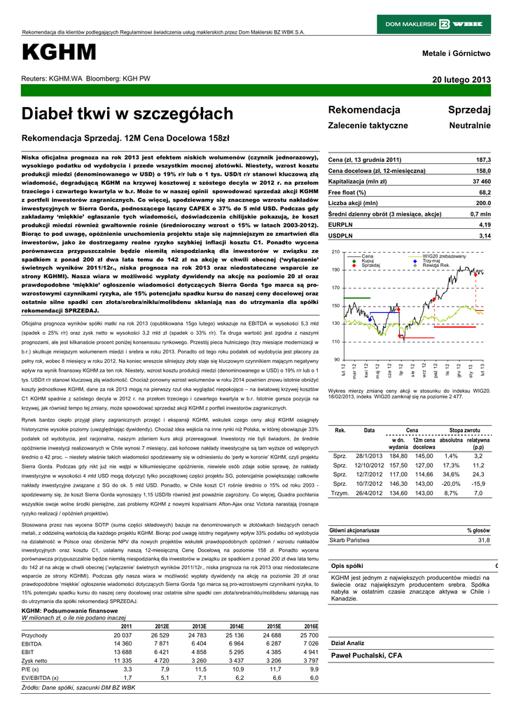Rekomendacja dla klientów podlegających Regulaminowi świadczenia usług maklerskich przez Dom Maklerski BZ WBK S.A. KGHM Metale i Górnictwo Reuters: KGHM.WA Bloomberg: KGH PW 20 lutego 2013 Diabeł tkwi w szczegółach Rekomendacja Sprzedaj Zalecenie taktyczne Neutralnie Rekomendacja Sprzedaj. 12M Cena Docelowa 158zł Niska oficjalna prognoza na rok 2013 jest efektem niskich wolumenów (czynnik jednorazowy), wysokiego podatku od wydobycia i przede wszystkim mocnej złotówki. Niestety, wzrost kosztu produkcji miedzi (denominowanego w USD) o 19% r/r lub o 1 tys. USD/t r/r stanowi kluczową złą Cena (zł, 13 grudnia 2011) 187,3 Cena docelowa (zł, 12-miesięczna) 158,0 wiadomość, degradującą KGHM na krzywej kosztowej z szóstego decyla w 2012 r. na przełom Kapitalizacja (mln zł) trzeciego i czwartego kwartyla w b.r. MoŜe to w naszej opinii spowodować sprzedaŜ akcji KGHM Free float (%) z portfeli inwestorów zagranicznych. Co więcej, spodziewamy się znacznego wzrostu nakładów inwestycyjnych w Sierra Gorda, podnoszącego łączny CAPEX o 37% do 5 mld USD. Podczas gdy 37 460 68,2 Liczba akcji (mln) 200.0 zakładamy ‘miękkie’ ogłaszanie tych wiadomości, doświadczenia chilijskie pokazują, Ŝe koszt Średni dzienny obrót (3 miesiące, akcje) produkcji miedzi równieŜ gwałtownie rośnie (średnioroczny wzrost o 15% w latach 2003-2012). EURPLN 0,7 mln 4,19 Biorąc to pod uwagę, opóźnienie uruchomienia projektu staje się najmniejszym ze zmartwień dla USDPLN 3,14 inwestorów, jako Ŝe dostrzegamy realne ryzyko szybkiej inflacji kosztu C1. Ponadto wycena porównawcza przypuszczalnie będzie niemiłą niespodzianką dla inwestorów w związku ze 210 Cena Kupuj Sprzedaj spadkiem z ponad 200 zł dwa lata temu do 142 zł na akcję w chwili obecnej (‘wyłączenie’ świetnych wyników 2011/12r., niska prognoza na rok 2013 oraz niedostateczne wsparcie ze WIG20 zrebazowany Trzy maj Rewizja Rek. 190 strony KGHMI). Nasza wiara w moŜliwość wypłaty dywidendy na akcję na poziomie 20 zł oraz prawdopodobne ‘miękkie’ ogłoszenie wiadomości dotyczących Sierra Gorda 1go marca są pro- 170 wzrostowymi czynnikami ryzyka, ale 15% potencjału spadku kursu do naszej ceny docelowej oraz ostatnie silne spadki cen złota/srebra/niklu/molibdenu skłaniają nas do utrzymania dla spółki 150 rekomendacji SPRZEDAJ. Oficjalna prognoza wyników spółki matki na rok 2013 (opublikowana 15go lutego) wskazuje na EBITDA w wysokości 5,3 mld 130 (spadek o 25% r/r) oraz zysk netto w wysokości 3,2 mld zł (spadek o 33% r/r). Ta druga wartość jest zgodna z naszymi prognozami, ale jest kilkanaście procent poniŜej konsensusu rynkowego. Przestój pieca hutniczego (trzy miesiące modernizacji w 110 b.r.) skutkuje mniejszym wolumenem miedzi i srebra w roku 2013. Ponadto od tego roku podatek od wydobycia jest płacony za koszty jednostkowe KGHM, dane za rok 2013 mogą na pierwszy rzut oka wyglądać niepokojąco – na światowej krzywej kosztów C1 KGHM spadnie z szóstego decyla w 2012 r. na przełom trzeciego i czwartego kwartyla w b.r. Istotnie gorsza pozycja na lut 13 gru 12 sty 13 lis 12 paź 12 wrz 12 lip 12 sie 12 cze 12 maj 12 tys. USD/t r/r stanowi kluczową złą wiadomość. ChociaŜ ponowny wzrost wolumenów w roku 2014 powinien znowu istotnie obniŜyć kwi 12 90 lut 12 wpływ na wynik finansowy KGHM za ten rok. Niestety, wzrost kosztu produkcji miedzi (denominowanego w USD) o 19% r/r lub o 1 mar 12 pełny rok, wobec 8 miesięcy w roku 2012. Na koniec wreszcie silniejszy złoty staje się kluczowym czynnikiem mającym negatywny Wykres mierzy zmianę ceny akcji w stosunku do indeksu WIG20. 18/02/2013, indeks WIG20 zamknął się na poziomie 2 477. krzywej, jak równieŜ tempo tej zmiany, moŜe spowodować sprzedaŜ akcji KGHM z portfeli inwestorów zagranicznych. Rynek bardzo ciepło przyjął plany zagranicznych przejęć i ekspansji KGHM, wskutek czego ceny akcji KGHM osiągnęły historycznie wysokie poziomy (uwzględniając dywidendy). ChociaŜ idea wejścia na inne rynki niŜ Polska, w której obowiązuje 33% Rek. Data podatek od wydobycia, jest racjonalna, naszym zdaniem kurs akcji przereagował. Inwestorzy nie byli świadomi, Ŝe średnie Cena Stopa zwrotu w dn. 12m cena absolutna relatywna wydania docelowa (p.p) opóźnienie inwestycji realizowanych w Chile wynosi 7 miesięcy, zaś końcowe nakłady inwestycyjne są tam wyŜsze od wstępnych średnio o 42 proc. – niestety właśnie takich wiadomości spodziewamy się w odniesieniu do ‘perły w koronie’ KGHM, czyli projektu Sprz. 28/1/2013 184,80 145,00 1,4% 3,2 Sierra Gorda. Podczas gdy nikt juŜ nie wątpi w kilkumiesięczne opóźnienie, niewiele osób zdaje sobie sprawę, Ŝe nakłady Sprz. 12/10/2012 157,50 127,00 17,3% 11,2 inwestycyjne w wysokości 4 mld USD mogą dotyczyć tylko początkowej części projektu SG, potencjalnie powiększając całkowite Sprz. 12/7/2012 117,00 114,66 34,6% 24,3 nakłady inwestycyjne związane z SG do ok. 5 mld USD. Ponadto, w Chile koszt C1 rośnie średnio o 15% od roku 2003 - Sprz. 10/7/2012 146,30 143,00 -20,0% -15,9 spodziewamy się, Ŝe koszt Sierra Gorda wynoszący 1,15 USD/lb równieŜ jest powaŜnie zagroŜony. Co więcej, Quadra pochłania Trzym. 26/4/2012 134,60 143,00 8,7% 7,0 wszystkie swoje wolne środki pienięŜne, zaś problemy KGHM z nowymi kopalniami Afton-Ajax oraz Victoria narastają (rosnące ryzyko realizacji / opóźnień projektów). Stosowana przez nas wycena SOTP (suma części składowych) bazuje na denominowanych w złotówkach bieŜących cenach metali, z oddzielną wartością dla kaŜdego projektu KGHM. Biorąc pod uwagę istotny negatywny wpływ 33% podatku od wydobycia Główni akcjonariusze na działalność w Polsce oraz obniŜenie NPV dla nowych projektów wskutek prawdopodobnych opóźnień / wzrostu nakładów Skarb Państwa % głosów 31,8 inwestycyjnych oraz kosztu C1, ustalamy naszą 12-miesięczną Cenę Docelową na poziomie 158 zł
