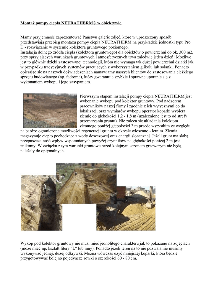 Montaż pompy ciepła NEURATHERM® w obiektywie Mamy przyjemność zaprezentować Państwu galerię zdjęć, które w uproszczony sposób przedstawiają przebieg montażu pompy ciepła NEURATHERM na przykładzie jednostki typu Pro D - rozwiązanie w systemie kolektora gruntowego poziomego. Instalacja dolnego źródła ciepła (kolektora gruntowego) dla obiektów o powierzchni do ok. 300 m2, przy sprzyjających warunkach gruntowych i atmosferycznych trwa zaledwie jeden dzień! Możliwe jest to głównie dzięki zastosowanej technologii, która nie wymaga tak dużej powierzchni działki jak w przypadku tradycyjnych systemów pracujących z wykorzystaniem glikolu lub solanki. Ponadto opierając się na naszych doświadczeniach namawiamy naszych klientów do zastosowania ciężkiego sprzętu budowlanego (np. fadroma), który gwarantuje szybkie i sprawne uporanie się z wykonaniem wykopu i jego zasypaniem. Pierwszym etapem instalacji pompy ciepła NEURATHERM jest wykonanie wykopu pod kolektor gruntowy. Pod nadzorem pracowników naszej firmy i zgodnie z ich wytycznymi co do lokalizacji oraz wymiarów wykopu operator koparki wybiera ziemię do głębokości 1,2 - 1,8 m (uzależnione jest to od strefy przemarzania gruntu). Nie zaleca się układania kolektora ziemnego poniżej głębokości 2 m przede wszystkim ze względu na bardzo ograniczone możliwości regeneracji gruntu w okresie wiosenno - letnim. Ziemia magazynuje ciepło pochodzące z wody deszczowej oraz energii słonecznej. Jeżeli grunt ma słabą przepuszczalność wpływ wspomnianych powyżej czynników na głębokości poniżej 2 m jest znikomy. W związku z tym warunki gruntowe przed kolejnym sezonem grzewczym nie będą należały do optymalnych. Wykop pod kolektor gruntowy nie musi mieć jednolitego charakteru jak to pokazano na zdjęciach (może mieć np. kształt litery "L" lub inny). Ponadto jeżeli teren na to nie pozwala nie musimy wykonywać jednej, dużej odkrywki. Można wówczas użyć mniejszej koparki, która będzie przygotowywać kolejno pojedyncze rowki o szerokości 60 - 80 cm. Na budowę trafia pompa ciepła wraz z kolektorem gruntowym, który stanowi jej integralną część. Całość napełniona jest już propanem R 290 nie wymagającym wymiany oraz sprawdzona na stanowisku kontrolnym pod względem technicznym. Pompa ciepła z kolektorem gruntowym poziomym zajmuje w transporcie zaledwie powierzchnię tzw. "europalety". Ryzyko rozszczelnienia układu zostało praktycznie wyeliminowane. Kolektor wykonany z jednolitej rury miedzianej nie posiada studzienek zbiorczych, elementów łączonych, spoiw, itd. Pompa ciepła serii Komfort Pompa ciepła serii Europa Pompa ciepła zostaje umiejscowiona na zewnątrz budynku w jak najmniejszej odległości od pomieszczenia technicznego, spełniającego rolę kotłowni. Jeżeli w najbliższym sąsiedztwie miejsca gdzie posadowiona jest pompa ciepła obiekt posiada otwory okienne lub drzwiowe przyjmuje się odległość minimalną urządzenia od budynku wynoszącą 3 m. Od pompy ciepła do wykopu rozchodzą się wiązki kolektora gruntowego. Po umiejscowieniu pompy ciepła wiązki kolektora, zwinięte w kręgi o długości 75 m każdy, rozkładane są w wykopie. Wykop nie musi posiadać jednolitego charakteru. Część wiązek może rozchodzić się od pompy np. w kierunku wschodnim, a część w kierunku zachodnim. Budowa kolektora ziemnego umożliwia jego elastyczne dopasowanie do geometrii działki. Wiązki kolektora ziemnego układane są od siebie w odległości od 60 do 80 cm. W przypadku gdy grunt jest porowaty lub ma postać gliny zwałowej wskazane jest wykonanie podsypki piaskowej dla kolektora gruntowego (np. pospółka, 10 cm pod i nad wiązkami kolektora). Po prawidłowym ułożeniu wiązek w wykopie, zostają one zasypane przez koparkę. Przy zasypywaniu wiązek należy zwrócić szczególną uwagę, aby ich nie uszkodzić. (30kB) Nie należy więc przysypywać kolektora gruntem zawierającym jakiekolwiek elementy metalowe lub duże kamienie. Teren na, którym rozłożony został kolektor ziemny poziomy powinien być wolny od jakiejkolwiek podziemnej infrastruktury wodnej, kanalizacyjnej i gazowej. W przyszłości na miejscu gdzie rozłożono wiązki kolektora gruntowego nie należy umiejscawiać stałych elementów zabudowy, np. garażu, altany, budynków gospodarczych. Natomiast możemy na tym terenie zagospodarować powierzchnię w następujący sposób: ogród kwiatowy z krzewami, ogród warzywny, drzewa owocowe, plac zabaw dla dzieci, boisko, parking, podjazdy, chodnik itd. Pompa ciepła połączona jest z budynkiem za pomocą ciepłociągu, w którym bardzo dobrze zaizolowane przebiegają rury zasilania i powrotu wody górnego źródła ciepła (centralne ogrzewanie). Ciepłociąg nie jest widoczny po zakończeniu prac montażowych, znajduje się pod powierzchnią ziemi. Obudowa pompy ciepła wystaje 30 cm ponad powierzchnię ziemi. Przed "nieproszonymi gośćmi" można jednak skutecznie się zabezpieczyć. Istnieją w tym względzie różne możliwości: osadzenie pompy w specjalnie do tego względu przygotowanej, murowanej "studzience", zamaskowanie urządzenia poprzez obsadzenie krzewami, kwiatami, itp., podłączenie pokrywy pompy ciepła do systemu alarmowego. Ze względu na specjalną konstrukcję obudowy tłumiącej hałas praca urządzenia jest bezszmerowa. Rolę przysłowiowej kotłowni może spełniać praktycznie każde pomieszczenie (pralnia, garaż, biuro, wolne miejsce pod schodami na poddasze, itd.). Jak pokazano na rysunku urządzenia NEURATHERM wymagają jedynie niewielkiej powierzchni ściany, na której umiejscowiony jest sterownik pompy ciepła oraz przyłącze hydrauliczne wraz z grupą bezpieczeństwa. W pełni automatyczny sterownik zapewnia, że system staje się praktycznie bez obsługowy.