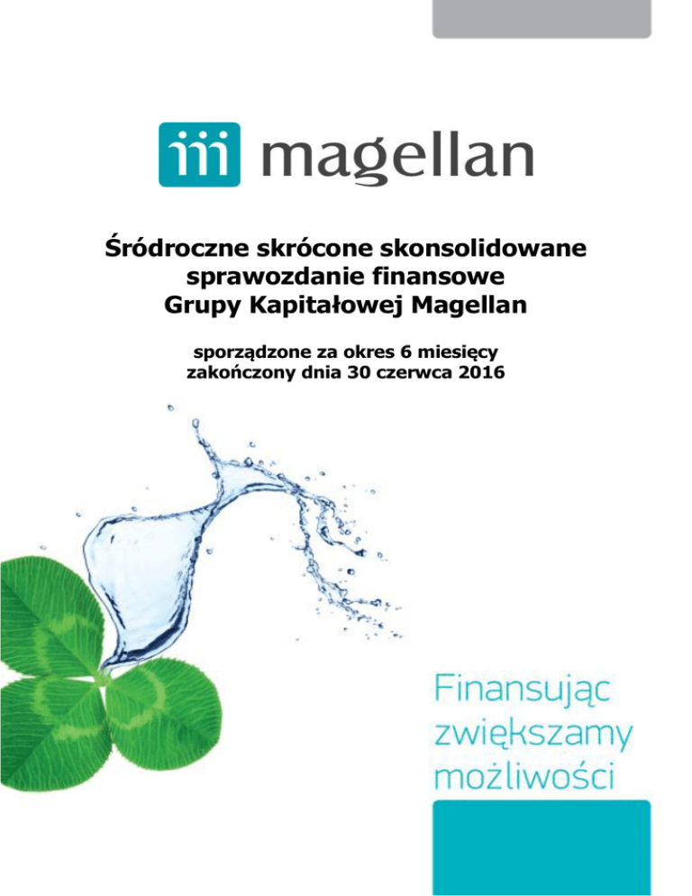 Śródroczne skrócone skonsolidowane sprawozdanie finansowe Grupy Kapitałowej Magellan sporządzone za okres 6 miesięcy zakończony dnia 30 czerwca 2016 1 Śródroczne skrócone skonsolidowane sprawozdanie finansowe za okres 6 miesięcy zakończony dnia 30 czerwca 2016 roku Grupa Kapitałowa Magellan SPIS TREŚCI I. Śródroczne skonsolidowane sprawozdanie z całkowitych dochodów .............................................5 II. Śródroczne skonsolidowane sprawozdanie z sytuacji finansowej na dzień 30.06.2016 ..................6 III. Śródroczne skonsolidowane sprawozdanie ze zmian w kapitale własnym......................................8 IV. Śródroczne skonsolidowane sprawozdanie z przepływów pieniężnych...........................................9 V. Dodatkowe informacje i objaśnienia do śródrocznego skróconego skonsolidowanego sprawozdania finansowego .................................................................................................................... 11 1. Informacje ogólne...................................................................................................................... 11 1.1 Skład Grupy Kapitałowej: .......................................................................................................... 11 1.2 Podmiot dominujący .................................................................................................................. 13 1.3 Akcjonariat ................................................................................................................................ 13 1.4 Skład organów zarządzających i nadzorujących jednostki dominującej ....................................... 15 1.5 Jednostki zależne ...................................................................................................................... 16 1.6 Jednostki stowarzyszone............................................................................................................ 18 2. Opis przyjętych zasad rachunkowości......................................................................................... 18 3. Segmenty operacyjne i sezonowość ........................................................................................... 21 4. Przychody ze sprzedaży ............................................................................................................. 23 5. Koszt finansowania portfela ....................................................................................................... 25 6. Koszty świadczeń pracowniczych................................................................................................ 26 7. Zysk przypadający na jedną akcję .............................................................................................. 26 8. Inwestycje w jednostkach stowarzyszonych wycenianych metodą praw własności...................... 27 9. Pożyczki i należności własne oraz należności z umów leasingu finansowego ............................... 27 10. Pozostałe aktywa finansowe................................................................................................... 31 11. Należności z tytułu dostaw i usług oraz pozostałe należności .................................................. 32 12. Zyski zatrzymane ................................................................................................................... 32 13. Pożyczki od podmiotów powiązanych ..................................................................................... 32 14. Pożyczki i kredyty bankowe .................................................................................................... 33 15. Zobowiązania z tytułu obligacji ............................................................................................... 43 16. Pozostałe zobowiązania finansowe ......................................................................................... 45 17. Dywidendy wypłacone i zadeklarowane oraz inne wypłaty z zysku.......................................... 46 18. Transakcje z jednostkami powiązanymi .................................................................................. 47 18.1. Transakcje z jednostkami powiązanymi .............................................................................. 47 18.2. Wynagrodzenia członków naczelnego kierownictwa ............................................................ 49 18.3. Płatności w formie akcji ...................................................................................................... 50 18.4. Inne oszacowane świadczenia pieniężne............................................................................. 50 19. Zobowiązania warunkowe i aktywa warunkowe ...................................................................... 51 20. Zdarzenia po dniu bilansowym ............................................................................................... 52 2 Śródroczne skrócone skonsolidowane sprawozdanie finansowe za okres 6 miesięcy zakończony dnia 30 czerwca 2016 roku Grupa Kapitałowa Magellan Śródroczne skrócone skonsolidowane sprawozdanie finansowe Grupy Kapitałowej Magellan za okres 3 i 6 miesięcy zakończony dnia 30 czerwca 2016 roku zostało sporządzone zgodnie z Międzynarodowymi Standardami Sprawozdawczości Finansowej zatwierdzonymi przez Unię Europejską. Sprawozdanie finansowe zawiera dane porównywalne za okres 6 miesięcy zakończony dnia 30 czerwca 2015 oraz na dzień 31 grudnia 2015 i na dzień 30 czerwca 2015 roku. Sprawozdanie z całkowitych dochodów oraz noty objaśniające do tego sprawozdania obejmują dodatkowo dane za okres 3 miesięcy zakończony dnia 30 czerwca 2016 roku oraz dane porównawcze za okres 3 miesięcy zakończony dnia 30 czerwca 2015 roku. Dane za okres 3 miesięcy zakończony dnia 30 czerwca 2016 roku oraz dane porównawcze za okres 3 miesięcy zakończony dnia 30 czerwca 2015 roku nie były przedmiotem przeglądu lub ba