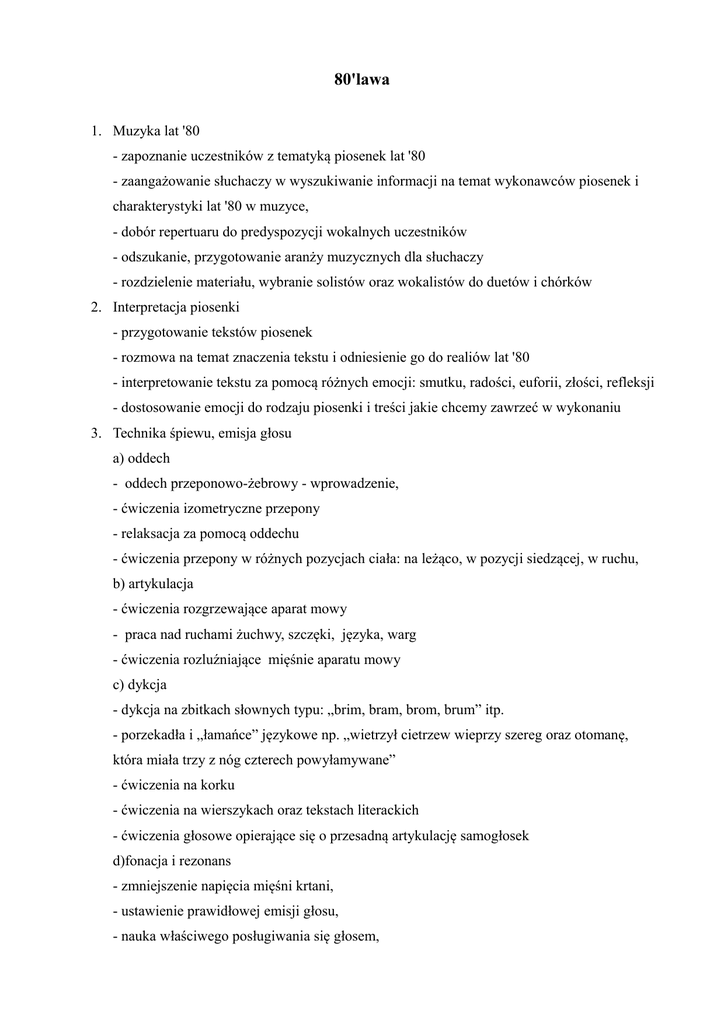 80'lawa 1. Muzyka lat '80 - zapoznanie uczestników z tematyką piosenek lat '80 - zaangażowanie słuchaczy w wyszukiwanie informacji na temat wykonawców piosenek i charakterystyki lat '80 w muzyce, - dobór repertuaru do predyspozycji wokalnych uczestników - odszukanie, przygotowanie aranży muzycznych dla słuchaczy - rozdzielenie materiału, wybranie solistów oraz wokalistów do duetów i chórków 2. Interpretacja piosenki - przygotowanie tekstów piosenek - rozmowa na temat znaczenia tekstu i odniesienie go do realiów lat '80 - interpretowanie tekstu za pomocą różnych emocji: smutku, radości, euforii, złości, refleksji - dostosowanie emocji do rodzaju piosenki i treści jakie chcemy zawrzeć w wykonaniu 3. Technika śpiewu, emisja głosu a) oddech - oddech przeponowo-żebrowy - wprowadzenie, - ćwiczenia izometryczne przepony - relaksacja za pomocą oddechu - ćwiczenia przepony w różnych pozycjach ciała: na leżąco, w pozycji siedzącej, w ruchu, b) artykulacja - ćwiczenia rozgrzewające aparat mowy - praca nad ruchami żuchwy, szczęki, języka, warg - ćwiczenia rozluźniające mięśnie aparatu mowy c) dykcja - dykcja na zbitkach słownych typu: „brim, bram, brom, brum” itp. - porzekadła i „łamańce” językowe np. „wietrzył cietrzew wieprzy szereg oraz otomanę, która miała trzy z nóg czterech powyłamywane” - ćwiczenia na korku - ćwiczenia na wierszykach oraz tekstach literackich - ćwiczenia głosowe opierające się o przesadną artykulację samogłosek d)fonacja i rezonans - zmniejszenie napięcia mięśni krtani, - ustawienie prawidłowej emisji głosu, - nauka właściwego posługiwania się głosem, - nauka mówienia na wydechu oraz stosowanie w trakcie mówienia przerw na nabranie powietrza w odpowiednich miejscach - ćwiczenia „mówienia na maskę” - logotomy „ma, me mi mo mu” - mówienie rytmiczne e)ćwiczenia relaksacyjne f)higiena głosu 4. Piosenka jako praktyczne odbicie ćwiczeń technicznych - oswojenie się z oddechem w piosence, - rozluźnianie krtani, - właściwa artykulacja dźwięków - atak miękki - dynamika - interpretacja melodii 5. Przygotowanie repertuaru na koncert finałowy - ćwiczenie pamięci-praca z tekstem - walka z tremą – zajęcia prowadzone są w grupie, każdy uczestnik prezentuje wyniki swojej pracy co tydzień na zajęciach przed „warsztatową publicznością”, - praca na scenie, oswojenie się ze sceną, - praca z mikrofonem - praca nad sylwetką i postawą na scenie -estetyka 6. Cele a)cele ćwiczeń - wstępna praca nad: - ustaleniem wysokości głosu, właściwej dla danej osoby tzw. średnicy głosowej, - wyrobieniem miękkiego ataku (nastawienia głosu), - ustawieniem głosu, czyli wyrobieniem umiejętności kierowania głosu "na maskę", - wyrobieniem umiejętności modulowania siły głosu, - wyrobieniem umiejętności modulowania wysokości głosu. b) cele ogólne: - zapoznanie młodzieży z muzyką polską lat '80, - przygotowanie piosenek dostosowanych do możliwości słuchaczy, - możliwość zaangażowania młodzieży w projekt muzyczny, - współtworzenie scenariusza koncertu, - nawiązanie nowych kontaktów - pierwsze doświadczenia muzyczne i sceniczne - opanowanie tremy i stresu związanego z przygotowaniem do koncertu oraz prezentacją efektów pracy w postaci piosenek.