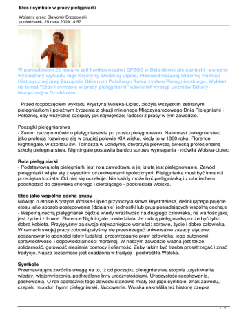 Etos i symbole w pracy pielęgniarki Wpisany przez Sławomir Brzozowski poniedziałek, 25 maja 2009 14:57 W poniedziałek 25 mają w sali konferencyjnej SPZOZ w Działdowie pielęgniarki i położne wysłuchały wykładu mgr Krystyny Wolskiej-Lipiec, Przewodniczącej Głównej Komisji Historycznej przy Zarządzie Głównym Polskiego Towarzystwa Pielęgniarskiego. Wykład na temat "Etos i symbole w pracy pielęgniarki" uświetnił występ uczniów Szkoły Muzycznej w Działdowie. Przed rozpoczęciem wykładu Krystyna Wolska-Lipiec, złożyła wszystkim zebranym pielęgniarkom i położnym życzenia z okazji minionego Międzynarodowego Dnia Pielęgniarki i Położnej, oby wszystkie czerpały jak największej radości z pracy w tym zawodzie. Początki pielęgniarstwa - Zanim zaczęto mówić o pielęgniarstwie po prostu pielęgnowano. Natomiast pielęgniarstwo jako profesja rozwinęło się w drugiej połowie XIX wieku, kiedy to w 1860 roku, Florence Nightingale, w szpitalu św. Tomasza w Londynie, otworzyła pierwszą świecką profesjonalną szkołę pielęgniarstwa. Nightingale postawiła bardzo surowe wymagania - mówiła Wolska-Lipiec. Rola pielęgniarki - Podstawową rolą pielęgniarki jest rola zawodowa, a jej istotą jest pielęgnowanie. Zawód pielęgniarki wiąże się z wysokimi oczekiwaniami społecznymi. Pielęgniarka musi być inna niż przeciętna kobieta. Od niej się oczekuje. Nie każdy może być pielęgniarką i z uśmiechem podchodzić do człowieka chorego i cierpiącego - podkreślała Wolska. Etos jako wspólna cecha grupy Mówiąc o etosie Krystyna Wolska-Lipiec przytoczyła słowa Arystotelesa, definiującego pojęcie etosu jako sposób postępowania (działanie) jednostki lub grup posiadających wspólną cechę.e - Wspólną cechą pielęgniarek będzie wtedy wrażliwość na drugiego człowieka, na wartość jaką jest życie i zdrowie. Florence Nightingale powiedziała, że dobrą pielęgniarką może być tylko dobra kobieta. Przyjęłyśmy za swoje najważniejsze wartości: zdrowie, życie i dobro człowieka. W ramach swojej pracy zobowiązałyśmy się przestrzegać uniwersalne zasady etyczne: poszanowanie godności istoty ludzkiej, przestrzeganie praw człowieka, jego autonomii, sprawiedliwości i odpowiedzialności moralnej. W naszym zawodzie ważna jest także solidarność, gotowość niesienia pomocy i ofiarność. Żeby takim być trzeba przestrzegać i znać tradycje. Nasza tożsamość jest osadzona w tradycji - podkreśliła Wolska. Symbole Przemawiająca zwróciła uwagę na to, iż od początku pielęgniarstwa stopnie uzyskiwania wiedzy, wtajemniczenia, podkreślane były uroczystościami. Uroczystość czepkowania, paskowania. O roli społecznej tego zawodu stanowić miały też jego symbole: znak zawodu, czepek, mundur, hymn pielęgniarski, ślubowanie. Wolska nakreśliła też historię czepka 1/2 Etos i symbole w pracy pielęgniarki Wpisany przez Sławomir Brzozowski poniedziałek, 25 maja 2009 14:57 pielęgniarskiego i przykłady zmiany jego wyglądu. - Czepek jako symbol zawodowy jest obecnie elementem dekoracyjnym. Ozdabia wizerunki książek, używany jest często podczas uroczystości. Z badań ZZPIP wynika, że pacjenci nie są zadowoleni z tego, że pielęgniarki przestały nosić czepki. Okazuje się nawet, że duża grupa pielęgniarek chciałaby aby czepki powróciły - mówiła. Pierwszy dokładny opis stroju pielęgniarskiego pochodzi z początków XVII wieku. Strój pielęgniarski ewoluował zmieniając kolor z szarego na biały. Słuchacze znajdujący się na sali zobaczyli zdjęcia ukazujące stroje pierwszych pielęgniarek w Polsce i na świecie. Ilustracje pochodzące z pierwszego polskiego podręcznika pielęgniarstwa, wydanego w 1910 roku w szkole lwowskiej. Pielęgniarka ma być damą - Pamiętajmy, że kultura to przede wszystkim prostota i umiejętność nawiązania kontaktu z drugim człowiekiem, a nie udziwianie swojego języka i kreowanie swoich wypowiedzi na naukowe, czy pseudonaukowe. Pielęgniarka ma być damą, kobietą która w kulturalny sposób odnosi się od ludzi i całego otoczenia. Pamiętajmy też, że największe zagrożenie dla etosu pielęgniarki niesie relatywizm moralny. Stopniowanie wartości w zależności od sytuacji w jakiej się znajdujemy - podkreśliła Krystyna Wolska-Lipiec 2/2