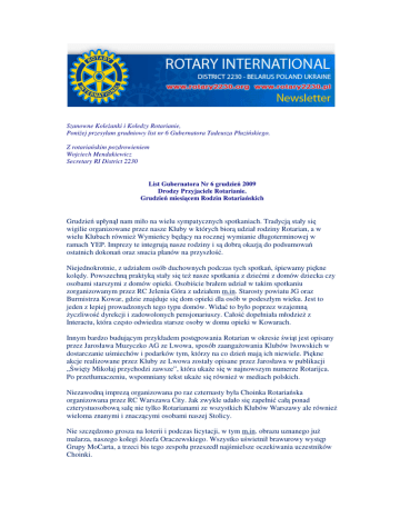 Szanowne Koleżanki i Koledzy Rotarianie, Poniżej przesyłam grudniowy list nr 6 Gubernatora Tadeusza Płuzińskiego. Z rotariańskim pozdrowieniem Wojciech Mendakiewicz Secretary RI District 2230 List Gubernatora Nr 6 grudzień 2009 Drodzy Przyjaciele Rotarianie. Grudzień miesiącem Rodzin Rotariańskich Grudzień upłynął nam miło na wielu sympatycznych spotkaniach. Tradycją stały się wigilie organizowane przez nasze Kluby w których biorą udział rodziny Rotarian, a w wielu Klubach również Wymieńcy będący na rocznej wymianie długoterminowej w ramach YEP. Imprezy te integrują nasze rodziny i są dobrą okazją do podsumowań ostatnich dokonań oraz snucia planów na przyszłość. Niejednokrotnie, z udziałem osób duchownych podczas tych spotkań, śpiewamy piękne kolędy. Powszechną praktyką stały się też nasze spotkania z dziećmi z domów dziecka czy osobami starszymi z domów opieki. Osobiście brałem udział w takim spotkaniu zorganizowanym przez RC Jelenia Góra z udziałem m.in. Starosty powiatu JG oraz Burmistrza Kowar, gdzie znajduje się dom opieki dla osób w podeszłym wieku. Jest to jeden z lepiej prowadzonych tego typu domów. Widać to było poprzez wzajemną życzliwość dyrekcji i zadowolonych pensjonariuszy. Całość dopełniała młodzież z Interactu, która często odwiedza starsze osoby w domu opieki w Kowarach. Innym bardzo budującym przykładem postępowania Rotarian w okresie świąt jest opisany przez Jarosława Muzyczko AG ze Lwowa, sposób zaangażowania Klubów lwowskich w dostarczanie uśmiechów i podarków tym, którzy na co dzień mają ich niewiele. Piękne akcje realizowane przez Kluby ze Lwowa zostały opisane przez Jarosława w publikacji „Święty Mikołaj przychodzi zawsze”, która ukaże się w najnowszym numerze Rotarijca. Po przetłumaczeniu, wspomniany tekst ukaże się również w mediach polskich. Niezawodną imprezą organizowana po raz czternasty była Choinka Rotariańska organizowana przez RC Warszawa City. Jak zwykle udało się zapełnić całą ponad czterystuosobową salę nie tylko Rotarianami ze wszystkich Klubów Warszawy ale również wieloma znanymi i znaczącymi osobami naszej Stolicy. Nie szczędzono grosza na loterii i podczas licytacji, w tym m.in. obrazu uznanego już malarza, naszego kolegi Józefa Oraczewskiego. Wszystko uświetnił brawurowy występ Grupy MoCarta, a trzeci bis tego zespołu przeszedł najśmielsze oczekiwania uczestników Choinki. W prezentowanym liście chciałbym jeszcze kilka zdań poświęcić Wigilii Wielu Narodów organizowanej co roku we Wrocławiu dla zagranicznych uczestników Wymiany Młodzieżowej. Dzięki staraniom moich Koleżanek i Kolegów z wrocławskich Klubów Rotary i Rotaract, impreza udała się znakomicie. W dniu poprzedzającym samą Wigilię, uczestnicy wymiany mieli okazję zwiedzić Zamek Książ w Wałbrzychu i Kościół Pokoju w Świdnicy oraz być goszczonym przez Prezydenta RC Świdnica-Wałbrzych w jego restauracji. Serdeczne dzięki dla RC Świdnica-Wałbrzych. Po południu młodzież spędziła nieco beztroskich chwil w Western City w Karpaczu dzięki zaangażowaniu Kolegów z RC Karpacz Karkonosze. Główna wrocławska część spotkania odbyła się (dzięki uprzejmości naszego kolegi Adama Józefa Dziąsko) w gmachu Starej Giełdy na Placu Solnym we Wrocławiu. W spotkaniu jako nasi szacowni goście wzięli udział m.in. J.Emin. Henryk Kardynał Gulbinowicz, J.Eks. Biskup Ryszard Bogusz ( kościół Ewangelicko-Augsburski), Rabin Wrocławia Icchak Rapaport wraz z Przewodniczącym Gminy Żydowskiej Józefem Kożuchem oraz przedstawiciele wspólnot religijnych z wrocławskiej Dzielnicy Wzajemnego Szacunku. Obecni byli przedstawiciele mniejszości romskiej, niemieckiej, łużyckiej, bułgarskiej, ukraińskiej. Przybyli także dyplomaci z różnych krajów. Kolędy po ukraińsku śpiewał chór Kościoła Greko-Katolickiego. Szczególnymi gośćmi uroczystości byli również nasi Koledzy Rotarianie: Przewodniczący i v-Przewodniczący Rady Miejskiej Wrocławia Jacek Ossowski i Piotr Kuczyński. Tak spędzona wigilia na pewno wzmocni u tych młodych ludzi ducha tolerancji i umiejętność wzajemnego zrozumienia i oni na pewno nie będą zarzewiem niepokojów religijnych czy wojen z powodów ciągle jeszcze tlących się wzajemnych uprzedzeń i niechęci. Wszystko odbywało się pod czujnym okiem Zdzisława Kiedrowskiego regionalnego koordynatora YEP, Krystyny Krupy Prezydent RC Wrocław, Stanisława Rybarczyka i Macieja Mazura prowadzących spotkanie oraz Wojciecha Pyzika bezpośredniego opiekuna młodzieży, który przy pomocy naszych przyjaciół z Rotaractu w pełni panował nad przebiegiem wszystkich części uroczystości. Cieszę się i szczerze gratuluję tego udanego przedsięwzięcia. Dodatkowym sukcesem organizatorów i Rotary były bardzo przychylne i obszerne relacje prasowe i telewizyjne z przebiegu uroczystości, co w naszej praktyce jest raczej rzadkością. Wkraczając w Nowy 2010 Rok mamy miłe wspomnienia i optymistyczne nastroje na przyszłość. Oby rodzące się teraz plany ziściły się nam w całości. Serdecznie Pozdrawiam Karpacz 01.01.2010 Tadeusz Płuziński Gubernator RI D.2230