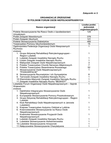 Załącznik nr 2 ORGANIZACJE ZRZESZONE W POLSKIM FORUM OSÓB NIEPEŁNOSPRAWNYCH Nazwa organizacji Polskie Stowarzyszenie Na Rzecz Osób z Upośledzeniem Umysłowym Polski Związek Niewidomych Polski Związek Głuchych Polskie Stowarzyszenie Diabetyków Towarzystwo Pomocy Głuchoniewidomym Ogólnopolska Federacja Organizacji Osób Niesprawnych Ruchowo zrzesza: 1. Grupa Aktywnej Rehabilitacji Rekryteringsgruppen Region Lubelski 2. Lubelski Związek Inwalidów Narządu Ruchu 3. Łódzki Związek Inwalidów Narządu Ruchu 4. Małopolski Związek Osób Niepełnosprawnych 5. Polskie Towarzystwo Chorób Nerwowo-Mięśniowych 6. Polskie Towarzystwo Stwardnienia Rozsianego 7. Stowarzyszenie Osób Niepełnosprawnych "PODKARPACIE" 8. Stowarzyszenie Reumatyków i ich Sympatyków 9. Tarnowski Związek Inwalidów Narządu Ruchu 10. Warmińsko-Mazurski Związek Inwalidów Narządu Ruchu 11. Związek Inwalidów Narządu Ruchu "BESKIDY" Lubelskie Forum Organizacji Osób Niepełnosprawnych – Sejmik Wojewódzki: zrzesza: 1. Dęblińskie Integracyjne Stowarzyszenie Osób Niepełnosprawnych 2. Europejskie Stowarzyszenie Pomocy Poszkodowanym 3. Grupa Aktywnej Rehabilitacji Rekryterinsgruppen - Region Lubelski 4. Klub Rehabilitacji Osób Niepełnosprawnych w Janowie Lubelskim 5. Krajowe Towarzystwo Autyzmu Oddział w Lublinie 6. Krasnostawskie Stowarzyszenie na Rzecz Osób Niepełnosprawnych 7. Kraśnickie Stowarzyszenie Przyjaciół Osób Niepełnosprawnych 8. Lubelski Związek Inwalidów Narządu Ruchu 9. Lubelskie Stowarzyszenie Alzheimerowskie 10. Lubelskie Stowarzyszenie Amazonek 11. Nałęczowskie Stowarzyszenie Charytatywne Liczba podst. jednostek organizacyjnych 125 376 121 480 15 1 1 1 1 3 7 52 1 8 1 1 1 1 1 1 1 1 1 1 1 1 1 1 1 1 12. Ogólnopolskie Stowarzyszenie Pomocy Chorym z HCV „PROMETEUSZE” Przedstawicielstwo w Lublinie 13. Podlaskie Stowarzyszenie Osób Niepełnosprawnych 14. Polski Związek Emerytów, Rencistów i Inwalidów Oddział Okręgowy w Lublinie 15. Polski Związek Głuchych Oddział w Lublinie 16. Polski Związek Niewidomych Okręg Lubelski 17. Polskie Stowarzyszenie Diabetyków Oddział Wojewódzki w Lublinie 18. Polskie Stowarzyszenie Ludzi Cierpiących na Padaczkę Oddział Lublin 19. Polskie Stowarzyszenie na Rzecz Osób z Upośledzeniem Umysłowym Koło w Hrubieszowie 20. Polskie Stowarzyszenie na Rzecz Osób z Upośledzeniem Umysłowym Koło w Lublinie 21. Polskie Stowarzyszenie na Rzecz Osób z Upośledzeniem Umysłowym Koło w Łęcznej 22. Polskie Stowarzyszenie na Rzecz Osób z Upośledzeniem Umysłowym Koło w Rykach 23. Polskie Stowarzyszenie na Rzecz Osób z Upośledzeniem Umysłowym Koło w Świdniku 24. Polskie Stowarzyszenie na Rzecz Osób z Upośledzeniem Umysłowym Koło w Tomaszowie Lubelskim 25. Polskie Towarzystwo Stwardnienia Rozsianego Oddział w Lublinie 26. Stowarzyszenie Chorych na Astmę Oskrzelową w Lublinie 27. Stowarzyszenie Integracyjne „Magnum Bonum” 28. Stowarzyszenie na Rzecz Dzieci i Młodzieży Niepełnosprawnej Ruchowo 29. Stowarzyszenie na Rzecz Dzieci z Astmą, Chorobami Reumatycznymi oraz Mukowiscydozą 30. Stowarzyszenie na Rzecz Osób Niepełnosprawnych „Otwarta Dłoń” 31. Stowarzyszenie na Rzecz Osób z Niepełnosprawnością Intelektualną w Poniatowej 32. Stowarzyszenie Ochrony Zdrowia Chorych na Serce i Układ Krążenia 33. Stowarzyszenie Osób Niepełnosprawnych „Otwarty Krąg” w Kurowie 34. Stowarzyszenie Osób z NTM UroConti 35. Stowarzyszenie Pomocy Chorym z HCV "Prometeusze" Przedstawicielstwo w Lublinie 36. Stowarzyszenie Pomocy Dzieciom i Młodzieży Niepełnosprawnej "Słoneczko" 37. Stowarzyszenie Pomocy Dzieciom Niepełnosprawnym "Krok za krokiem" w Zamościu 38. Stowarzyszenie Przyjaciół Dzieci i Osób Niepełnosprawnych w Matczynie 39. Stowarzyszenie Rodziców Dzieci z Wadą Serca „Serce 1 1 23 7 25 21 1 1 1 1 1 1 1 1 1 1 1 1 1 1 1 1 3 1 1 1 1 1 2 Dziecka” 40. Stowarzyszenie Rodziców i Przyjaciół Dzieci Niewidomych i Słabowidzących „Bliżej Świata” 41. Stowarzyszenie Rodzin Dzieci Niepełnosprawnych „Nasza Szansa" 42. Stowarzyszenie Rodzin Dzieci z Uszkodzeniem Mózgu „SPERO” 43. Stowarzyszenie Rodzin i Osób z Zespołem Downa "Ukryty Skarb" 44. Stowarzyszenie Wspomagania Osób Niepełnosprawnych "Res Sacra Miser" 45. Stowarzyszenie Wyrównywania Szans „Radość” w Lublinie 46. Zamojskie Stowarzyszenie Ochrony Zdrowia Psychicznego Wrocławski Sejmik Osób Niepełnosprawnych zrzesza: 1. Dolnośląskie Stowarzyszenie na Rzecz Osób z Zespołem Downa "RAZEM" 2. Dolnośląskie Stowarzyszenie na Rzecz Upowszechniania Kultury i Sztuki Osób Niepełnosprawnych "Widnokrąg" 3. Dolnośląskie Stowarzyszenie Osób Niepełnosprawnych w Wałbrzychu 4. Dolnośląskie Stowarzyszenie Pomocy Dzieciom i Młodzieży z MPD "OSTOJA" 5. Ewangelickie Centrum Diakonii i Edukacji im. ks. Marcina Lutra 6. Fundacja "L'ARCHE" Wspólnota we Wrocławiu 7. Fundacja im. Brata Alberta WTZ "Wspólnota" 8. Fundacja Klinika Zdrowego Życia KEN-TAO 9. Klub Inteligencji Niewidomej RP 10. Milickie Stowarzyszenie Przyjaciół Dzieci i Osób Niepełnosprawnych 11. Oddział Fundacji "Promyk Słońca" - Centrum Diagnostyczno-Rehabilitacyjne 12. Polkowicki Związek Inwalidów Narządu Ruchu 13. Polski Czerwony Krzyż Dolnośląski Oddział Okręgowy 14. Polski Związek Emerytów, Rencistów i Inwalidów we Wrocławiu 15. Polski Związek Głuchych Oddział Dolnośląski 16. Polski Związek Niewidomych Okręg Dolnośląski 17. Polskie Stowarzyszenie Chorych na Hemofilię Koło we Wrocławiu 18. Polskie Towarzystwo Stwardnienia Rozsianego Oddział Dolnośląski 19. Polskie Towarzystwo Walki z Kalectwem Oddział we Wrocławiu 20. Robotnicze Stowarzyszenie Twórców Kultury, Galeria Słowa i Obrazu 1 1 1 1 1 1 1 1 1 1 1 1 1 1 1 1 1 1 1 1 17 2 7 36 1 1 1 1 3 21. Stowarzyszenie "Świat Nadziei" 22. Stowarzyszenie na Rzecz Osób Niepełnosprawnych Umysłowo 23. Stowarzyszenie na Rzecz Wyrównywania Szans Rozwojowych Dziecka o Obni