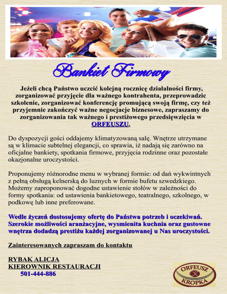 Bankiet Firmowy Jeżeli chcą Państwo uczcić kolejną rocznicę działalności firmy, zorganizować przyjęcie dla ważnego kontrahenta, przeprowadzic szkolenie, zorganizować konferencję promującą swoją firmę, czy też przyjemnie zakończyć ważne negocjacje biznesowe, zapraszamy do zorganizowania tak ważnego i prestiżowego przedsięwzięcia w ORFEUSZU. Do dyspozycji gości oddajemy klimatyzowaną salę. Wnętrze utrzymane są w klimacie subtelnej elegancji, co sprawia, iż nadają się zarówno na oficjalne bankiety, spotkania firmowe, przyjęcia rodzinne oraz pozostałe okazjonalne uroczystości. Proponujemy różnorodne menu w wybranej formie: od dań wykwintnych z pełną obsługą kelnerską do luznych w formie bufetu szwedzkiego. Możemy zaproponować dogodne ustawienie stołów w zależności do formy spotkania: od ustawienia bankietowego, teatralnego, szkolnego, w podkowę lub inne preferowane. Wedle życzeń dostosujemy ofertę do Państwa potrzeb i oczekiwań. Szerokie możliwości aranżacyjne, wysmienita kuchnia oraz gustowne wnętrza dodadzą prestiżu każdej zorganizowanej u Nas uroczystości. Zainteresowanych zapraszam do kontaktu RYBAK ALICJA KIEROWNIK RESTAURACJI 501-444-886