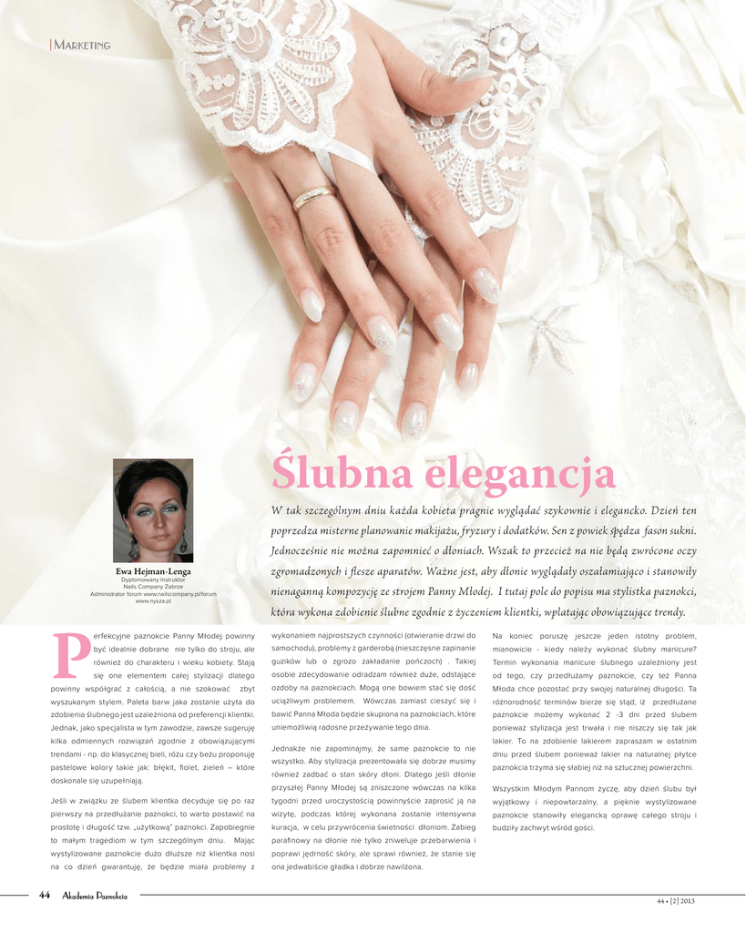 M arketing Ślubna elegancja W tak szczególnym dniu każda kobieta pragnie wyglądać szykownie i elegancko. Dzień ten poprzedza misterne planowanie makijażu, fryzury i dodatków. Sen z powiek spędza fason sukni. Jednocześnie nie można zapomnieć o dłoniach. Wszak to przecież na nie będą zwrócone oczy zgromadzonych i flesze aparatów. Ważne jest, aby dłonie wyglądały oszałamiająco i stanowiły Ewa Hejman-Lenga Dyplomowany Instruktor Nails Company Zabrze Administrator forum www.nailscompany.pl/forum www.nysza.pl P nienaganną kompozycję ze strojem Panny Młodej. I tutaj pole do popisu ma stylistka paznokci, która wykona zdobienie ślubne zgodnie z życzeniem klientki, wplatając obowiązujące trendy. erfekcyjne paznokcie Panny Młodej powinny wykonaniem najprostszych czynności (otwieranie drzwi do Na koniec poruszę jeszcze jeden istotny problem, być idealnie dobrane nie tylko do stroju, ale samochodu), problemy z garderobą (nieszczęsne zapinanie mianowicie - kiedy należy wykonać ślubny manicure? również do charakteru i wieku kobiety. Stają guzików lub o zgrozo zakładanie pończoch) . Takiej Termin wykonania manicure ślubnego uzależniony jest się one elementem całej stylizacji dlatego osobie zdecydowanie odradzam również duże, odstające od tego, czy przedłużamy paznokcie, czy też Panna ozdoby na paznokciach. Mogą one bowiem stać się dość Młoda chce pozostać przy swojej naturalnej długości. Ta wyszukanym stylem. Paleta barw jaka zostanie użyta do uciążliwym problemem. Wówczas zamiast cieszyć się i różnorodność terminów bierze się stąd, iż przedłużane zdobienia ślubnego jest uzależniona od preferencji klientki. bawić Panna Młoda będzie skupiona na paznokciach, które paznokcie możemy wykonać 2 -3 dni przed ślubem Jednak, jako specjalista w tym zawodzie, zawsze sugeruję uniemożliwią radosne przeżywanie tego dnia. ponieważ stylizacja jest trwała i nie niszczy się tak jak powinny współgrać z całością, a nie szokować zbyt kilka odmiennych rozwiązań zgodnie z obowiązującymi trendami - np. do klasycznej bieli, różu czy beżu proponuję pastelowe kolory takie jak: błękit, fiolet, zieleń – które doskonale się uzupełniają. 44 Jednakże nie zapominajmy, że same paznokcie to nie wszystko. Aby stylizacja prezentowała się dobrze musimy również zadbać o stan skóry dłoni. Dlatego jeśli dłonie lakier. To na zdobienie lakierem zapraszam w ostatnim dniu przed ślubem ponieważ lakier na naturalnej płytce paznokcia trzyma się słabiej niż na sztucznej powierzchni. przyszłej Panny Młodej są zniszczone wówczas na kilka Wszystkim Młodym Pannom życzę, aby dzień ślubu był Jeśli w związku ze ślubem klientka decyduje się po raz tygodni przed uroczystością powinnyście zaprosić ją na wyjątkowy i niepowtarzalny, a pięknie wystylizowane pierwszy na przedłużanie paznokci, to warto postawić na wizytę, podczas której wykonana zostanie intensywna paznokcie stanowiły elegancką oprawę całego stroju i prostotę i długość tzw. „użytkową” paznokci. Zapobiegnie kuracja, w celu przywrócenia świetności dłoniom. Zabieg budziły zachwyt wśród gości. to małym tragediom w tym szczególnym dniu. Mając parafinowy na dłonie nie tylko zniweluje przebarwienia i wystylizowane paznokcie dużo dłuższe niż klientka nosi poprawi jędrność skóry, ale sprawi również, że stanie się na co dzień gwarantuję, że będzie miała problemy z ona jedwabiście gładka i dobrze nawilżona. Akademia Paznokcia 44 • [2] 2013