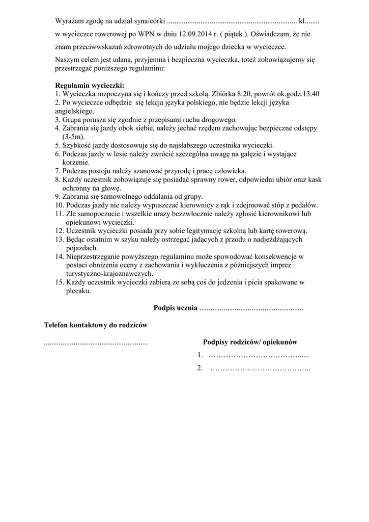 Wyrażam zgodę na udział syna/córki ...................................................................... kl........ w wycieczce rowerowej po WPN w dniu 12.09.2014 r. ( piątek ). Oświadczam, że nie znam przeciwwskazań zdrowotnych do udziału mojego dziecka w wycieczce. Naszym celem jest udana, przyjemna i bezpieczna wycieczka, toteż zobowiązujemy się przestrzegać poniższego regulaminu: Regulamin wycieczki: 1. Wycieczka rozpoczyna się i kończy przed szkołą. Zbiórka 8:20, powrót ok.godz.13.40 2. Po wycieczce odbędzie się lekcja języka polskiego, nie będzie lekcji języka angielskiego. 3. Grupa porusza się zgodnie z przepisami ruchu drogowego. 4. Zabrania się jazdy obok siebie, należy jechać rzędem zachowując bezpieczne odstępy (3-5m). 5. Szybkość jazdy dostosowuje się do najsłabszego uczestnika wycieczki. 6. Podczas jazdy w lesie należy zwrócić szczególna uwagę na gałęzie i wystające korzenie. 7. Podczas postoju należy szanować przyrodę i pracę człowieka. 8. Każdy uczestnik zobowiązuje się posiadać sprawny rower, odpowiedni ubiór oraz kask ochronny na głowę. 9. Zabrania się samowolnego oddalania od grupy. 10. Podczas jazdy nie należy wypuszczać kierownicy z rąk i zdejmować stóp z pedałów. 11. Złe samopoczucie i wszelkie urazy bezzwłocznie należy zgłosić kierownikowi lub opiekunowi wycieczki. 12. Uczestnik wycieczki posiada przy sobie legitymację szkolną lub kartę rowerową. 13. Będąc ostatnim w szyku należy ostrzegać jadących z przodu o nadjeżdżających pojazdach. 14. Nieprzestrzeganie powyższego regulaminu może spowodować konsekwencje w postaci obniżenia oceny z zachowania i wykluczenia z późniejszych imprez turystyczno-krajoznawczych. 15. Każdy uczestnik wycieczki zabiera ze sobą coś do jedzenia i picia spakowane w plecaku. Podpis ucznia ........................................................ Telefon kontaktowy do rodziców Podpisy rodziców/ opiekunów ........................................................ 1. ………………………………...... 2. …………………………………..