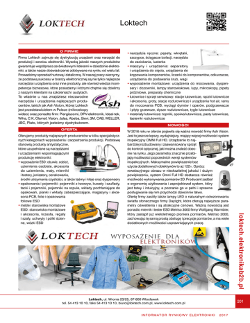 Loktech O FIRMIE Firma Loktech zajmuje się dystrybucją urządzeń oraz narzędzi do produkcji i serwisu elektroniki. Wysoką jakość naszych produktów gwarantuje współpraca ze światowymi liderami w dziedzinie elektroniki, a także nasze doświadczenie zdobywane na rynku od wielu lat. Prowadzimy sprzedaż hurtową i detaliczną. W naszej pracy wierzymy, że podstawą sukcesu w branży elektronicznej są nie tylko najlepsze narzędzia i urządzenia oraz inne produkty, ale również wiedza i kompetencje biznesowe, które posiadamy i którymi chętnie się dzielimy z naszymi klientami na szkoleniach i audytach. To właśnie u nas znajdziesz niezawodne narzędzia i urządzenia najlepszych producentów, takich jak Ash Vision, której Loktech jest przedstawicielem w Polsce (mikroskopy wideo) oraz ponadto firm: Piergiacomi, DPV-elektronik, Ideal-tek, Wiha, C.K, Olamef, Vision, Jalas, Abeba, Sievi, 3M, CAB, WELLER, JBC, Plato, których jesteśmy dystrybutorem. OFERTA NOWOŚCI W 2016 roku w ofercie pojawiła się ważna nowość firmy Ash Vision. Jest to jeszcze lepszy, wydajniejszy, mający więcej możliwości system inspekcyjny OMNI Full HD. Urządzenie to najbardziej rozbudowany i zaawansowany sprzęt do kontroli optycznej, jaki można znaleźć obecnie na rynku. Jego parametry znacznie przebijają możliwości poprzednich wersji systemów inspekcyjnych. Maksymalne powiększenie bez użycia dodatkowych obiektywów to aż 122×. Oprócz rewelacyjnego obrazu w nieskazitelnej jakości i dużym powiększeniu, system Omni Full HD dostarcza również możliwość wykonywania pomiarów 2D. Producent zadbał o ergonomię użytkowania i zaprojektował system, który jest łatwy i intuicyjny, a poznanie go w pełni i sprawne posługiwanie się nim przychodzi dziecinnie łatwo. Ofertę firmy zasiliły także lampy LED o naturalnym odwzorowaniu światła słonecznego firmy Daylight, które oferują najwyższe parametry oświetlenia i są atrakcyjne cenowo. Ważną nowością jest ponadto miernik i tester ESD Metriso 3000 firmy Wolfgang Warmbier, który zastąpił już wieloletniego pioniera pomiarów, Metriso 2000, zachowując tę samą prostą obsługę i precyzje pomiarów, a ma wiele dodatkowych możliwości usprawniających pracę. Loktech, ul. Wronia 23/25, 87-800 Włocławek tel. 54 413 10 10, faks 54 413 10 10, [email protected], www.loktech.com.pl I N F O R M AT O R R Y N KO W Y E L E K T R O N I K I loktech.elektronikab2b.pl Oferujemy produkty najlepszych producentów w kilku specjalistycznych kategoriach wyposażenia i zaopatrzenia produkcji. Podstawę stanowią produkty antystatyczne, które uzupełniane są narzędziami i urządzeniami wspomagającymi produkcję elektroniki: wyposażenie ESD: obuwie, odzież, uziemienia osobiste, akcesoria do uziemienia, maty, mierniki i testery, jonizatory, oznakowania, środki utrzymania czystości, a także taśmy i kleje oraz dyspensery opakowania i pojemniki: pojemniki z tworzyw, kuwety i szuflady, tacki i pojemniki, pojemniki na szpule, wkłady pochłaniające do opakowań, pianki i wkłady zabezpieczające, magazyny i akcesoria PCB, folie i opakowania foliowe ESD meble i stanowiska montażowe ESD: stanowiska montażowe i akcesoria, krzesła, regały i szafy, uchwyty i półki ścienne, wózki ESD narzędzia ręczne: pęsety, wkrętaki, szczypce, ściągacze izolacji, narzędzia do zaciskania, lusterka maszyny i urządzenia: separatory i urządzenia do cięcia, urządzenia do krępowania komponentów, liczarki do komponentów, odkurzacze, urządzenia do podawania śrub, wagi wyposażenie montażowe: urządzenia do mocowania, dyspensery i dozowniki, lampy stanowiskowe, lupy, mikroskopy, pipety próżniowe, preparaty chemiczne lutownice i sprzęt serwisowy: stacje lutownicze, rączki lutownicze i akcesoria, groty, stacje rozlutownicze i urządzenia hot air, ramy do mocowania PCB, wyciągi dymów i oparów, podgrzewacze i płyty grzewcze, dysze rozlutownicze, tygle lutownicze materiały lutownicze: topniki, spoiwa lutownicze, pasty lutownicze, tasiemki rozlutownicze 201 2017