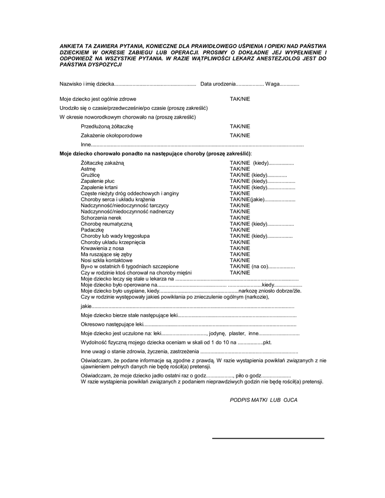ANKIETA TA ZAWIERA PYTANIA, KONIECZNE DLA PRAWIDŁOWEGO UŚPIENIA I OPIEKI NAD PAŃSTWA DZIECKIEM W OKRESIE ZABIEGU LUB OPERACJI. PROSIMY O DOKŁADNE JEJ WYPEŁNIENIE I ODPOWIEDŹ NA WSZYSTKIE PYTANIA. W RAZIE WĄTPLIWOŚCI LEKARZ ANESTEZJOLOG JEST DO PAŃSTWA DYSPOZYCJI Nazwisko i imię dziecka.......................................................... Data urodzenia.................... Waga.............. Moje dziecko jest ogólnie zdrowe TAK/NIE Urodziło się o czasie/przedwcześnie/po czasie (proszę zakreślić) W okresie noworodkowym chorowało na (proszę zakreślić) Przedłużoną żółtaczkę TAK/NIE Zakażenie okołoporodowe TAK/NIE Inne...................................................................................................................................................... Moje dziecko chorowało ponadto na następujące choroby (proszę zakreślić): Żółtaczkę zakaźną TAK/NIE (kiedy).................. Astmę TAK/NIE Gruźlicę TAK/NIE (kiedy).............. Zapalenie płuc TAK/NIE (kiedy).................... Zapalenie krtani TAK/NIE (kiedy).................... Częste nieżyty dróg oddechowych i anginy TAK/NIE Choroby serca i układu krążenia TAK/NIE(jakie)...................... Nadczynność/niedoczynność tarczycy TAK/NIE Nadczynność/niedoczynność nadnerczy TAK/NIE Schorzenia nerek TAK/NIE Chorobę reumatyczną TAK/NIE (kiedy)................... Padaczkę TAK/NIE Choroby lub wady kręgosłupa TAK/NIE (kiedy).................. Choroby układu krzepnięcia TAK/NIE Krwawienia z nosa TAK/NIE Ma ruszające się zęby TAK/NIE Nosi szkła kontaktowe TAK/NIE By»o w ostatnich 6 tygodniach szczepione TAK/NIE (na co)................... Czy w rodzinie ktoś chorował na choroby mięśni TAK/NIE Moje dziecko leczy się stale u lekarza na ....................................................................................... Moje dziecko było operowane na................................................. ........................kiedy.................... Moje dziecko było usypiane, kiedy........................................................narkozę zniosło dobrze/źle. Czy w rodzinie występowały jakieś powikłania po znieczulenie ogólnym (narkozie), jakie............................................................................................................................................... Moje dziecko bierze stale następujące leki.................................................................................... Okresowo następujące leki............................................................................................................ Moje dziecko jest uczulone na: leki................................, jodynę, plaster, inne............................. Wydolność fizyczną mojego dziecka oceniam w skali od 1 do 10 na ..................pkt. Inne uwagi o stanie zdrowia, życzenia, zastrzeżenia ..................................................................... Oświadczam, że podane informacje są zgodne z prawdą. W razie wystąpienia powikłań związanych z nie ujawnieniem pełnych danych nie będę rościł(a) pretensji. Oświadczam, że moje dziecko jadło ostatni raz o godz..................., piło o godz..................... W razie wystąpienia powikłań związanych z podaniem nieprawdziwych godzin nie będę rościł(a) pretensji. PODPIS MATKI LUB OJCA Szanowni Państwo, Wasze dziecko czeka w naszym szpitalu zabieg diagnostyczny lub operacja. Nasz zespół - lekarzy anestezjologów - ma za zadanie pomóc wykonać go w sposób bezbolesny i bezpieczny dla Państwa dziecka. Aby to było możliwe, musimy uzyska od Was jak najwięcej informacji na temat jego stanu zdrowia i przebytych chorób (także i w Państwa rodzinie). Dlatego też prosimy o dokładne odpowiedzi na pytania, znajdujące się na odwrotnej stronie tej kartki. Prosimy również o dostarczenie pełnej dokumentacji zdrowia dziecka, to znaczy książeczki zdrowia, kart informacyjnych z pobytów szpitalnych oraz zaświadczeń z poradni specjalistycznych. Prosimy o dokładne wypełnienie ankiety i odpowiedź na wszystkie pytania, nawet te, które na pierwszy rzut oka nie mają związku z obecną chorobą dziecka. Jeżeli nie mają Państwo żadnych pytań ani wątpliwości, prosimy o podpisanie oświadczenia pod pytaniami na odwrotnej stronie oraz zgody na znieczulenie ogólne (narkozę) i znieczulenie przewodowe (znieczulenie nerwów dla zapobiegania bólowi pooperacyjnemu). Jeżeli uśpienie dziecka i opieka nad nim będzie wymaga»a zastosowania specjalnych technik, to lekarz anestezjolog podczas badania dziecka poinformuje Państwa o nich osobiście i wyjaśni, na czym one polegają. Prosimy o nie podpisywanie karty bez dokładnego zapoznania się z nią i w razie jakichkolwiek wątpliwości! ŚWIADOMA ZGODA Po zapoznaniu się z proponowanym postępowaniem leczniczym wyrażam zgodę na: znieczulenie ogólne (uśpienie) i znieczulenie przewodowe (znieczulenie nerwów dla zapobiegania bólowi pooperacyjnemu) mojego dziecka: Nazwisko i imię dziecka ............................................................................................... do operacji ................................................................................................................... Jednocześnie wyrażam zgodę na następujące zabiegi/czynności dodatkowe Kaniulacje dużych naczyń TAK/NIE Kaniulację tętnic TAK/NIE Analgezję zewnątrzoponową/podpajęczynówkową TAK/NIE Podciśnienie kontrolowane TAK/NIE Przetoczenie krwi i preparatów krwiozastępczych TAK/NIE Zgłaszam następujące zastrzeżenia............................................................................. ...................................................................................................................................... Rzeszów, dn. ................................ PODPIS MATKI LUB OJCA