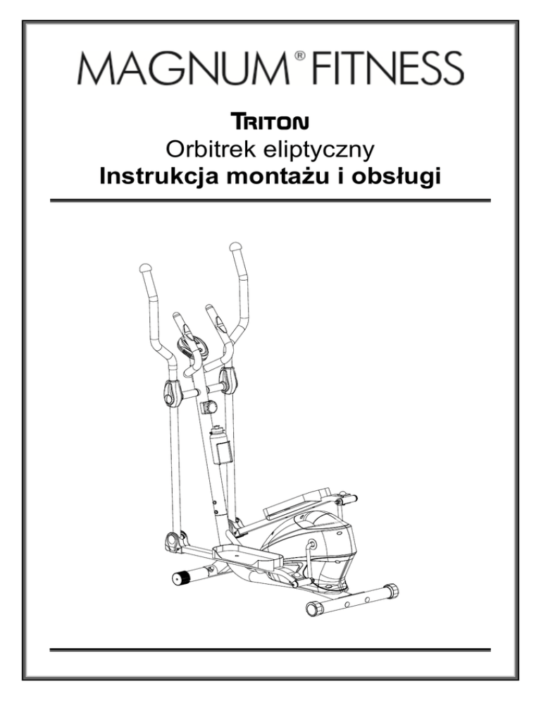 Triton Orbitrek eliptyczny Instrukcja montażu i obsługi Spis Treści Str 1. Uwagi dotyczące bezpieczeństwa Str 2. Rozgrzewka Str 3. Lista sprzętu Str 4. Instrukcja montażu Str 9. Instrukcja obsługi komputera Str 11. Rysunek w rozłożeniu na części Str 12. Lista części 2 Uwagi dotyczące bezpieczeństwa Ten przyrząd treningowy służy wyłącznie do użytku domowego. Zastosowania profesjonalne, komercyjne czy użycie na siłowniach będzie automatycznie anulowało jakąkolwiek odpowiedzialność producenta i/lub importera za produkt. Przed rozpoczęciem treningu z urządzeniem przeczytaj dokładnie instrukcję. Zachowaj instrukcję do wglądu, w razie napraw lub potrzeby zamawiania części zamiennych. Urządzenie przeznaczone jest wyłącznie do użytku domowego. M maksymalna waga użytkownika to 120 kg. Czynności opisane w instrukcji montażu wykonuj bardzo starannie. Używaj wyłącznie oryginalnych, dostarczonych z urządzeniem części. Przed rozpoczęciem montażu sprawdź czy przesyłka jest kompletna, używając listy zawartych części. Do montażu używaj tylko odpowiednich narzędzi, a w razie potrzeby poproś innych o pomoc. Umieść urządzenie na równej, nieśliskiej powierzchni. Z powodu ryzyka korozji używanie urządzenia treningowego w miejscach wilgotnych jest niezalecane. Przed pierwszym treningiem i co 1-2 miesiące sprawdzaj czy wszystkie połącznia są dopasowane i w odpowiednim stanie. Wymieniaj od razu wszelkie uszkodzone części i nie używaj urządzenia do czasu naprawy. Do napraw używaj tylko oryginalnych części zamiennych. W razie naprawy zapytaj o pomoc sprzedawcę. Unikaj używania agresywnych detergentów myjąc urządzenie. Upewnij się, że przed rozpoczęciem treningu urządzenie jest odpowiednio złożone i sprawdzone. W przypadku części regulowanych, zwróć uwagę na zaznaczoną maksymalną pozycję dopasowania. Urządzenie zaprojektowane jest do użytku osób dorosłych. Upewnij się, że dzieci używają urządzenia treningowego wyłącznie pod opieką osoby dorosłej. Upewnij się, że obecne osoby są świadome zagrożenia np. części ruchomych podczas treningu. Uwaga: nieodpowiednie/nadmierne sesje treningowe mogą powodować urazy i kontuzje. Należy postępować zgodnie z zaleceniami dotyczącymi prawidłowego treningu, zamieszczonymi w instrukcji treningu. Przed rozpoczęciem programu treningowego skonsultuj się z lekarzem. Może polecić Ci odpowiedni rodzaj treningu i oczekiwany wpływ. • Instrukcja użytkownika służy jedynie jako punkt odniesienia dla klienta. • Dostawca nie odpowiada za błędy wynikające z tłumaczenia lub zmiany w specyfikacji technicznej produktu. Wszystkie dane to orientacyjne wytyczne i nie mogą być używane do celów medycznych 1 Rozgrzewka: 15 sekund na stronę 20 sekund 20 sekund 25 sekund 20 sekund 20 sekund 30 sekund 25 sekund na nogę 30 sekund 20 sekund 5 sekund x 3 razy 20 sekund 20 sekund na nogę 5 razy 15 sekund 2 Lista dostarczonego osprzętu #16R Śruba dla prawego U-kształtnego 1 szt. #16L Śruba dla lewego U-kształtnego wspornika 1/2” 1 szt. wspornika 1/2” #17R Prawa nakrętka z tworzywa 1/2” 1 szt. #17L Lewa nakrętka z tworzywa 1/2” 1 szt. #18 Podkładka wygięta Ø28x Ø17x 0.3 1 szt. #18 Podkładka wygięta Ø28x Ø17x 0.3 1 szt. #20 Podkładka sprężynowa Ø20 1 szt. #20 Podkładka sprężynowa Ø20 1 szt. #12 M10 x 57 Śrub 4 szt. #88 Duża podkładka #15 Nakrętka łukowa Ø 10 kapturkowa M10 4 szt. #66 Nakrętka z tworzywa #28 Podkładka Ø 6 M6 szt. 4 szt. #27 Nakrętka kapturkowa M6 #31 Zakrętka S13 szt. 2 #29 Śruba M6 x 40 4 szt. #47 Śruba M6 x 35 4 szt. 4 4 szt. 4 szt. #48 Podkładka łukowa Ø 6 4 szt. #49 Wkręt samogwintujący Phillips ST4.2 x 20 4 szt. #79 Wkręt ST2.9 x 12 Klucz imbusowy 8mm 1 Klucz imbusowy 6mm 1 szt. szt. Multiklucz do śrub Multiklucz do śrub sześiokątnych / sześciokątnych 1 Śruboktęt Phillips S8, S13, S14, S15 szt. szt. 3 1 8 szt. Instrukcja montażu KROK 1. Zamontuj Przedni i Tylny Stabilizator. Połącz Przedni stabilizator (10) z przednią wygiętą płytką Ramy głównej (1) za pomocą dwóch Śrub M10x57 (12), Dużych podkładek łukowych (88) i Nakrętek kapturkowych M10 (15). Połącz Tylny stabilizator (11) z tylną wygiętą płytką Ramy głównej (1) za pomocą dwóch Śrub M10x57 (12), Dużych podkładek łukowych (88) i Nakrętek kapturkowych M10 (15). 10 11 4 KROK 2. Zamontuj Przednią kolumnę i Pokrętło kontroli naciągu. Usuń sześć śrub M8x15 (41), Podkładki sprężynowe Ø8 (60), i Podkładki łukowe Ø20xØ8 (42) z rury Ramy głównej (1). Przeciągnij Przewód naciągu (30) do dolnego otworu Kolumny przedniej (5) i wyciągnij go przez kwadratowy otwór znajdujący się w Kolumnie przedniej (5). Połącz Przewód sensora II (68) Ramy głównej (1) z Przewodem sensora I (67) Kolumny przedniej (5). Włóż Kolumnę przednią (5) do rury Ramy głównej (1) i zabezpiecz ją za pomocą sześciu Śrub M8x15 (41), Podkładek sprężynowych Ø8 (60) i Podkładek łukowych Ø20xØ8 (42), które zostały wcześniej wyjęte. Usuń podkładkę wygiętą Ø20xØ5 Pokrętła kontroli naciągu (64) i śrubę M5x45 Pokrętła kontroli naciągu (65) z Pokrętła kontroli naciągu (54). Włóż koniec przewodu oporu Pokrętła kontroli naciągu (54) w miejsce zaczepu sprężyny Linki naciągu (30), jak pokazano na rysunku A ryc. 2. Ciągnij koniec przewodu oporu Pokrętła kontroli naciągu (54) do góry i wciśnij go w przerwę metalowej obudowy Linki naciągu (30), jak pokazano na rysunku B ryc. 2. Połącz Pokrętło kontroli naciągu (54) z Przednią kolumną (5) za pomocą Podkładki łukowej Ø20xØ5 Pokrętła kontroli naciągu (64) i śruby M5x45 Pokrętła kontroli naciągu (65) które zostały wcześniej wyjęte. 5 KROK 3. Zamontuj Prawe i Lewe ramię poręczy, Prawą i Lewą belkę na stopy, Prawy i Lewy pedał oraz Osłony belek na stopy. Usuń dwie śruby M10x18 (43), Podkładki sprężynowe