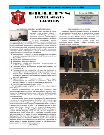 Styczeń 2010r. URZĄD MIASTA GARWOLIN tel. (025) 7864242, fax. 6843466 www.garwolin.pl [email protected] PODSUMOWANIE ROKU 2009 W MIEŚCIE GARWOLIN POWITANIE NOWEGO 2010 ROKU Minął rok 2009. Był to rok, w którym przypadło wiele ważnych rocznic. 4 czerwca obchodziliśmy 20 rocznicę pierwszych, częściowo wolnych wyborów do Sejmu i całkowicie wolnych do Senatu - to dzieo symbolizujący obalenie komunizmu. Był to rok również bardzo trudny z uwagi na to, że cały kraj został dotknięty kryzysem. Zlikwidowano wiele miejsc pracy. Wielu ludzi straciło zatrudnienie. Nie ominęło to również naszego miasta. Ale śmiało w dniu dzisiejszym mogę powiedzied, że mamy wiele powodów do zadowolenia. Miasto pięknieje i rozwija się. Nie sposób nie zauważyd korzystnych zmian zachodzących w naszym mieście. Zrealizowaliśmy szereg inwestycji służących naszym mieszkaoców. Wybudowaliśmy i oddaliśmy do użytku kompleks boisk sportowych w ramach programu „ Moje Boisko Orlik 2012”, które mieści się przy Zespole Szkół nr 2, Wykonaliśmy boisko na os. Stacyjna, Wykonaliśmy place zabaw dla dzieci, Rozpoczęliśmy budowę parku spacerowo - wypoczynkowego przy ul. II Armii Wojska Polskiego, Ogłosiliśmy przetarg na wykonanie projektu hali sportowej przy Zespole Szkół nr 5, Przebudowaliśmy ciąg ulic Lubelska - Al. Legionów - Kościuszki - w ramach tej inwestycji powstały trzy parkingi, przy os, Zarzecze, przy Zespole Szkół Ponadgimnazjalnych nr 1 oraz przy piekarni Mianowskich, powstały ścieżki rowerowe, wyremontowane zostały przystanki autobusowe, Wybudowaliśmy i wyremontowaliśmy wiele ciągów komunikacyjnych (ul. Olimpijska, ul. Garwolioska, drogi na os. Budzeo, ul. Zawady, ul. Dobra, ul. Narutowicza, ul. Zamojska), Zakooczyliśmy proces scalenia na os. Rataja. Na realizację inwestycji pozyskaliśmy ze źródeł zewnętrznych ponad 2mln. złotych. Ważnym przedsięwzięciem dla miasta było uchwalenie planu przestrzennego zagospodarowania dla utworzonej Garwolioskiej Strefy Aktywności Gospodarczej, która stwarza możliwości lokalizacji nowych zakładów pracy. Ponadto miasto nabyło 30,7413 ha gruntów pod zbiornik retencyjny. Rok 2009 był dla miasta rokiem szczególnym, ze względu na wizytę Prezydenta RP Lecha Kaczyoskiego w Garwolinie, który podczas swych przemówieo zwracał uwagę na ciągły rozwój naszego miasta. We wrześniu gościliśmy również delegację z niemieckiego miasta Furstenau, z którym współpracujemy od 2004 r. W Garwolinie odbyło się wiele imprez kulturalnych i festiwali m.in. Dni Garwolina, Międzynarodowy Festiwal Muzyki Chóralnej, Przegląd Piosenki Jacka Kaczmarskiego czy Festiwal Piosenki Religijnej. Cieszy nas fakt, że nasze osiągnięcia są doceniane przez innych. Otóż w dniu 13 listopada br. odebrałem dyplom dla miasta Garwolina za zajęcie 19 miejsca w kategorii gmin miejskich w Ogólnopolskim Rankingu Rozwoju Zrównoważonego Gmin wiejskich, miejsko-wiejskich oraz miejskich za 2008 rok”. Zajęcie przez Garwolin 19 miejsca w ogólnopolskim rankingu to duże wyróżnienie, tym bardziej, że polskie miasta nie ustają w działaniach mających na celu dalszy rozwój i poprawę warunków życia swoich mieszkaoców. Wspólnego powitania Nowego 2010 Roku w amfiteatrze na garwolioskim Zarzeczu wraz z mieszkaocami naszego miasta dokonali burmistrz Garwolina Tadeusz Mikulski, przewodniczący Rady Miasta Andrzej Dobrowolski oraz wicestarosta powiatu garwolioskiego Marek Chciałowski. Tadeusz Mikulski /-/Burmistrz Garwolina Impreza rozpoczęła się o godzinie 22-giej. Przy siarczystym mrozie, muzyce i pokazie sztucznych ogni, Garwolin wkroczył w 2010 rok. 2 ZŁOTE GODY Dnia 29 grudnia 2009r. w Urzędzie Miasta w Garwolinie miała miejsce wyjątkowa uroczystośd. Zaproszono na nią 25 par małżeoskich z terenu miasta i gminy Garwolin, którym postanowieniem Prezydenta Rzeczypospolitej Polskiej zostały przyznane medale„ Za długoletnie pożycie małżeoskie”. W uroczystości wzięły udział następujące pary małżeoskie: Teresa i Stanisław Dąbrowscy, Genowefa i Kazimierz Kęsik, Henryka i Jan Kocyk, Kazimiera i Bogusław Kozłowscy, Krystyna i Ryszard Maszkiewicz, Maria i Kazimierz Maszkiewicz, Stanisława i Marian Mucha, Stanisława i Henryk Przybysz, Barbara i Zdzisław Ruta, Barbara i Adam Rybaccy, Teresa i Kazimierz Sabała, Teresa i Edward Sieraoscy, Krystyna i Feliks Stanieta, Janina i Bolesław Świesiulscy (60 lecie zawarcia małżeostwa), Jadwiga i Włodzimierz Teperek, Genowefa i Jan Winek, Janina i Jan Woźniak, Jadwiga i Stefan Witak, Maria i Antoni Zaremba. Dekoracji medalami dokonali burmistrz Garwolina Tadeusz Mikulski, c-ca wójta gminy Garwolin Dariusz Mucha oraz przewodniczący Rady Gminy Garwolin Jerzy Szewczyk. Po części oficjalnej i odśpiewaniu „100 lat” wszyscy zasiedli do poczęstunku. Nie mogło zabraknąd weselnego tortu i melodii z lat młodości Jubilatów. Wszystkim Jubilatom życzymy długich lat życia w dobrym zdrowiu i wielu kolejnych rocznic wspólnego pożycia małżeoskiego. Z OSTATNICH SESJI RADY MIASTA GARWOLIN Dnia 21 grudnia 2009 r. odbyła się pierwsza z dwóch grudniowych sesji, podczas której Rada Miasta Garwolin uchwaliła swój plan pracy na rok 2010. Radni przyjęli również uchwały umożliwiające nabycie gruntów na: poszerzenie pasa drogowego ul. Stanisława Mikulskiego ps. „Lis” oraz skomunikowanie ul. Marmurowej z ul. Granitową. Podjęto także uchwałę dotyczącą sprzedaży działki na Osiedlu Zarzecze. Ponadto przyjęto Regulamin określający wysokośd i szczegółowe warunki przyznawania dodatków do wynagrodzenia zasadniczego oraz szczegółowe warunki obliczania i wypłacania wynagrodzenia za godziny ponadwymiarowe i godziny doraźnych zastępstw nauczycieli poszczególnych stopni awansu zawodowego w szkołach i przedszkolach prowadzonych przez Miasto Garwolin. Podczas tego posiedzenia przyjęto uchwałę w sprawie dokonania zmian w 