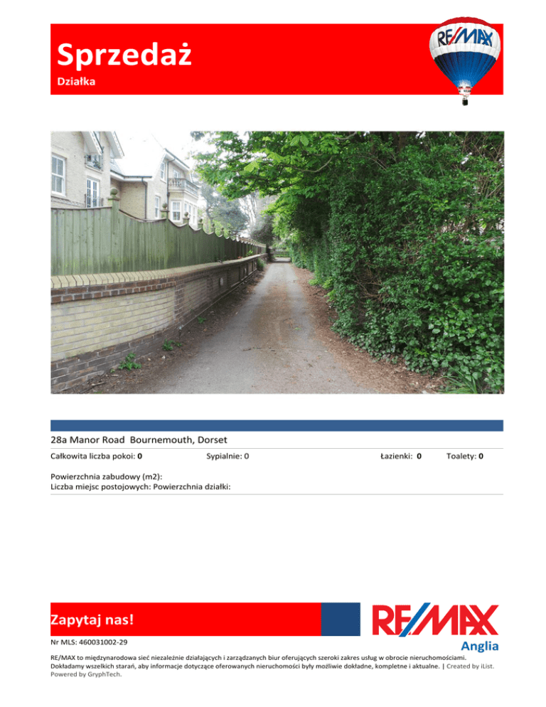 Sprzedaż Działka 28a Manor Road Bournemouth, Dorset Całkowita liczba pokoi: 0 Sypialnie: 0 Łazienki: 0 Toalety: 0 Powierzchnia zabudowy (m2): Liczba miejsc postojowych: Powierzchnia działki: Zapytaj nas! Nr MLS: 460031002-29 Anglia RE/MAX to międzynarodowa sieć niezależnie działających i zarządzanych biur oferujących szeroki zakres usług w obrocie nieruchomościami. Dokładamy wszelkich starań, aby informacje dotyczące oferowanych nieruchomości były możliwie dokładne, kompletne i aktualne. | Created by iList. Powered by GryphTech. Sprzedaż Działka Tony Vickerstaff Telefon do agenta 077 4267 2316 Telefon bezpośredni 077 4267 2316 Faks [email protected] www.remax.co.uk/housevalues RE/MAX House Values 70 High Street Poole Dorset BH15 1DA England Remax are pleased to offer for sale this plot of land situated in a prime location on the East Cliff. With in walking distance to both the fantastic beaches and Bournemouth Town Centre. The land used to have a garage situated on it but subject to planning there maybe be possibilities of a small house. The plot measures aprox. 12.23 metres (40ft) x 7.94 metres (25.11ft). Please call for further details. Informacje dodatkowe Plaża Zapytaj nas! Nr MLS: 460031002-29 Anglia RE/MAX to międzynarodowa sieć niezależnie działających i zarządzanych biur oferujących szeroki zakres usług w obrocie nieruchomościami. Dokładamy wszelkich starań, aby informacje dotyczące oferowanych nieruchomości były możliwie dokładne, kompletne i aktualne. | Created by iList. Powered by GryphTech.