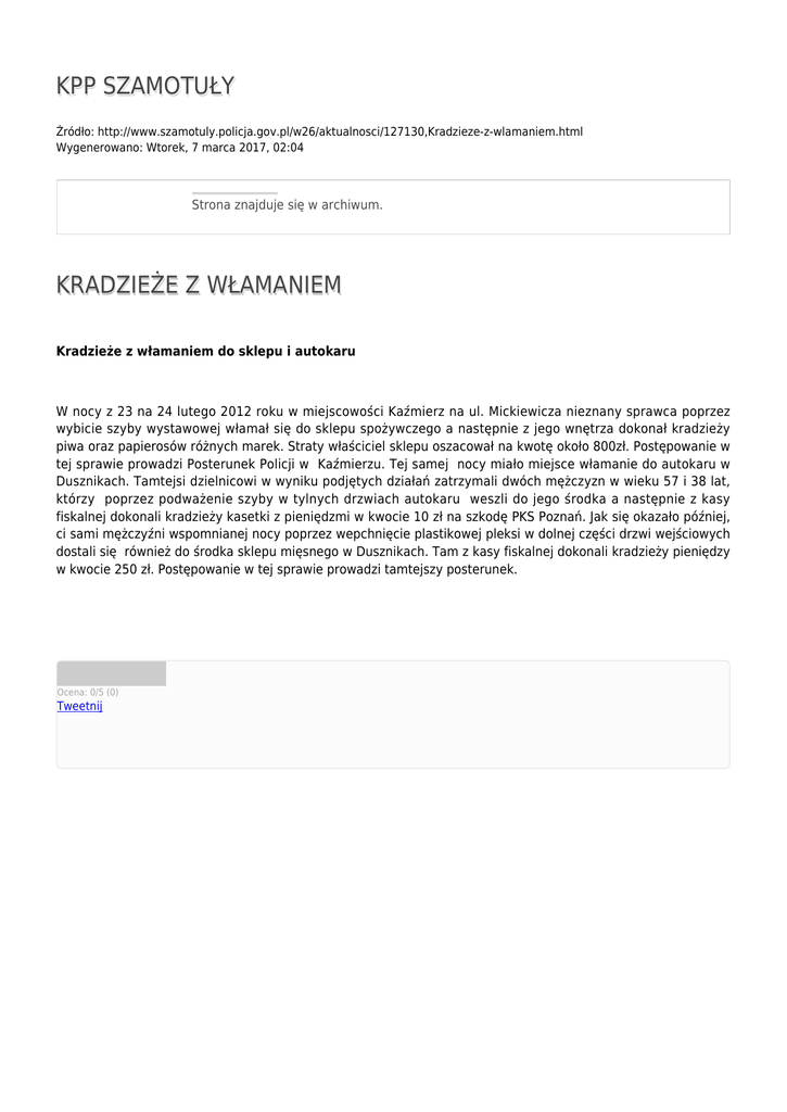 KPP SZAMOTUŁY Źródło: http://www.szamotuly.policja.gov.pl/w26/aktualnosci/127130,Kradzieze-z-wlamaniem.html Wygenerowano: Wtorek, 7 marca 2017, 02:04 Strona znajduje się w archiwum. KRADZIEŻE Z WŁAMANIEM Kradzieże z włamaniem do sklepu i autokaru W nocy z 23 na 24 lutego 2012 roku w miejscowości Kaźmierz na ul. Mickiewicza nieznany sprawca poprzez wybicie szyby wystawowej włamał się do sklepu spożywczego a następnie z jego wnętrza dokonał kradzieży piwa oraz papierosów różnych marek. Straty właściciel sklepu oszacował na kwotę około 800zł. Postępowanie w tej sprawie prowadzi Posterunek Policji w Kaźmierzu. Tej samej nocy miało miejsce włamanie do autokaru w Dusznikach. Tamtejsi dzielnicowi w wyniku podjętych działań zatrzymali dwóch mężczyzn w wieku 57 i 38 lat, którzy poprzez podważenie szyby w tylnych drzwiach autokaru weszli do jego środka a następnie z kasy fiskalnej dokonali kradzieży kasetki z pieniędzmi w kwocie 10 zł na szkodę PKS Poznań. Jak się okazało później, ci sami mężczyźni wspomnianej nocy poprzez wepchnięcie plastikowej pleksi w dolnej części drzwi wejściowych dostali się również do środka sklepu mięsnego w Dusznikach. Tam z kasy fiskalnej dokonali kradzieży pieniędzy w kwocie 250 zł. Postępowanie w tej sprawie prowadzi tamtejszy posterunek. Ocena: 0/5 (0) Tweetnij