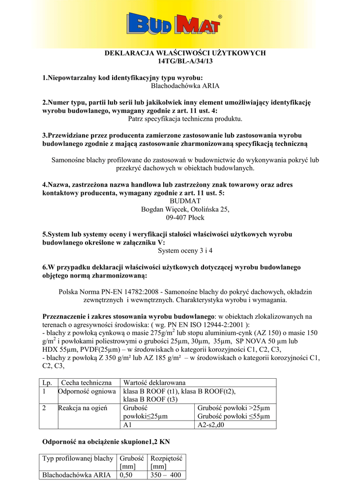 DEKLARACJA WŁAŚCIWOŚCI UŻYTKOWYCH 14TG/BL-A/34/13 1.Niepowtarzalny kod identyfikacyjny typu wyrobu: Blachodachówka ARIA 2.Numer typu, partii lub serii lub jakikolwiek inny element umożliwiający identyfikację wyrobu budowlanego, wymagany zgodnie z art. 11 ust. 4: Patrz specyfikacja techniczna produktu. 3.Przewidziane przez producenta zamierzone zastosowanie lub zastosowania wyrobu budowlanego zgodnie z mającą zastosowanie zharmonizowaną specyfikacją techniczną Samonośne blachy profilowane do zastosowań w budownictwie do wykonywania pokryć lub przekryć dachowych w obiektach budowlanych. 4.Nazwa, zastrzeżona nazwa handlowa lub zastrzeżony znak towarowy oraz adres kontaktowy producenta, wymagany zgodnie z art. 11 ust. 5: BUDMAT Bogdan Więcek, Otolińska 25, 09-407 Płock 5.System lub systemy oceny i weryfikacji stałości właściwości użytkowych wyrobu budowlanego określone w załączniku V: System oceny 3 i 4 6.W przypadku deklaracji właściwości użytkowych dotyczącej wyrobu budowlanego objętego normą zharmonizowaną: Polska Norma PN-EN 14782:2008 - Samonośne blachy do pokryć dachowych, okładzin zewnętrznych i wewnętrznych. Charakterystyka wyrobu i wymagania. Przeznaczenie i zakres stosowania wyrobu budowlanego: w obiektach zlokalizowanych na terenach o agresywności środowiska: ( wg. PN EN ISO 12944-2:2001 ): - blachy z powłoką cynkową o masie 275g/m2 lub stopu aluminium-cynk (AZ 150) o masie 150 g/m2 i powłokami poliestrowymi o grubości 25µm, 30µm, 35µm, SP NOVA 50 µm lub HDX 55µm, PVDF(25µm) – w środowiskach o kategorii korozyjności C1, C2, C3, - blachy z powłoką Z 350 g/m² lub AZ 185 g/m² – w środowiskach o kategorii korozyjności C1, C2, C3, Lp. Cecha techniczna 1 Odporność ogniowa 2 Reakcja na ogień Wartość deklarowana klasa B ROOF (t1), klasa B ROOF(t2), klasa B ROOF (t3) Grubość Grubość powłoki >25µm powłoki≤25µm Grubość powłoki ≤55µm A1 A2-s2,d0 Odporność na obciążenie skupione1,2 KN Typ profilowanej blachy Grubość Rozpiętość [mm] [mm] Blachodachówka ARIA 0,50 350 – 400 Wodoszczelność, Przepuszczalność wody, powietrza i oparów – Wyroby nie mające perforacji (jako uszkodzeń) są wodoszczelne i nieprzepuszczalne dla pary i powietrza. Zmiana wymiarów – rozszerzalność cieplna powinna być brana pod uwagę tam gdzie taka zmiana może mieć wpływ na eksploatację produktu, należy brać pod uwagę odpowiednie współczynnik rozszerzalności cieplnej - stal: 12 x 10-6 K-1 Instytut Techniki Budowlanej: Zakład Trwałości I Ochrony Budowli NO-2/819/A/2008 Zakład Badań Ogniowych NP-1259.2.1/07/AK, NP-1259.2.2/07/AK, NP-1259.2.3/07/AK, NP-1259.2.3/2007/AK. Zakład Trwałości I Ochrony Budowli przeprowadził badania odporności korozyjnej wyrobów i wydał opinię NO-2/819/A/2008 i Raport z badań Nr LM00-0785/11/Z00NM – system oceny 4 Zakład Badań Ogniowych wykonał badania reakcji na ogień powłok lakierniczych i wydał opinie NP-1259.2.1/07/AK; NP-1259.2.2/07/AK; NP-1259.2.3/07/AK, NP-1259.2.3/2007/AK – system oceny 3 Wodoszczelność, przepuszczalność wody, powietrza i oparów – Wyroby nie mające perforacji (jako uszkodzeń) są wodoszczelne i nieprzepuszczalne dla pary i powietrza. Zmiana wymiarów – rozszerzalność cieplna powinna być brana pod uwagę tam, gdzie taka zmiana może mieć wpływ na eksploatację produktu, należy brać pod uwagę odpowiedni współczynnik rozszerzalności cieplnej - stal: 12 x 10-6 K-1 Tolerancje wymiarowe dla wyrobów dachowych, określone są w PN-EN 508-1 7. Właściwości użytkowe wyrobu określone w punkcie 3 są zgodne z właściwościami deklarowanymi w punkcie 6 Niniejsza deklaracja właściwości użytkowych wydana została na wyłączną odpowiedzialność producenta . W imieniu producenta podpisał: Dyrektor ds. Produkcji Mieczysław Kijek (nazwisko i stanowisko) Płock 01.07.2013