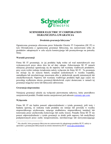 SCHNEIDER ELECTRIC IT CORPORATION OGRANICZONA GWARANCJA Dwuletnia gwarancja fabryczna 1 Ograniczona gwarancja oferowana przez Schneider Electric IT Corporation (SE IT) w tym Oświadczeniu o ograniczonej gwarancji fabrycznej, ma zastosowanie tylko do produktów zakupionych w celu użycia komercyjnego lub przemysłowego na potrzeby firmy. Warunki gwarancji Firma SE IT gwarantuje, że jej produkty będą wolne od wad materiałowych oraz wykonawczych przez okres dwa lat od daty zakupu. Zobowiązania SE IT ramach niniejszej gwarancji ograniczają się do naprawy lub wymiany wadliwych produktów, przy czym wybór rodzaju świadczenia należy wyłącznie do firmy SE IT. Ta gwarancja nie stosuje się do zużycia baterii, urządzeń uszkodzonych w wyniku wypadku, zaniedbania lub niewłaściwego stosowania albo w jakikolwiek sposób zmienionych lub zmodyfikowanych. Naprawy lub wymiany wadliwego produktu bądź jego części nie powodują wydłużenia okresu gwarancji.Jakiekolwiek części dostarczane w ramach tej gwarancji mogą być nowe lub fabrycznie odtworzone. Gwarancja nieprzenośna Niniejszej gwarancji udziela się wyłącznie pierwotnemu nabywcy, który prawidłowo zarejestrował produkt. Produkt można zarejestrować pod adresem warranty.apc.com. Wyłączenia Firma SE IT nie będzie ponosić odpowiedzialności z tytułu gwarancji, jeśli testy i badania ujawnią, że rzekoma wada produktu nie istnieje lub powstała w wyniku nieprawidłowego użytkowania, rażącego niedbalstwa, nieprawidłowej instalacji lub testowania przez użytkownika końcowego lub osoby trzecie. Ponadto firma SE IT nie ponosi odpowiedzialności z tytułu gwarancji za skutki prób naprawy lub modyfikacji podejmowanych przez osoby nieupoważnione, niewłaściwego lub niewystarczającego 1 Aby określić, która gwarancja fabryczna ma zastosowanie do zakupionego produktu SE IT, należy to sprawdzić z gwarancjami fabrycznymi na stronie internetowej SE IT: www.apc.com/products . napięcia elektrycznego lub połączenia, niewłaściwych warunków eksploatacji, działania atmosfery korozyjnej, napraw, instalacji i rozruchu przez osoby inne niż wyznaczone przez firmę SE IT, zmiany miejsca lub sposobu eksploatacji, ekspozycji na działanie warunków atmosferycznych, działania siły wyższej, pożaru, kradzieży, instalacji niezgodnej z zaleceniami lub specyfikacją firmy SE IT, a także w wypadku zmodyfikowania, uszkodzenia lub usunięcia numeru seryjnego SE IT, wreszcie za skutki wszelkich zdarzeń wykraczających poza użytkowanie zgodne z przeznaczeniem. NIE UDZIELA SIĘ ŻADNYCH INNYCH GWARANCJI JAWNYCH ANI DOMNIEMANYCH, WYWIEDZIONYCH Z INTERPRETACJI PRZEPISÓW BĄDŹ W INNY SPOSÓB, NA PRODUKTY SPRZEDANE, SERWISOWANE LUB DOSTARCZANE NA MOCY TEJ UMOWY LUB W ZWIĄZKU Z NIĄ. FIRMA SE IT WYKLUCZA WSZELKIE DOMNIEMANE GWARANCJE WARTOŚCI HANDLOWEJ, SPEŁNIENIA OCZEKIWAŃ I PRZYDATNOŚCI DO KONKRETNEGO CELU. GWARANCJE UDZIELONE JAWNIE PRZEZ FIRMĘ SE IT NIE ZOSTANĄ POSZERZONE, OGRANICZONE ANI ZMODYFIKOWANE W WYNIKU UDZIELANIA PRZEZ FIRMĘ SEIT PORAD TECHNICZNYCH LUB INNYCH ANI ŚWIADCZENIA USŁUG SERWISOWYCH W ZWIĄZKU Z PRODUKTEM; UDZIELANIE TAKICH PORAD I ŚWIADCZENIE TAKICH USŁUG NIE POWODUJE POWSTANIA ZOBOWIĄZAŃ ANI OBOWIĄZKÓW PO STRONIE FIRMY SE IT. POWYŻSZE GWARANCJE I REKOMPENSATY SĄ JEDYNYMI OBOWIĄZUJĄCYMI I ZASTĘPUJĄ WSZELKIE INNE UDZIELONE GWARANCJE I DEKLAROWANE REKOMPENSATY. POWYŻSZE GWARANCJE DEFINIUJĄ WSZYSTKIE ZOBOWIĄZANIA FIRMY SE IT ORAZ WSZYSTKIE PRZYSŁUGUJĄCE UŻYTKOWNIKOWI REKOMPENSATY Z TYTUŁU NARUSZENIA GWARANCJI. GWARANCJE FIRMY SE IT SĄ UDZIELANE WYŁĄCZNIE NABYWCY I NIE OBEJMUJĄ OSÓB TRZECICH. W ŻADNYM WYPADKU FIRMA SE IT, JEJ ZARZĄD, DYREKCJA, FIRMY ZALEŻNE LUB PRACOWNICY NIE BĘDĄ PONOSIĆ ODPOWIEDZIALNOŚCI ZA JAKIEKOLWIEK SZKODY POŚREDNIE, SZCZEGÓLNE, WYNIKOWE LUB WYNIKAJĄCE Z WYROKÓW KARNYCH POWSTAŁE W WYNIKU UŻYCIA, SERWISOWANIA LUB INSTALACJI PRODUKTÓW, NIEZALEŻNIE OD TEGO, CZY ODPOWIEDZIALNOŚĆ TAKA BYŁABY ODPOWIEDZIALNOŚCIĄ KONTRAKTOWĄ, CZY DELIKTOWĄ, CZY POWSTAŁABY NA GRUNCIE WINY, ZANIEDBANIA, CZY RYZYKA, I NIEZALEŻNIE OD TEGO, CZY FIRMA SE IT BYŁA WCZEŚNIEJ INFORMOWANA O MOŻLIWOŚCI WYSTĄPIENIA TAKICH SZKÓD. W SZCZEGÓLNOŚCI FIRMA SE IT NIE PONOSI ODPOWIEDZIALNOŚCI ZA ŻADNE KOSZTY, TAKIE JAK KOSZTY WYNIKŁE Z UTRATY ZYSKÓW LUB DOCHODÓW, SPRZĘTU, MOŻLIWOŚCI UŻYTKOWANIA SPRZĘTU, OPROGRAMOWANIA LUB DANYCH, ANI ZA KOSZTY PRODUKTÓW ZASTĘPCZYCH, ROSZCZEŃ STRON TRZECICH LUB INNE. ŻADEN SPRZEDAWCA, PRACOWNIK ANI AGENT FIRMY SE IT NIE JEST UPRAWNIONY DO UZUPEŁNIANIA LUB MODYFIKOWANIA POSTANOWIEŃ NINIEJSZEJ GWARANCJI. WARUNKI GWARANCJI MOGĄ ZOSTAĆ ZMODYFIKOWANE WYŁĄCZNIE W FORMIE PISEMNEJ, A KAŻDA TAKA ZMIANA MUSI BYĆ OPATRZONA PODPISEM WYZNACZONEGO PRACOWNIKA FIRMY SE IT I PRACOWNIKA DZIAŁU PRAWNEGO. Roszczenia gwarancyjne Klienci chcący zgłosić roszczenie gwarancyjne mogą skorzystać z globalnej sieci pomocy technicznej firmy SE IT w witrynie internetowej firmy SE IT pod adresem: support.apc.com. Należy wybrać kraj z menu rozwijanego. Po otwarciu karty Wsparcie w górnej części witryny internetowej można uzyskać dane teleadresowe pomocy technicznej dla klientów w danym regionie.