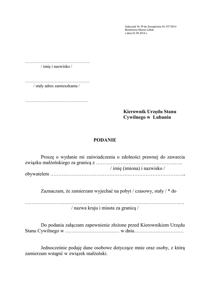 Załącznik Nr 59 do Zarządzenia Nr 197/2014 Burmistrza Miasta Lubań z dnia 01.09.2014 r. ………………………………………. / imię i nazwisko / ………………………………………. / stały adres zamieszkania / ……………………………………… Kierownik Urzędu Stanu Cywilnego w Lubaniu PODANIE Proszę o wydanie mi zaświadczenia o zdolności prawnej do zawarcia związku małżeńskiego za granicą z …………………………………………….. / imię (imiona) i nazwisko / obywatelem ………………………………………………………………………. Zaznaczam, że zamierzam wyjechać na pobyt / czasowy, stały / * do ……………………………………………………………………………………. / nazwa kraju i miasta za granicą / Do podania załączam zapewnienie złożone przed Kierownikiem Urzędu Stanu Cywilnego w …………………………… w dniu………………………… Jednocześnie podaję dane osobowe dotyczące mnie oraz osoby, z którą zamierzam wstąpić w związek małżeński. Dane dotyczące wnioskodawcy Dane dotyczące osoby, z którą zamierzam zawrzeć małżeństwo za granicą 1. Imię (imiona) i nazwisko 2. Nazwisko rodowe (dot. osób, których nazwisko uległo zmianie na skutek uprzednio zawartego małżeństwa lub zmiany administracyjnej) 3. Data i miejsce urodzenia 4. Imiona i nazwiska rodziców oraz nazwisko rodowe matki 5. Stan cywilny (kawaler, panna, wdowiec, wdowa, rozwiedziony/a)** 6. Miejsce zamieszkania /dokładny adres/ 7. Wykształcenie, zawód i miejsce pracy osób zamierzających zawrzeć małżeństwo 8. Zawód i miejsce pracy: a) ojca b) matki 9. Seria i numer dowodu osobistego oraz data i miejsce wystawienia dowodu osobistego obywatela polskiego …………………... /podpis/ *) niepotrzebne skreślić *) dotyczy osób, które już pozostawały w związku małżeńskim
