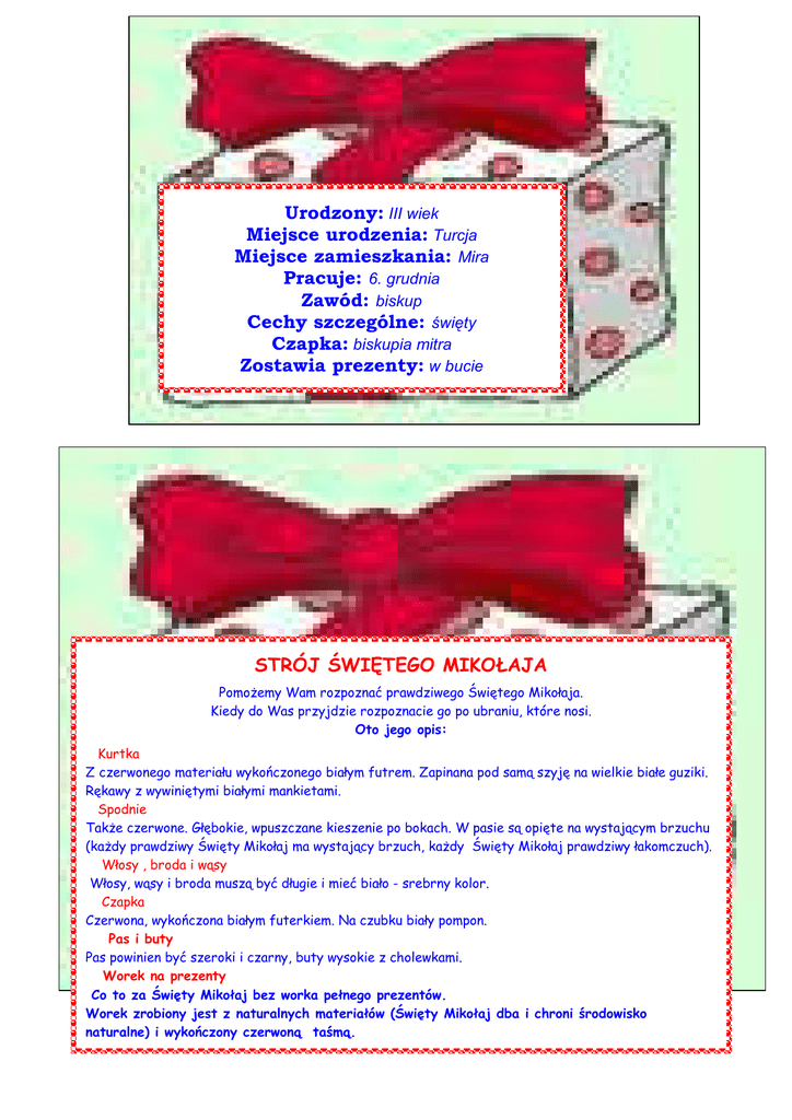 Urodzony: III wiek Miejsce urodzenia: Turcja Miejsce zamieszkania: Mira Pracuje: 6. grudnia Zawód: biskup Cechy szczególne: święty Czapka: biskupia mitra Zostawia prezenty: w bucie STRÓJ ŚWIĘTEGO MIKOŁAJA PomoŜemy Wam rozpoznać prawdziwego Świętego Mikołaja. Kiedy do Was przyjdzie rozpoznacie go po ubraniu, które nosi. Oto jego opis: Kurtka Z czerwonego materiału wykończonego białym futrem. Zapinana pod samą szyję na wielkie białe guziki. Rękawy z wywiniętymi białymi mankietami. Spodnie TakŜe czerwone. Głębokie, wpuszczane kieszenie po bokach. W pasie są opięte na wystającym brzuchu (kaŜdy prawdziwy Święty Mikołaj ma wystający brzuch, kaŜdy Święty Mikołaj prawdziwy łakomczuch). Włosy , broda i wąsy Włosy, wąsy i broda muszą być długie i mieć biało - srebrny kolor. Czapka Czerwona, wykończona białym futerkiem. Na czubku biały pompon. Pas i buty Pas powinien być szeroki i czarny, buty wysokie z cholewkami. Worek na prezenty Co to za Święty Mikołaj bez worka pełnego prezentów. Worek zrobiony jest z naturalnych materiałów (Święty Mikołaj dba i chroni środowisko naturalne) i wykończony czerwoną taśmą.