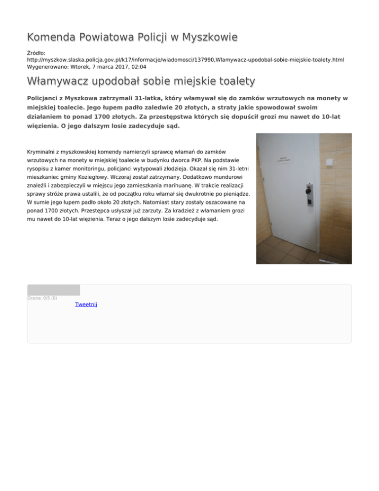 Komenda Powiatowa Policji w Myszkowie Źródło: http://myszkow.slaska.policja.gov.pl/k17/informacje/wiadomosci/137990,Wlamywacz-upodobal-sobie-miejskie-toalety.html Wygenerowano: Wtorek, 7 marca 2017, 02:04 Włamywacz upodobał sobie miejskie toalety Policjanci z Myszkowa zatrzymali 31-latka, który włamywał się do zamków wrzutowych na monety w miejskiej toalecie. Jego łupem padło zaledwie 20 złotych, a straty jakie spowodował swoim działaniem to ponad 1700 złotych. Za przestępstwa których się dopuścił grozi mu nawet do 10-lat więzienia. O jego dalszym losie zadecyduje sąd. Kryminalni z myszkowskiej komendy namierzyli sprawcę włamań do zamków wrzutowych na monety w miejskiej toalecie w budynku dworca PKP. Na podstawie rysopisu z kamer monitoringu, policjanci wytypowali złodzieja. Okazał się nim 31-letni mieszkaniec gminy Koziegłowy. Wczoraj został zatrzymany. Dodatkowo mundurowi znaleźli i zabezpieczyli w miejscu jego zamieszkania marihuanę. W trakcie realizacji sprawy stróże prawa ustalili, że od początku roku włamał się dwukrotnie po pieniądze. W sumie jego łupem padło około 20 złotych. Natomiast stary zostały oszacowane na ponad 1700 złotych. Przestępca usłyszał już zarzuty. Za kradzież z włamaniem grozi mu nawet do 10-lat więzienia. Teraz o jego dalszym losie zadecyduje sąd. Ocena: 0/5 (0) Tweetnij
