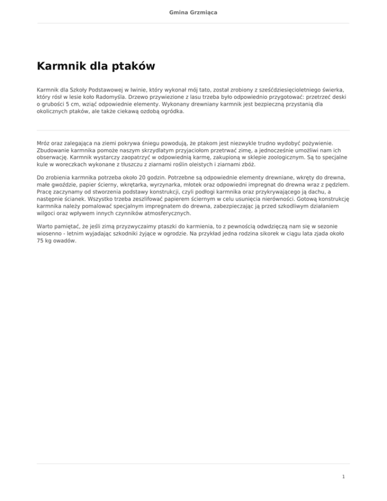 Gmina Grzmiąca Karmnik dla ptaków Karmnik dla Szkoły Podstawowej w Iwinie, który wykonał mój tato, został zrobiony z sześćdziesięcioletniego świerka, który rósł w lesie koło Radomyśla. Drzewo przywiezione z lasu trzeba było odpowiednio przygotować: przetrzeć deski o grubości 5 cm, wziąć odpowiednie elementy. Wykonany drewniany karmnik jest bezpieczną przystanią dla okolicznych ptaków, ale także ciekawą ozdobą ogródka. Mróz oraz zalegająca na ziemi pokrywa śniegu powodują, że ptakom jest niezwykle trudno wydobyć pożywienie. Zbudowanie karmnika pomoże naszym skrzydlatym przyjaciołom przetrwać zimę, a jednocześnie umożliwi nam ich obserwację. Karmnik wystarczy zaopatrzyć w odpowiednią karmę, zakupioną w sklepie zoologicznym. Są to specjalne kule w woreczkach wykonane z tłuszczu z ziarnami roślin oleistych i ziarnami zbóż. Do zrobienia karmnika potrzeba około 20 godzin. Potrzebne są odpowiednie elementy drewniane, wkręty do drewna, małe gwoździe, papier ścierny, wkrętarka, wyrzynarka, młotek oraz odpowiedni impregnat do drewna wraz z pędzlem. Pracę zaczynamy od stworzenia podstawy konstrukcji, czyli podłogi karmnika oraz przykrywającego ją dachu, a następnie ścianek. Wszystko trzeba zeszlifować papierem ściernym w celu usunięcia nierówności. Gotową konstrukcję karmnika należy pomalować specjalnym impregnatem do drewna, zabezpieczając ją przed szkodliwym działaniem wilgoci oraz wpływem innych czynników atmosferycznych. Warto pamiętać, że jeśli zimą przyzwyczaimy ptaszki do karmienia, to z pewnością odwdzięczą nam się w sezonie wiosenno - letnim wyjadając szkodniki żyjące w ogrodzie. Na przykład jedna rodzina sikorek w ciągu lata zjada około 75 kg owadów. 1