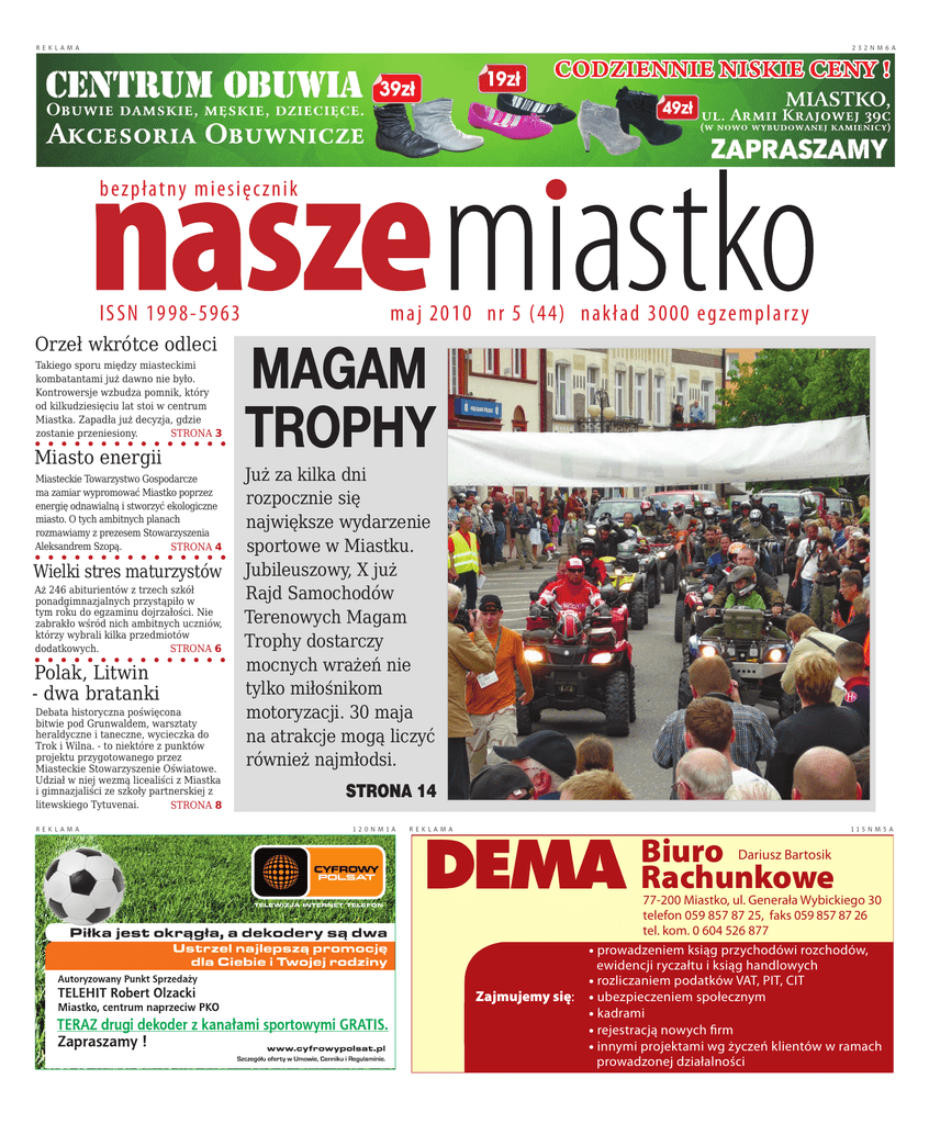 REKLAMA 232NM6A bezpłatny miesięcznik ISSN 1998-5963 Orzeł wkrótce odleci Takiego sporu między miasteckimi kombatantami już dawno nie było. Kontrowersje wzbudza pomnik, który od kilkudziesięciu lat stoi w centrum Miastka. Zapadła już decyzja, gdzie zostanie przeniesiony. STRONA 3 Miasto energii Miasteckie Towarzystwo Gospodarcze ma zamiar wypromować Miastko poprzez energię odnawialną i stworzyć ekologiczne miasto. O tych ambitnych planach rozmawiamy z prezesem Stowarzyszenia Aleksandrem Szopą. STRONA 4 Wielki stres maturzystów Aż 246 abiturientów z trzech szkół ponadgimnazjalnych przystąpiło w tym roku do egzaminu dojrzałości. Nie zabrakło wśród nich ambitnych uczniów, którzy wybrali kilka przedmiotów dodatkowych. STRONA 6 Polak, Litwin - dwa bratanki Debata historyczna poświęcona bitwie pod Grunwaldem, warsztaty heraldyczne i taneczne, wycieczka do Trok i Wilna. - to niektóre z punktów projektu przygotowanego przez Miasteckie Stowarzyszenie Oświatowe. Udział w niej wezmą licealiści z Miastka i gimnazjaliści ze szkoły partnerskiej z litewskiego Tytuvenai. STRONA 8 REKLAMA maj 2010 nr 5 (44) nakład 3000 egzemplar z y MAGAM TROPHY Już za kilka dni rozpocznie się największe wydarzenie sportowe w Miastku. Jubileuszowy, X już Rajd Samochodów Terenowych Magam Trophy dostarczy mocnych wrażeń nie tylko miłośnikom motoryzacji. 30 maja na atrakcje mogą liczyć również najmłodsi. STRONA 14 120NM1A DEMA REKLAMA Zajmujemy się: 115NM5A Biuro Dariusz Bartosik Rachunkowe 77-200 Miastko, ul. Generała Wybickiego 30 telefon 059 857 87 25, faks 059 857 87 26 tel. kom. 0 604 526 877 • prowadzeniem ksiąg przychodówi rozchodów, ewidencji ryczałtu i ksiąg handlowych • rozliczaniem podatków VAT, PIT, CIT • ubezpieczeniem społecznym • kadrami • rejestracją nowych firm • innymi projektami wg życzeń klientów w ramach prowadzonej działalności NR 5 (44) • MAJ 2010 Puls miasta Komunikacyjne kłopoty W SKRÓCIE Młodzi posłowie z Miastka Wiktoria Dykyj, Ewelina Rycerz i Tomasz Mendyka – troje uczniów III klasy Gimnazjum im. Jana Pawła II w Miastku zakwalifikowało się do XVI Sesji Sejmu Dzieci i Młodzieży w Warszawie. Wcielą się oni w rolę posłów i zasiądą w miejscach, gdzie obradują dorośli parlamentarzyści. - Trzy mandaty zdobyte przez uczniów naszej szkoły to prawdziwy sukces – nie ukrywa Kazimierz Kowalewski, dyrektor szkoły. - Opiekunką naszych „parlamentarzystów” jest Lidia Rekowska. Obrady sejmu dzieci i młodzieży tradycyjnie odbywają się 1 czerwca. pif REKLAMA 1116NM2A REKLAMA 1081NM1A Bez przystanku w Miastku Mieszkańcy Miastka, którzy mają rodzinę na południu Polski, już teraz obawiają się wakacji i planowanego przyjazdu najbliższych. Główny powód to problemy komunikacyjne. Jeśli bliscy nie mają samochodu, bądź też wolą poruszać się środkami komunikacji publicznej, mogą mieć spory kłopot. - Jeszcze kilka lat temu wszystko było w porządku – mówi mieszkanka Miastka. - Moja rodzina z Dolnego Śląska, która co roku przyjeżdża do nas w okresie wakacji, po prostu wsiadała w autobus i wysiadała w Miastku. Nie było z tym żadnych problemów. Przed rokiem spotkała ich jednak niemiła niespodzianka. Gdy próbowali wsiąść do „słupskiego” autobusu w Wałbrzychu i kupić bilet do Miastka, kierowca powiedział im, że nie ma takiej możliwości, gdyż autobus nie zatrzymuje się w Miastku. Nie pomogły prośby o zrozumienie, bliscy przyjechali do nas później – podróżując z przesiadkami. Zaskoczony taką sytuacją jest Jan Gajo, sekretarz Urzędu Miejskiego w Miastku. - Mogę tylko powiedzieć, że na pewno będziemy interweniowali w tej sprawie – zapewnia Jan Gajo. - Zobaczymy, być może uda się przewoźnika nakłonić do zatrzymywania się w Miastku. To zresztą nie jedyny problem z przewoźnikami jaki mamy na terenie naszej Fot. APR-SAS 2 W tym roku turyści z Dolnego Śląska korzystający z połączeń autobusowych mogą mieć problemy z bezpośrednim dostaniem się do Miastka. gminy. PKS-y to spółki kierujące się prawami rynku, liczy się dla nich jedynie rachunek ekonomiczny. Stąd też kłopoty, chociażby związane z dowozem uczniów do szkół. Nasze apele nie zawsze przynoszą pozytywne efekty. W tym przypadku zatrzymywanie się autobusu z Kłodzka nie będzie w ogóle możliwe. Tego połączenia nie będzie bowiem w rozkładzie jazdy. Zamiast niego słupski PKS uruchomi połączenie do Gliwic. Autobus będzie jeździł przez Wrocław i Opole. Jeśli ktoś mieszkający w okolicach Wałbrzycha chciałby dotrzeć do Miastka, musiałby wsiąść w autobus we Wrocławiu, bądź też dojechać do Jeleniej Góry i stamtąd wyruszyć autobusem w kierunku Słupska. - Autobus z Jeleniej Góry zatrzymuje się w Miastku – mówi Ilona Słaby, rzecznik słupskiego PKS. - Ktoś, kto chciałby dojechać nim nie tylko do Miastka, ale na przykład do Trzebielina, nie będzie miał z tym kłopotów. Piotr Furtak Felieton parlamentarzysty Podpis, na który czekałem Wydawca: Redaktor naczelny: Redaktor prowadzący: Redakcja: Sprzedaż reklam: Promocja: Kolportaż: Projekt graficzny: Druk: AG Media ul. Braci Gierymskich 1, 76-200 Słupsk tel. 059 848 51 50 fax 059 848 51 51 e-mail: [email protected] Arkadiusz Gryko Roma Linke tel. 059 727 34 16 e-mail: [email protected] kierownik redakcji Aleksandra Christyniuk tel. 059 727 34 06 e-mail: [email protected] dyrektor działu sprzedaży Ryszard Kamała tel. 059 727 34 06 e-mail: [email protected] dyrektor Agencji Reklamowej AG Media Anna Pruszak tel. 059 848 51 50 specjalista ds. kolportażu Artur Sobolewski e-mail: [email protected] Bartosz Soiński kierownik studia graficznego [email protected] Polskapresse Oddział Poligrafia ul. Połęże 3, 80-720 Gdańsk Za treść reklam Wydawca nie odpowiada. Redakcja nie zwraca tekstów nie zamówionych. W przypadku ich wykorzystania zastrzega sobie też prawo do ich s