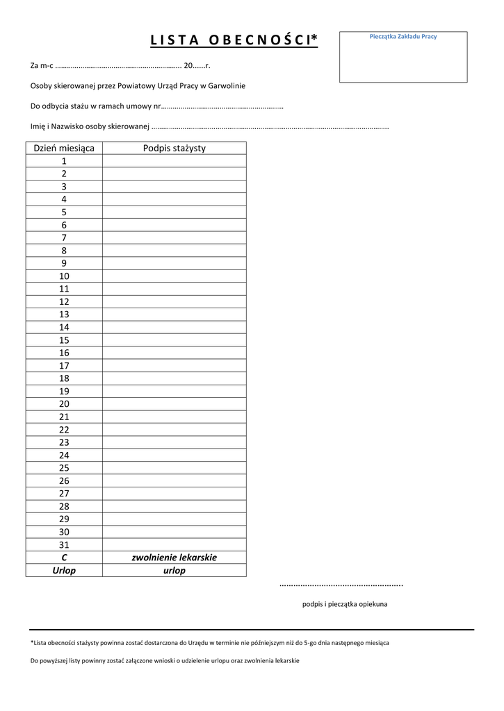 L I S T A O B E C N O Ś C I* Pieczątka Zakładu Pracy Za m-c ……………………………………………………….. 20......r. Osoby skierowanej przez Powiatowy Urząd Pracy w Garwolinie Do odbycia stażu w ramach umowy nr……………………………………………………… Imię i Nazwisko osoby skierowanej ………………………………………………………………………………………………………….. Dzień miesiąca 1 2 3 4 5 6 7 8 9 10 11 12 13 14 15 16 17 18 19 20 21 22 23 24 25 26 27 28 29 30 31 C Urlop Podpis stażysty zwolnienie lekarskie urlop …………………………………………….. podpis i pieczątka opiekuna *Lista obecności stażysty powinna zostać dostarczona do Urzędu w terminie nie późniejszym niż do 5-go dnia następnego miesiąca Do powyższej listy powinny zostać załączone wnioski o udzielenie urlopu oraz zwolnienia lekarskie Nazwisko i Imię …………………………………………………. ……………………………………., dnia……………………. Adres ………………………………………………………………… ………………………………………………………………………….. PESEL ………………………………………………………………… OŚWIADCZENIE Pouczony o odpowiedzialności karnej z art. 233§ 1 kodeksu Karnego za składanie fałszywych zeznań oświadczam, że: W miesiącu ………………………………………………… 20…….roku: 1. Nie podjąłem (am) zatrudnienia, innej pracy zarobkowej. 2. Nie posiadam wpisu do ewidencji działalności gospodarczej. 3. Nie uzyskałem (am) przychodu w wysokości przekraczającej połowy minimalnego wynagrodzenia za pracę z wyłączeniem przychodów od środków pieniężnych zgromadzonych na rachunkach bankowych. 4. Nie podjąłem (am) nauki w szkole w systemie dziennym. 5. Jestem zdolny (a) i gotowy (a) do podjęcia zatrudnienia. 6. Nie nabyłem (am) prawa do emerytury, renty z tytułu niezdolności do pracy, renty szkoleniowej, renty socjalnej, renty rodzinnej w wysokości przekraczającej połowę minimalnego wynagrodzenia za pracę. 7. Nie nabyłem (am) prawa do zasiłku stałego na podstawie przepisów o pomocy społecznej. 8. Nie nabyłem (am) prawa do świadczenia pielęgnacyjnego lub dodatku do zasiłku rodzinnego z tytułu samotnego wychowywania dziecka i utraty prawa do zasiłku. 9. Moje dane osobowe, które podałem (am) w dniu rejestracji w karcie rejestracyjnej nie uległy zmianie. ………………………………………….. (czytelny podpis osoby bezrobotnej) W przypadku przeciwnej odpowiedzi na którykolwiek z punktów należy natychmiast zgłosić tą okoliczność do Powiatowego Urzędu Pracy w Garwolinie pok. 15 tel. 025 682 36 80 UWAGA ! Oświadczenie należy składać za miesiąc poprzedni, np. oświadczenie wystawione w miesiącu styczniu 2010r. dotyczy dochodów osiągniętych w miesiącu grudniu 2009r.