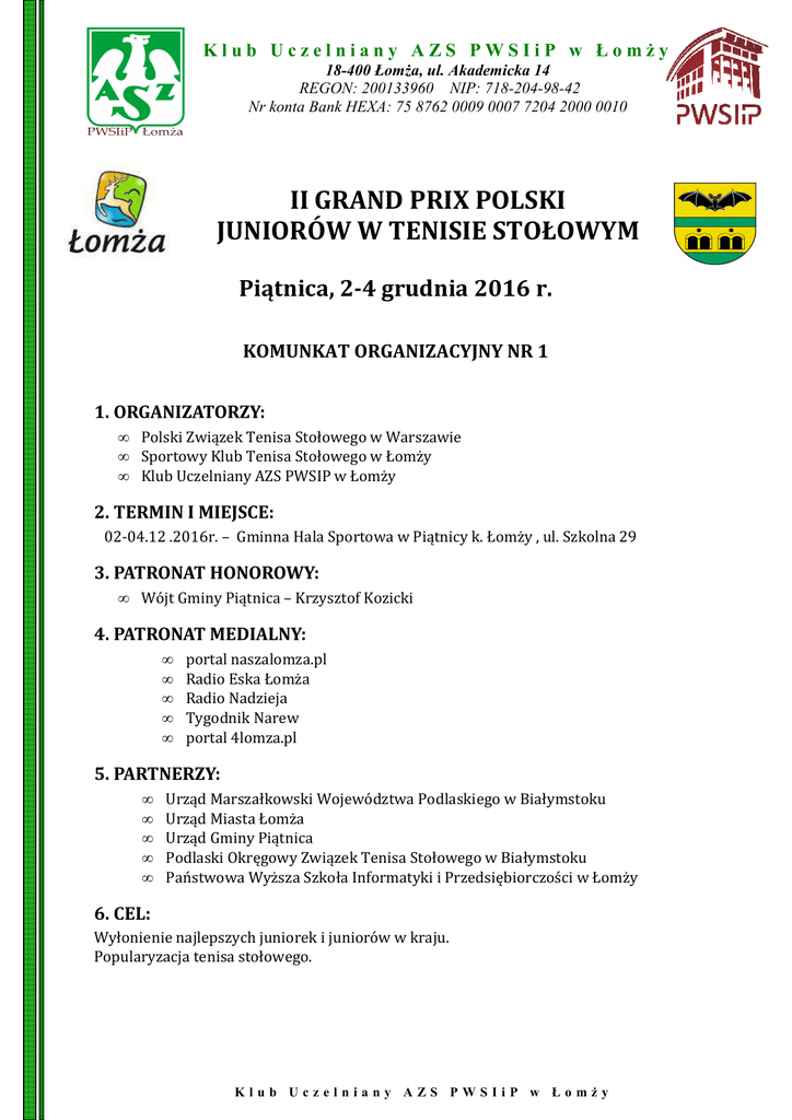 Klub Uczelniany AZS PWSIiP w Łomży 18-400 Łomża, ul. Akademicka 14 REGON: 200133960 NIP: 718-204-98-42 Nr konta Bank HEXA: 75 8762 0009 0007 7204 2000 0010 II GRAND PRIX POLSKI JUNIORÓW W TENISIE STOŁOWYM Piątnica, 2-4 grudnia 2016 r. KOMUNKAT ORGANIZACYJNY NR 1 1. ORGANIZATORZY: • Polski Związek Tenisa Stołowego w Warszawie • Sportowy Klub Tenisa Stołowego w Łomży • Klub Uczelniany AZS PWSIP w Łomży 2. TERMIN I MIEJSCE: 02-04.12 .2016r. – Gminna Hala Sportowa w Piątnicy k. Łomży , ul. Szkolna 29 3. PATRONAT HONOROWY: • Wójt Gminy Piątnica – Krzysztof Kozicki 4. PATRONAT MEDIALNY: • • • • • portal naszalomza.pl Radio Eska Łomża Radio Nadzieja Tygodnik Narew portal 4lomza.pl 5. PARTNERZY: • • • • • Urząd Marszałkowski Województwa Podlaskiego w Białymstoku Urząd Miasta Łomża Urząd Gminy Piątnica Podlaski Okręgowy Związek Tenisa Stołowego w Białymstoku Państwowa Wyższa Szkoła Informatyki i Przedsiębiorczości w Łomży 6. CEL: Wyłonienie najlepszych juniorek i juniorów w kraju. Popularyzacja tenisa stołowego. Klub Uczelniany AZS PWSIiP w Łomży Klub Uczelniany AZS PWSIiP w Łomży 18-400 Łomża, ul. Akademicka 14 REGON: 200133960 NIP: 718-204-98-42 Nr konta Bank HEXA: 75 8762 0009 0007 7204 2000 0010 7. PROGRAM ZAWODÓW: Piątek 02.12.2016r. - Turniej eliminacyjny godz. 12.00 Sobota 02.12.2016r. godz. 9.00 godz. 9.15 po południu - Otwarcie zawodów - Turniej grupowy - Turniej główny oraz Turniej Pocieszenia Niedziela 04.12.2016r. godz. 9.00 godz. 13.00 - Turniej Główny oraz gra o miejsca - Uroczyste zakończenie turnieju ( ceremonia dekoracji) Szczegółowy program zwodów zostanie opublikowany na stronie PZTS. 8. ZGŁOSZENIA, WPISOWE : Wypełnioną kartę zgłoszeniową do turnieju wraz z potwierdzeniem dokonania opłaty wpisowego w wysokości 30zł na konto: Klub Uczelniany AZS PWSIP w Łomży Ul. Akademicka 14 18-400 Łomża Nr konta 75 8762 0009 0007 7204 2000 0010 (w tytule proszę podać nazwiska zawodników, których wpłata dotyczy) Prosimy przesłać w nieprzekraczalnym terminie do dnia 29.11.2016r. do godz. 21.00 na adresy e-mailowe: • Polski Związek Tenisa Stołowego w Warszawie - Marek Przybyłowicz e-mail: [email protected] Tel.: 607-922-249 • Wacław Tarnacki e-mail: [email protected] Tel.: 606-872-482 9. NOCLEGI: Rezerwacja zakwaterowania bezpośrednio w Hotelach na hasło „ TENIS STOŁOWY JUNIORZY” • Motel „ZACISZE” w Piątnicy (300m od Hali Sportowej) - cena noclegu ze śniadaniem 70zł od osoby, 18-421 Piątnica ul. Stawiskowska 51 , (pokoje 1, 2 i 3 osobowe). Do pokoju 1-osobowego dopłata 30zł. email: [email protected] , Tel. 086 216 52 53 • Hotel „BELFORT” w Piątnicy (500m od Hali Sportowej) – cena noclegu ze śniadaniem 80 zł od osoby, 18-421 Piątnica ul. Stawiskowska 32 , (pokoje 2 i 3 osobowe). Do pokoju 1-osobowego dopłata 30zł. email: [email protected] , Tel. 086 215 49 00, fax. 086 215 49 01 Klub Uczelniany AZS PWSIiP w Łomży Klub Uczelniany AZS PWSIiP w Łomży 18-400 Łomża, ul. Akademicka 14 REGON: 200133960 NIP: 718-204-98-42 Nr konta Bank HEXA: 75 8762 0009 0007 7204 2000 0010 • Hotel „GROMADA” w Łomży (1,5 km od Hali Sportowej) - cena noclegu ze śniadaniem 70zł od osoby , 18-400 Łomża ul. Rządowa 1, (pokoje 2 osobowe). Dopłata do pokoju 1-osobowego 30zł. email: [email protected] , Tel. 086 216 54 51 • Hostel „MOSIR” w Łomży (700m od Hali Sportowej) - cena noclegu bez śniadania w pokoju 2, 3 – osobowym 40zł od osoby, w pokoju 1-osobowym 55 zł od osoby, 18-400 Łomża, ul. Zjazd 18. Rezerwację do Hostelu MOSIR należy przesyłać na adres mailowy: [email protected] Wacław Tarnacki tel. 606-872-482 10. WYŻYWIENIE: • • • • Obiady w sobotę (dn. 03.12.2016r.) i niedzielę (dn. 04.12.2016r.) w cenie 20zł od osoby można zamówić u Organizatora w terminie do 29.11.2016r. Obiady będą wydawane w stołówce obok Hali Gry. Uczestnicy zakwaterowani w Hostelu MOSIR mogą zamówić śniadania i kolacje w cenie 15 zł od osoby. Uczestnicy zakwaterowani w innych Hotelach zamawiają kolacje w własnym zakresie. 11. NAGRODY: Za miejsca 1-4 puchary, dyplomy i nagrody rzeczowe, za miejsca 5-8 dyplomy. 12. SPRZĘT SPORTOWY: Stoły Andro z atestem ITTF, piłeczki ANDRO *** 40+ (białe, plastikowe). 13. UWAGA: Osoby zakwaterowane w Hostelu MOSIR po przyjeździe zgłaszają się do Biura Zawodów (Hala Sportowa w Piątnicy) w celu odebrania skierowania na noclegi. Biuro zawodów czynne w piątek 02.12.2016r. od godz. 11.00 oraz sobota i niedziela podczas trwania zawodów. Za Organizatorów, Wacław Tarnacki tel. 606-872-482 Klub Uczelniany AZS PWSIiP w Łomży
