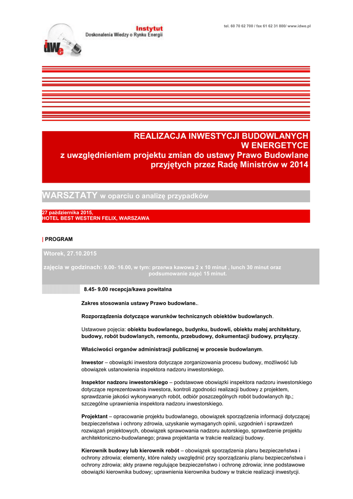 tel. 60 70 62 700 / fax 61 62 31 800/ www.idwe.pl REALIZACJA INWESTYCJI BUDOWLANYCH W ENERGETYCE z uwzględnieniem projektu zmian do ustawy Prawo Budowlane przyjętych przez Radę Ministrów w 2014 WARSZTATY w oparciu o analizę przypadków 27 października 2015, HOTEL BEST WESTERN FELIX, WARSZAWA | PROGRAM Wtorek, 27.10.2015 zajęcia w godzinach: 9.00- 16.00, w tym: przerwa kawowa 2 x 10 minut , lunch 30 minut oraz podsumowanie zajęć 15 minut. 8.45- 9.00 recepcja/kawa powitalna Zakres stosowania ustawy Prawo budowlane.. Rozporządzenia dotyczące warunków technicznych obiektów budowlanych. Ustawowe pojęcia: obiektu budowlanego, budynku, budowli, obiektu małej architektury, budowy, robót budowlanych, remontu, przebudowy, dokumentacji budowy, przyłączy. Właściwości organów administracji publicznej w procesie budowlanym. Inwestor – obowiązki inwestora dotyczące zorganizowania procesu budowy, możliwość lub obowiązek ustanowienia inspektora nadzoru inwestorskiego. Inspektor nadzoru inwestorskiego – podstawowe obowiązki inspektora nadzoru inwestorskiego dotyczące reprezentowania inwestora, kontroli zgodności realizacji budowy z projektem, sprawdzanie jakości wykonywanych robót, odbiór poszczególnych robót budowlanych itp.; szczególne uprawnienia inspektora nadzoru inwestorskiego. Projektant – opracowanie projektu budowlanego, obowiązek sporządzenia informacji dotyczącej bezpieczeństwa i ochrony zdrowia, uzyskanie wymaganych opinii, uzgodnień i sprawdzeń rozwiązań projektowych, obowiązek sprawowania nadzoru autorskiego, sprawdzenie projektu architektoniczno-budowlanego; prawa projektanta w trakcie realizacji budowy. Kierownik budowy lub kierownik robót – obowiązek sporządzenia planu bezpieczeństwa i ochrony zdrowia; elementy, które należy uwzględnić przy sporządzaniu planu bezpieczeństwa i ochrony zdrowia; akty prawne regulujące bezpieczeństwo i ochronę zdrowia; inne podstawowe obowiązki kierownika budowy; uprawnienia kierownika budowy w trakcie realizacji inwestycji. tel. 60 70 62 700 / fax 61 62 31 800/ www.idwe.pl Przygotowanie inwestycji. Tytuł prawny do dysponowania nieruchomością (omówienie ogólne obligacyjnych i rzeczowych tytułów prawnych) – prawo własności, współwłasność, użytkowanie wieczyste, ograniczone prawa rzeczowe. Uzyskanie pozwolenia na budowę – obowiązek jego uzyskania, wyjątki od powyższego obowiązku, strony postępowania w sprawie wydania pozwolenia na budowę, zakres pozwolenia na budowę, wniosek o pozwolenie na budowę i jego podstawowe załączniki, proces odwoławczy, nieobligatoryjne elementy decyzji o pozwoleniu na budowę, wygaśnięcie decyzji o pozwoleniu na budowę. Budowa przyłączy. Projekt budowlany – kryteria powinien spełniać projekt budowlany, przepisy techniczno – budowlane dotyczące bezpieczeństwa, ochrony przed hałasem, warunków użytkowych, odstępstwa od przepisów techniczno – budowlanych, osoby uprawnione do sporządzenia projektu budowlanego. o szczególne elementy projektu budowlanego (art. 34 prawa budowlanego); budowa przyłączy: sporządzenie planu sytuacyjnego, energetycznego dotyczące budowy przyłączy, przepisy prawa oświadczenia o warunkach przyłączenia obiektu do sieci, Zgłoszenie robót budowlanych – działania wymagające zgłoszenia, treść zgłoszenia, obligatoryjne załączniki do zgłoszenia, termin dokonania zgłoszenia, sprzeciw organu. Budowa przyłączy jako element prac przygotowawczych na terenie budowy. Możliwości odstępstw od projektu budowlanego i warunków pozwolenia na budowę – dopuszczalność tego rodzaju odstępstw, procedura dotycząca odstąpienia od zatwierdzonego projektu budowlanego lub innych warunków pozwolenia na budowę. Obowiązki informacyjne – zawiadomienie o zamierzonym terminie rozpoczęcia prac budowlanych; zawiadomienia o zmianie kierownika budowy (robót), inspektora nadzoru inwestorskiego, projektanta. Rozpoczęcie budowy oraz jej realizacja – chwila rozpoczęcia budowy, prace przygotowawcze, szczególne obowiązki kierownika budowy (robót), dziennik budowy, obowiązek przechowywania dokumentów dotyczących prowadzonych prac. Zakończenie inwestycji - pozwolenie na użytkowanie, zawiadomienie o zakończeniu robót i zamiarze przystąpienia do użytkowania (dokumenty załączane do zawiadomienia, potwierdzenia odbioru wykonanych przyłączy), zmiana sposobu użytkowania. tel. 60 70 62 700 / fax 61 62 31 800/ www.idwe.pl Realizacja inwestycji budowlanych w energetyce… | PROWADZĄCY ZAJĘCIA mec. Radosław Skowron absolwent Wydziału Prawa i Administracji Uniwersytetu Jagiellońskiego w Krakowie stypendysta Uniwersytetu Roberta Schumana w Strasburgu, gdzie ukończył studia na Międzynarodowym Wydziale Prawa Porównawczego absolwent Szkoły Prawa Francuskiego Wydziału Prawa, Ekonomii i Zarządzania Uniwersytetu w Orleanie absolwent studiów podyplomowych z zakresu prawa autorskiego i własności przemysłowej w Instytucie Własności Przemysłowej Uniwersytetu Jagiellońskiego w Krakowie doktorant w Instytucie Nauk Prawnych Polskiej Akademii Nauk jego naukowe zainteresowania koncentrują się na współczesnych stosunkach przemysłowych autor licznych publikacji w prawniczej prasie codziennej oraz w krajowych i zagranicznych periodykach naukowych, ekspert Komisji Europejskiej w ramach VI edycji Programu Ramowego specjalizuje się w doradztwie na rzecz inwestorów zagranicznych (przejęcia, podziały, fuzje i inne formy restrukturyzacji) oraz w analizie prawnej podmiotów gospodarczych, ze szczególnym uwzględnieniem rynku nieruchomości Ekspert w zakresie doradztwa przy inwestycjach w energetyce: doradztwo w zakresie zabezpieczenia tytułów prawnych pod inwestycje energetyczne; doradztwo w zakresie lokowania urządzeń przesyłowych; doradztwo w zakresie: zmiany klasyfikacji gruntów / zmiany przeznaczenia gruntów rolnych i leśnych / wyłączeń z produkcji rolnej; doradztwo w zakr